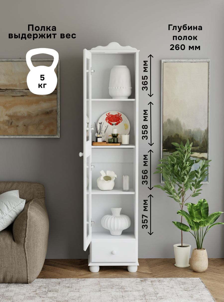 Шкаф-витрина Бритта из массива сосны – это стильный и функциональный сервант шкаф в гостиную или буфет, шкаф для кухни, который станет элегантным дополнением вашего интерьера. Этот шкаф с витриной в гостиную выполнен в скандинавском стиле, с декоративным карнизом и стеклянной дверью, что делает его идеальным решением для создания уникальной атмосферы в любом помещении. Его цвет (белый воск) серванта будет хорошо смотреться в самых различных интерьерах. Прекрасно подойдет для стилей интерьера таких как скандинавский, минимализм, классический, русский и эко-стиль.