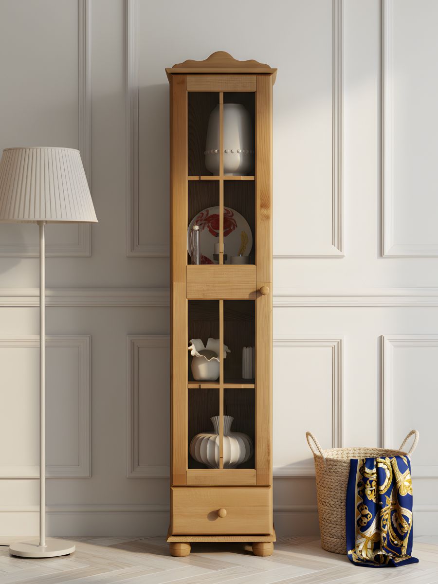 Шкаф-витрина изготовлен из натурального дерева сосны от белорусского производителя мебели "Диприз". Шкаф для посуды сервант идет без отделки и полностью готов под покраску. Сервант шкаф для посуды отличается элегантным современным дизайном, который легко сочетается с любым стилем и декором! Двери серванта оснащены стеклянными вставками. На деревянных полках найдут свое место различные скульптуры и книги, также можно разместить стаканы, чашки и другую посуду, так и для домашней библиотеки или личных вещей. Шкаф книжный будет отлично смотреться в вашем загородном доме. Материал задней стенки буфета витрины - ДВП золотой крафт, дно ящика - ДВП белое, остальное - сосна. Толщина дерева двери и фасада ящика - 18мм, остальное - 14мм. Комплектация шкафа витрины для посуды составляет: 4 полки и 1 ящик с деревянными направляющими.