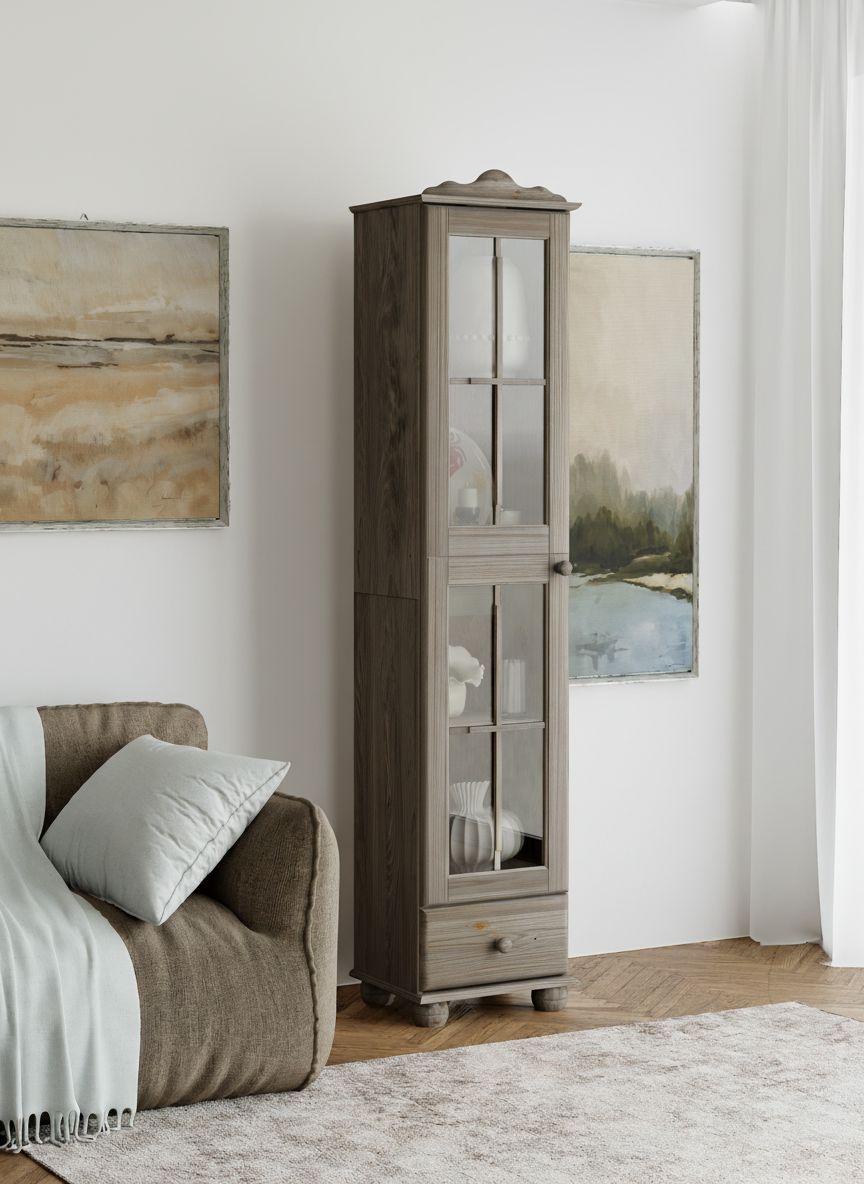 Шкаф-витрина изготовлен из натурального дерева сосны от белорусского производителя мебели "Диприз". Шкаф для посуды сервант имеет окраску черный бейц. Сервант шкаф для посуды отличается элегантным современным дизайном, который легко сочетается с любым стилем и декором! Двери серванта оснащены стеклянными вставками. На деревянных полках найдут свое место различные скульптуры и книги, также можно разместить стаканы, чашки и другую посуду, так и для домашней библиотеки или личных вещей. Шкаф книжный будет отлично смотреться в вашем загородном доме. Материал задней стенки буфета витрины - ДВП, дно ящика - ДВП белое, остальное - сосна. Толщина дерева двери и фасада ящика - 18 мм, остальное - 14 мм. Комплектация шкафа витрины для посуды составляет: 4 полки и 1 ящик с деревянными направляющими.