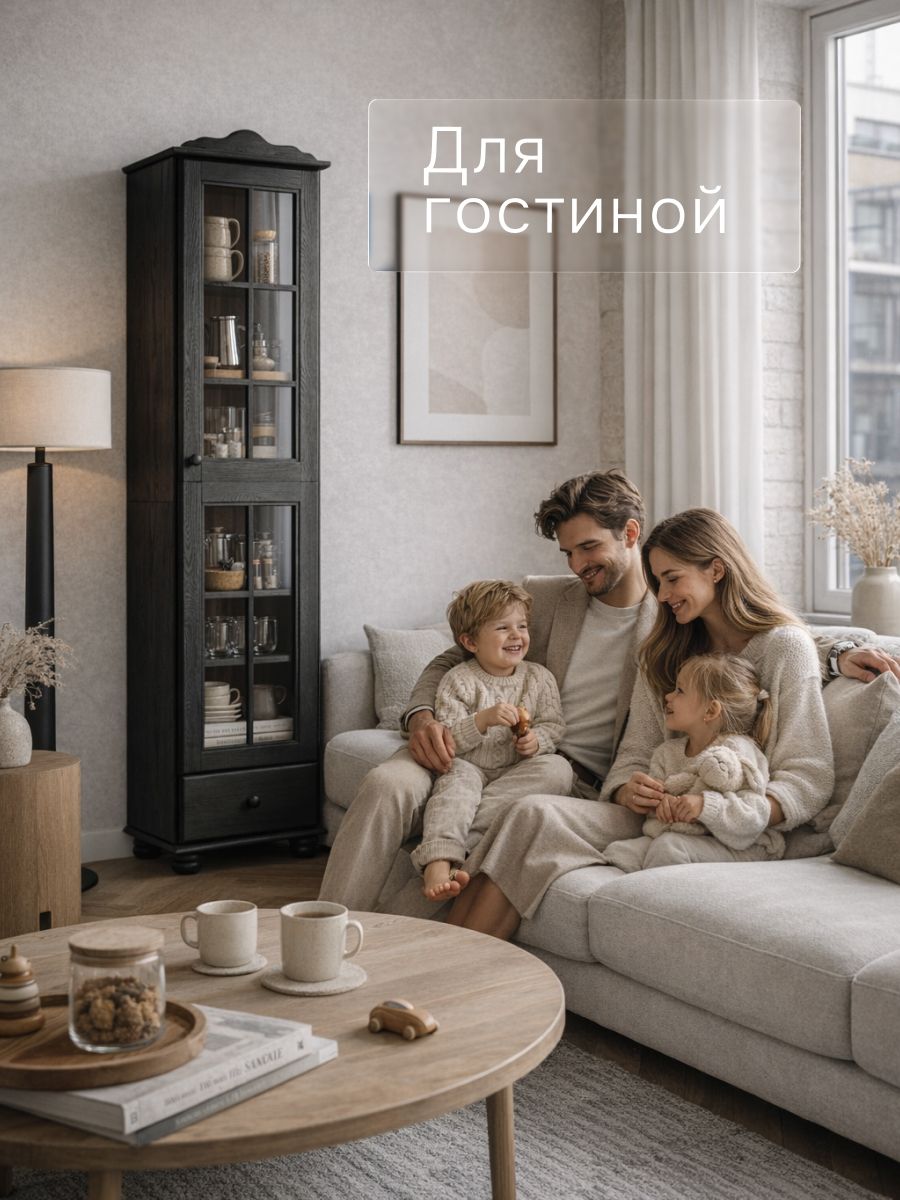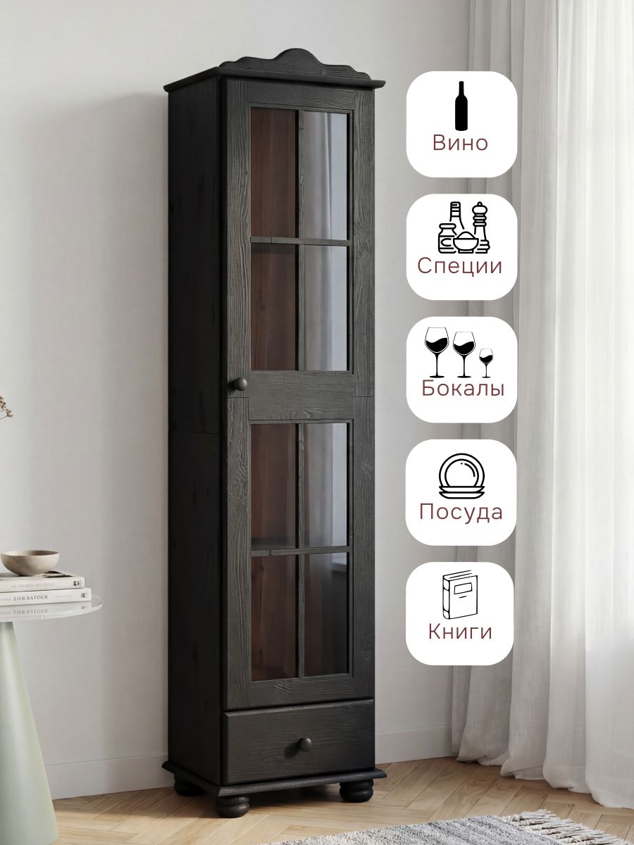 Шкаф-витрина изготовлен из натурального дерева сосны от белорусского производителя мебели "Диприз". Шкаф для посуды сервант имеет окраску черный бейц. Сервант шкаф для посуды отличается элегантным современным дизайном, который легко сочетается с любым стилем и декором! Двери серванта оснащены стеклянными вставками. На деревянных полках найдут свое место различные скульптуры и книги, также можно разместить стаканы, чашки и другую посуду, так и для домашней библиотеки или личных вещей. Шкаф книжный будет отлично смотреться в вашем загородном доме. Материал задней стенки буфета витрины - ДВП, дно ящика - ДВП белое, остальное - сосна. Толщина дерева двери и фасада ящика - 18 мм, остальное - 14 мм. Комплектация шкафа витрины для посуды составляет: 4 полки и 1 ящик с деревянными направляющими.