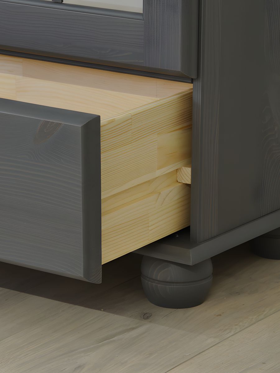 Шкаф-витрина оснащен стеклянными вставками в дверях, что позволяет красиво демонстрировать посуду, стаканы, чашки или другие предметы, а также создать уютную атмосферу в вашем доме. Этот сервант идеально подходит для хранения не только посуды, но и книг или личных вещей благодаря наличию 4 деревянных полок и 1 ящика с деревянными направляющими. Материал задней стенки — ДВП золотой крафт, дно ящика — ДВП белое, остальное — сосна. Толщина дерева в дверях и фасаде ящика — 18 мм, остальных деталей — 14 мм. Размер ящика — 663×246×142,8 мм.