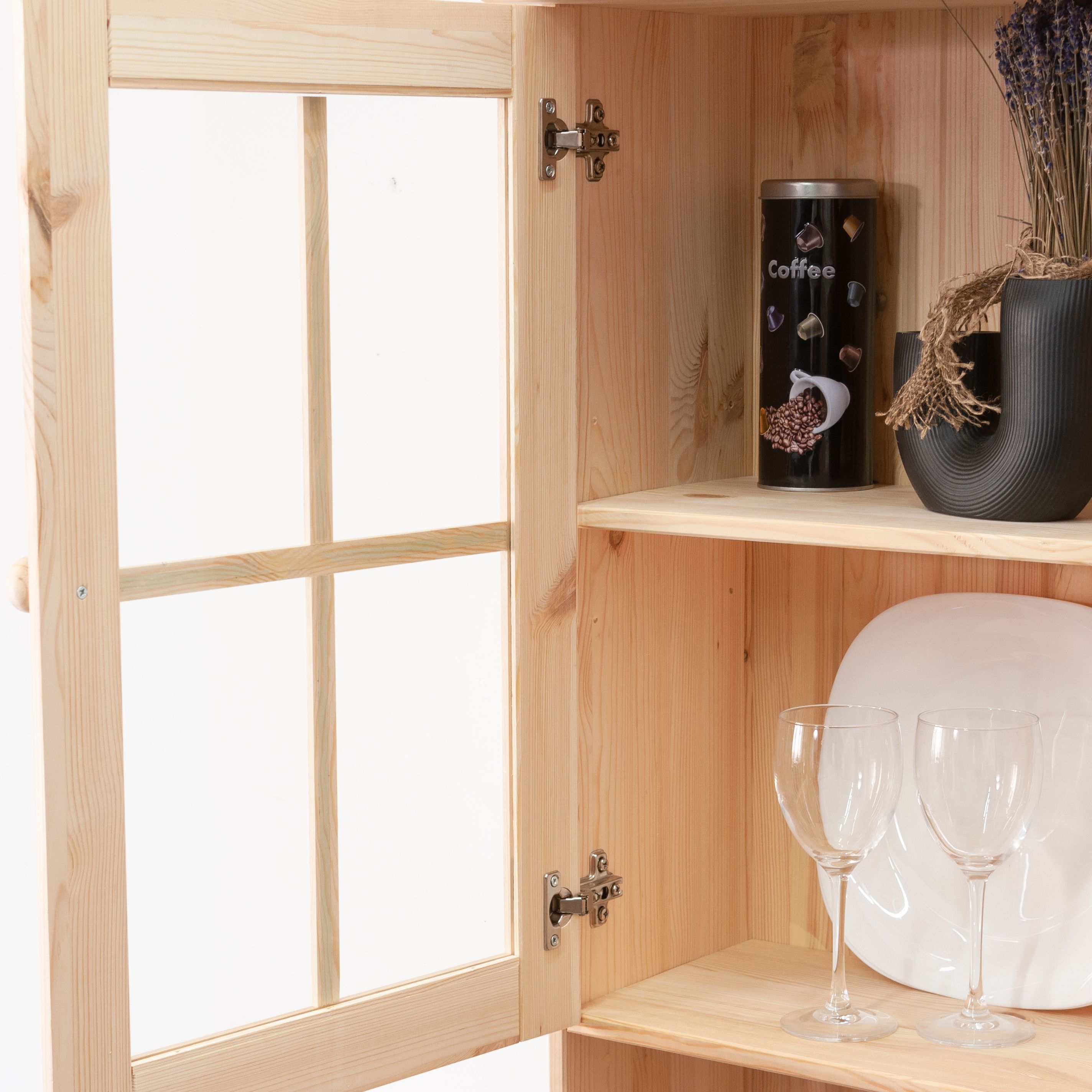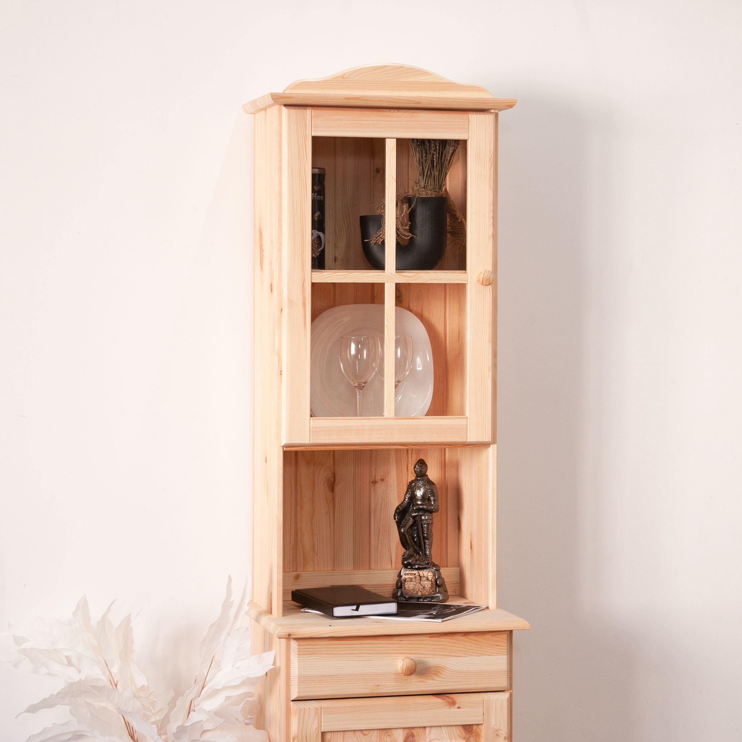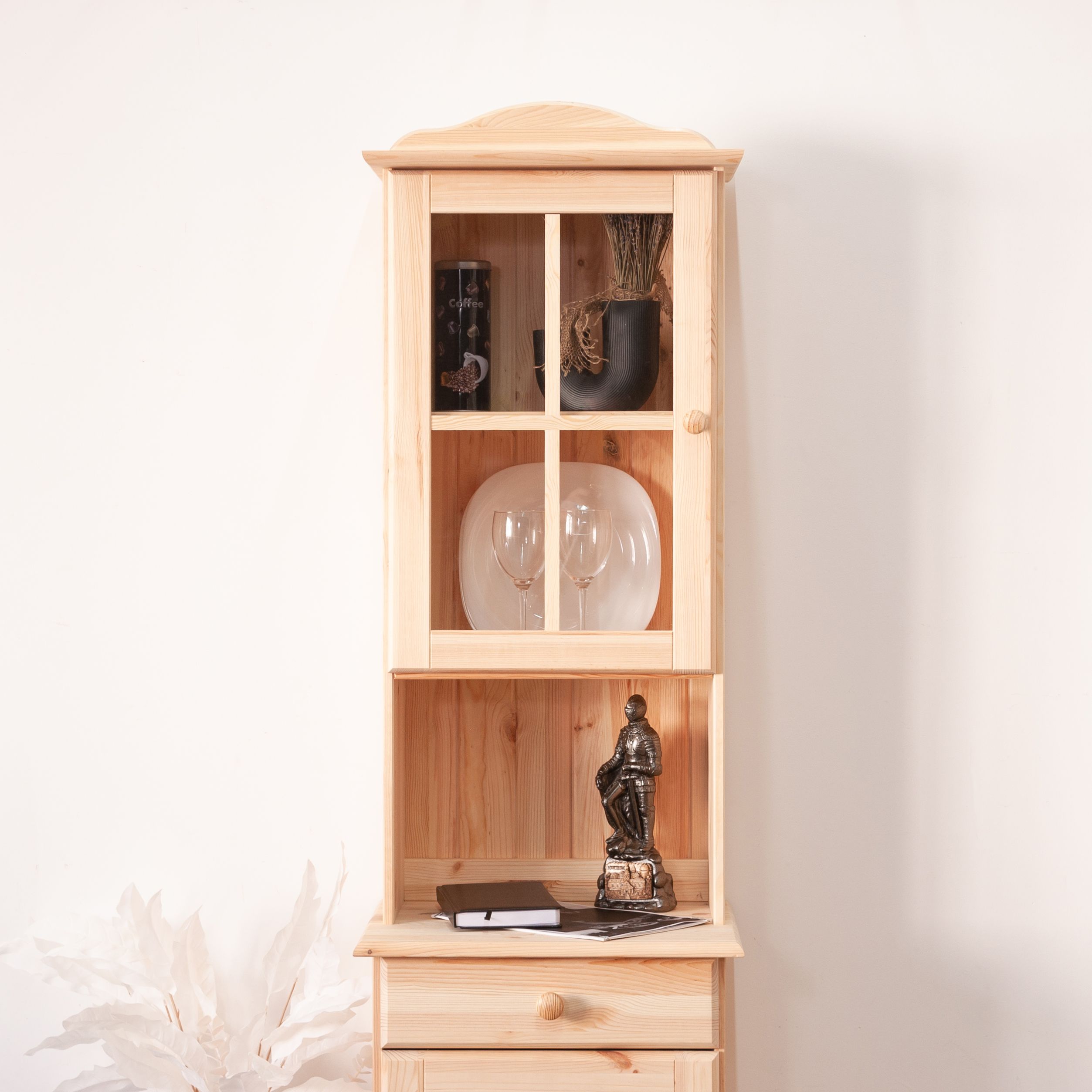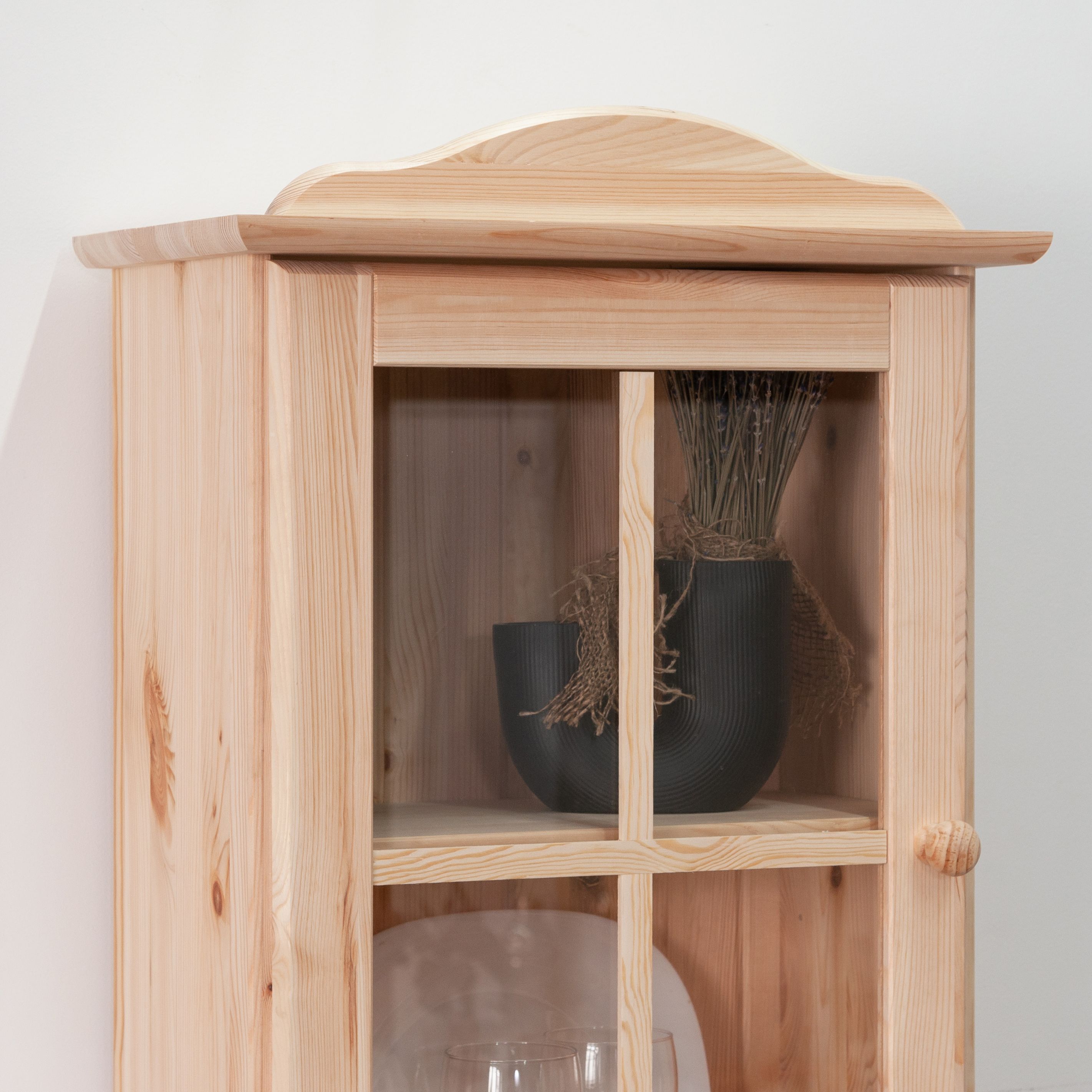 Шкаф из натурального массива сосны в скандинавском стиле с декоративным карнизом и стеклянной дверью создаст атмосферу уюта и элегантности в вашем интерьере.