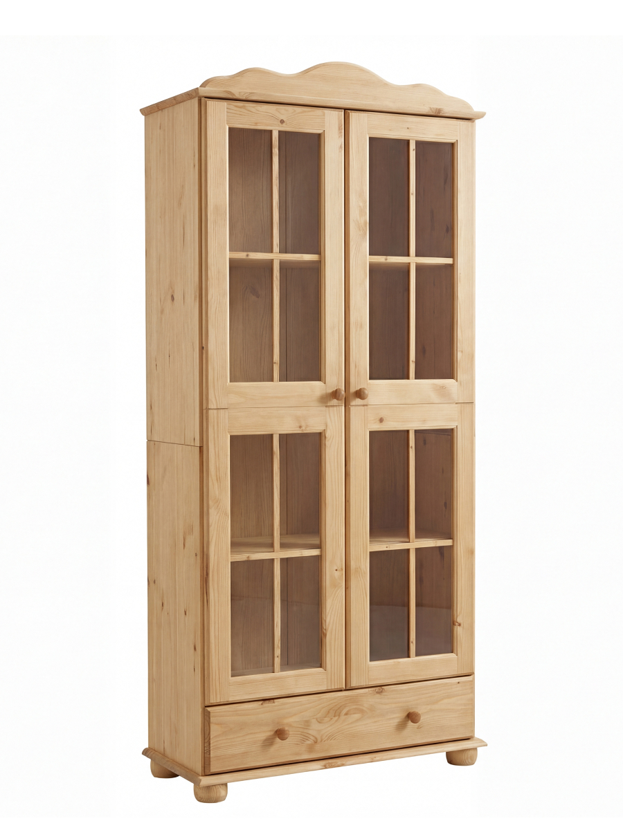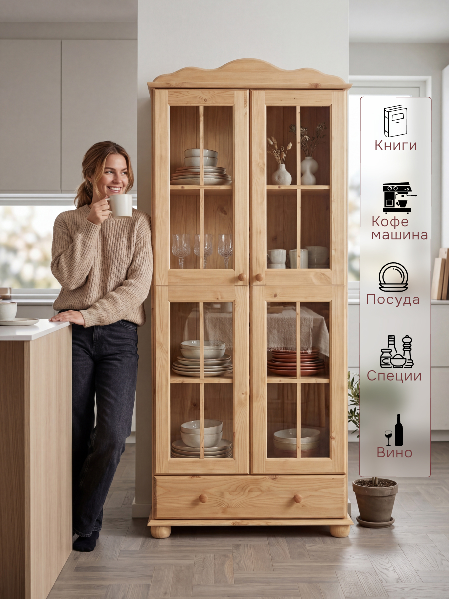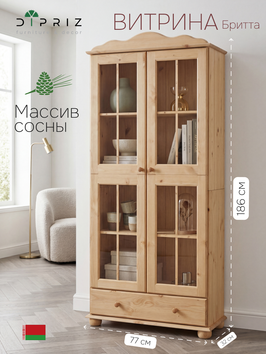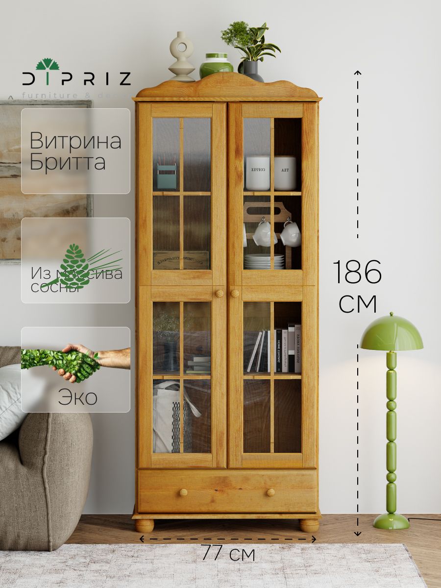 Шкаф-витрина Бритта двухдверная стеклянная, бейц - это продукт, который будет служить вам долго и надежно. Он изготовлен из массива сосны, что обеспечивает высокую прочность и долговечность материала. Кроме того, он имеет антибактериальное покрытие на дверях, которое поможет предотвратить распространение микробов и бактерий внутри шкафа.