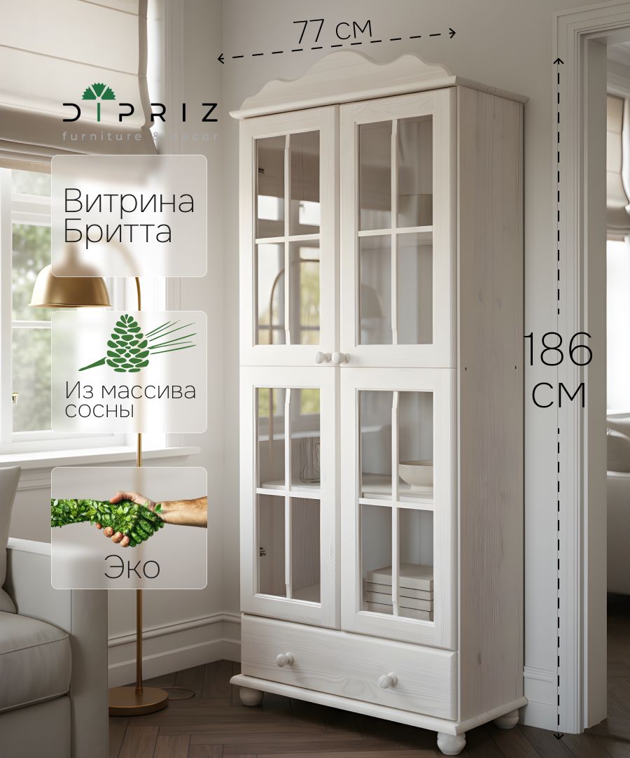 Шкаф витрина Бритта изготовлен из натурального дерева (массива сосны) от белорусского производителя мебели "Диприз", с использованием экологически чистых отделочных материалов.