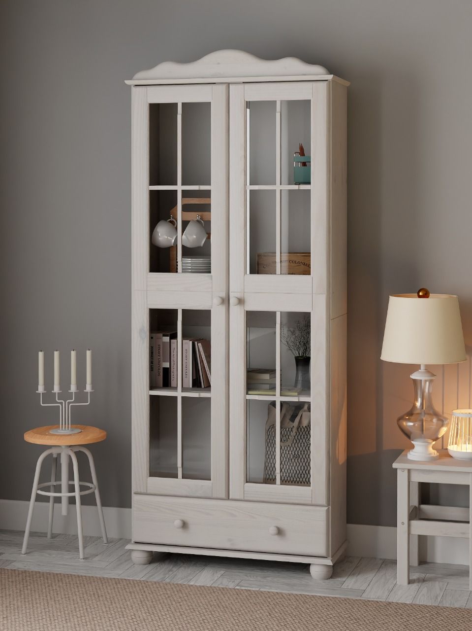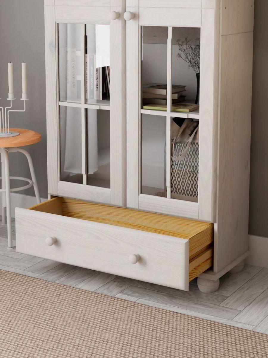 Двери витрины шкафа оснащены стеклянными вставками. На деревянных полках найдут свое место различные скульптуры и книги. Здесь также можно разместить стаканы, чашки и другую посуду. Шкаф можно использовать для домашней библиотеки или хранения личных вещей. Шкаф с витриной будет отлично смотреться в вашем загородном доме.
