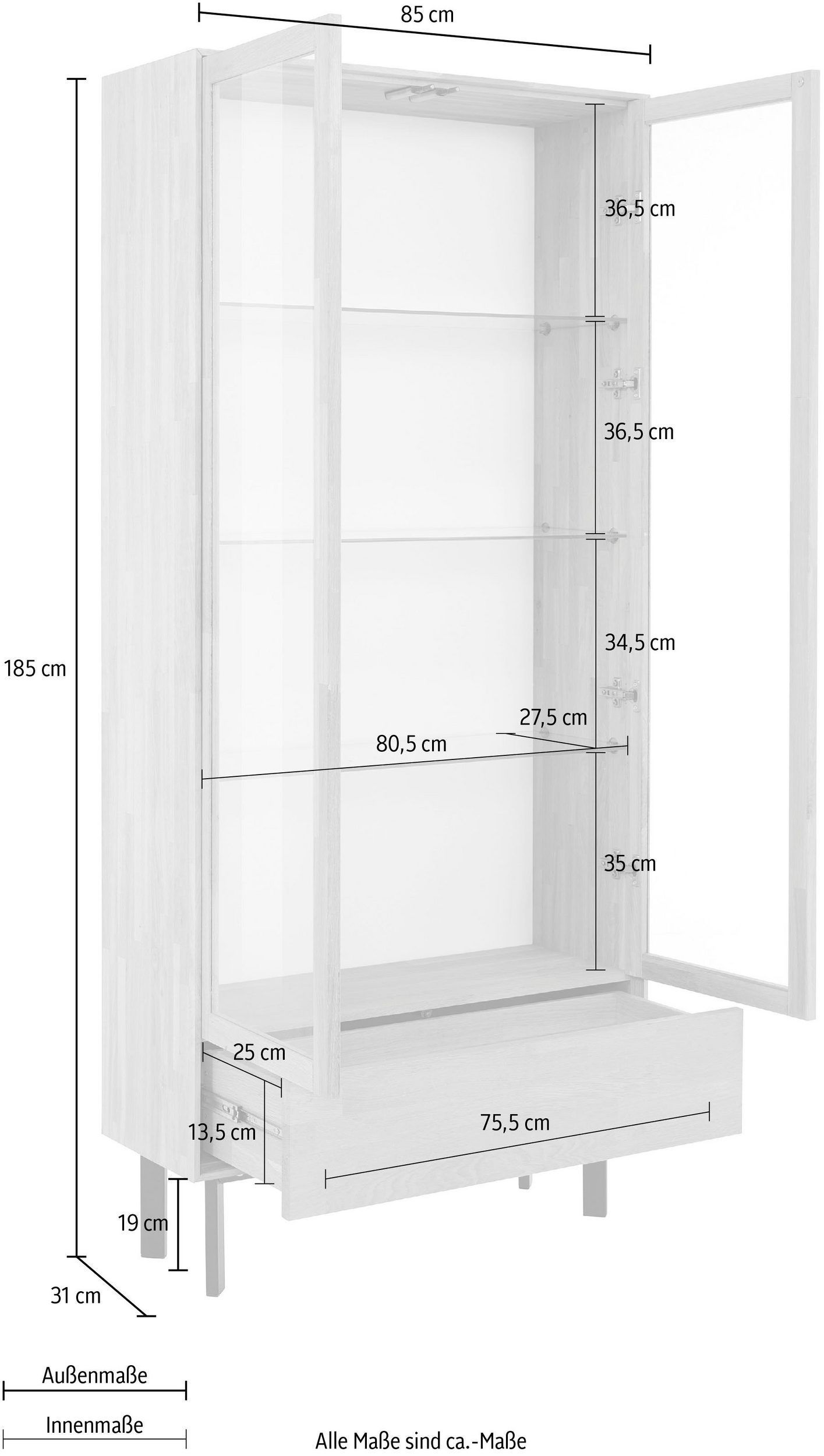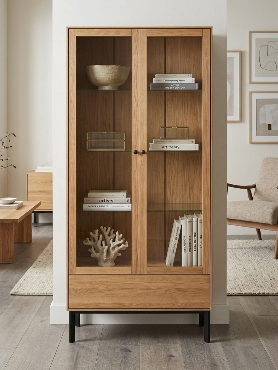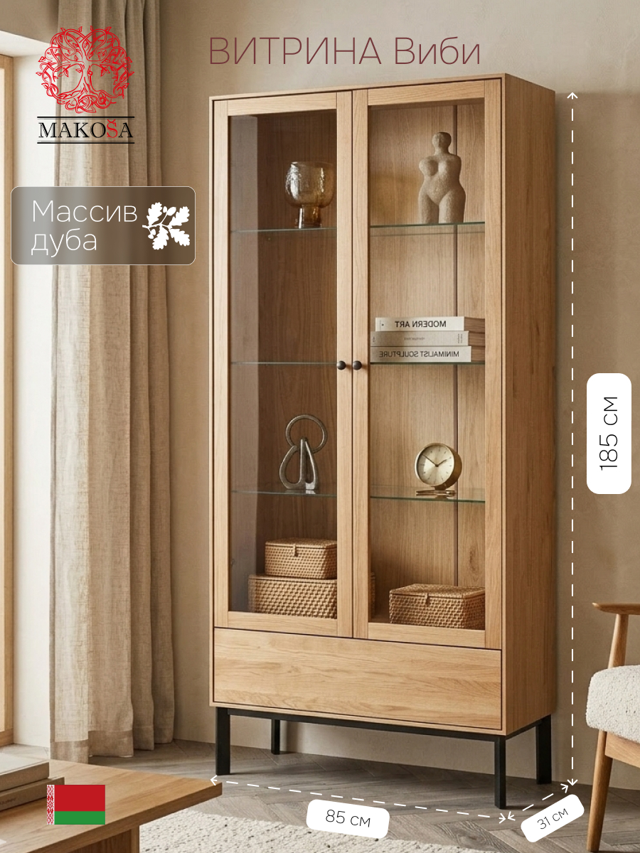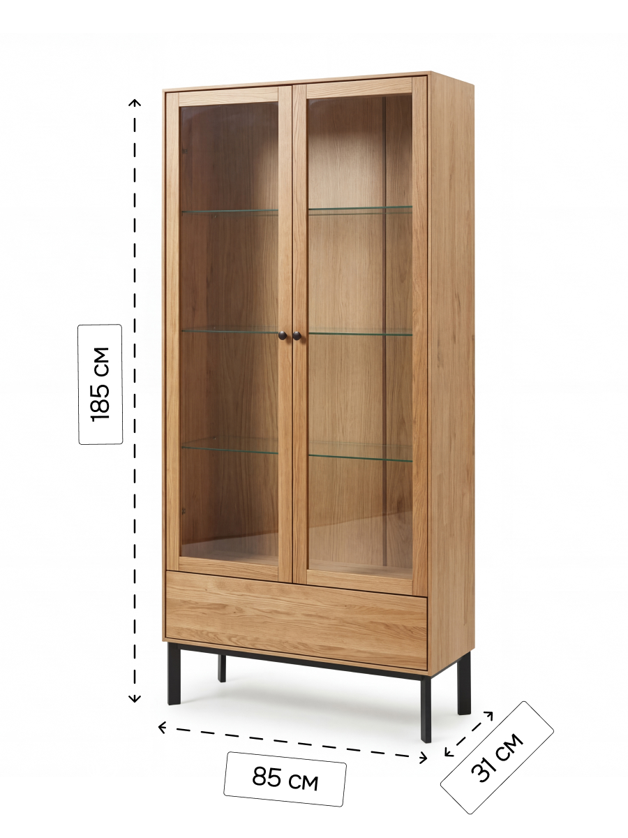 Шкаф-витрина дизайнерская Виби - это стильное и функциональное решение для вашего интерьера. Изготовлен из массива дуба, он отличается высокой прочностью и долговечностью. Металлические ножки подчеркивают современный лофт-дизайн, придавая модели элегантный и актуальный внешний вид. Строгие линии и натуральные материалы делают этот шкаф отличным выбором для современных пространств.Этот шкаф витрина идеально подходит для хранения книг, посуды и декоративных предметов. Две стеклянные дверцы с системой PUSH-TO-OPEN защищают содержимое от пыли и при этом позволяют легко видеть все, что находится внутри. Вместительный ящик придает изделию завершенный вид. Это делает шкаф не только практичным, но и визуально привлекательным. В кухне он может служить буфетом для посуды, подойдёт и для хранения кухонных принадлежностей. В гостиной шкаф Виби станет отличным акцентом, добавив в интерьер шика и стиля.Массив дуба, из которого изготовлен этот шкаф, придаёт особую харизму и гарантирует долгий срок службы. Прочная конструкция и качественные материалы обеспечивают надежность и устойчивость даже при длительной эксплуатации.Основные характеристики:- Размеры: 85х31х185 см- Материалы: массив дуба, металл, стекло- Прочные металлические ножки, вместительные полки из стекла- Стеклянные дверцы c доводчиком и системой PUSH-TO-OPENЭтот шкаф деревянный прекрасно сочетается с другими элементами мебели в стиле лофт, добавляя в дом уют и атмосферу. Его вместительные полки подойдут как для хранения книг, так и для декоративной посуды или памятных сувениров. Широкий ящик увеличивает пространство для размещения нужных вещей. Такой шкаф из массива дуба станет не только функциональной частью интерьера, но и истинным украшением вашего дома.Ищете книжный шкаф или буфет для кухни? Шкаф витрина Виби прекрасно справится с обеими задачами. Независимо от того, хотите ли вы использовать его как шкаф в гостиную или шкаф витрину для посуды, эта модель удовлетворит ваши потребности. Уникальный дизайн и высококачественные материалы делают этот шкаф витриной идеальным выбором для тех, кто ценит стиль и качество.Приобретение шкафа витрины Виби - это вклад в создание уютного и стильного интерьера. Пусть ваш дом станет настоящим отражением вашего вкуса с помощью этой элегантной и функциональной мебели.