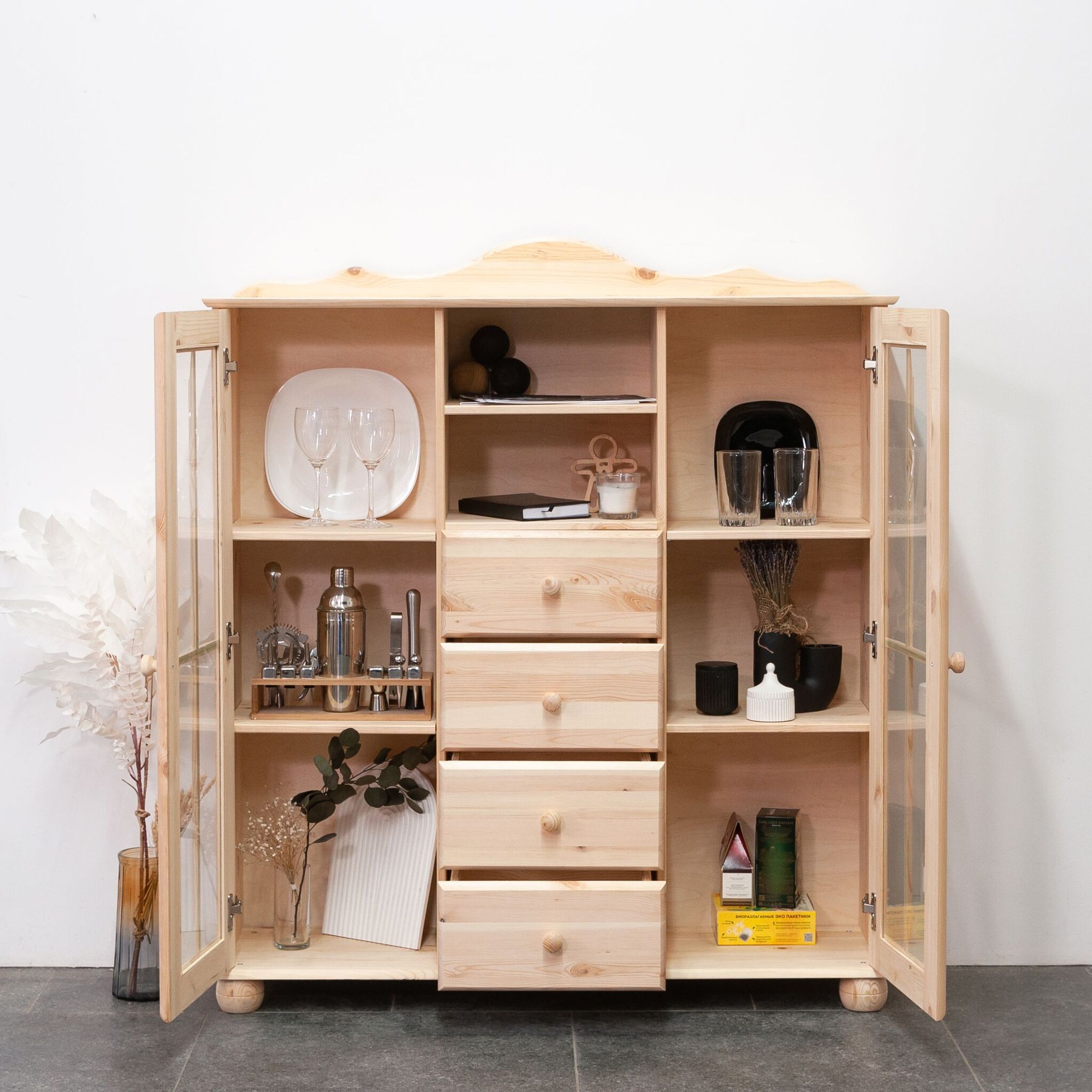Шкаф из натурального массива сосны в скандинавском стиле с декоративным карнизом и стеклянной дверью создаст атмосферу уюта и элегантности в вашем интерьере.