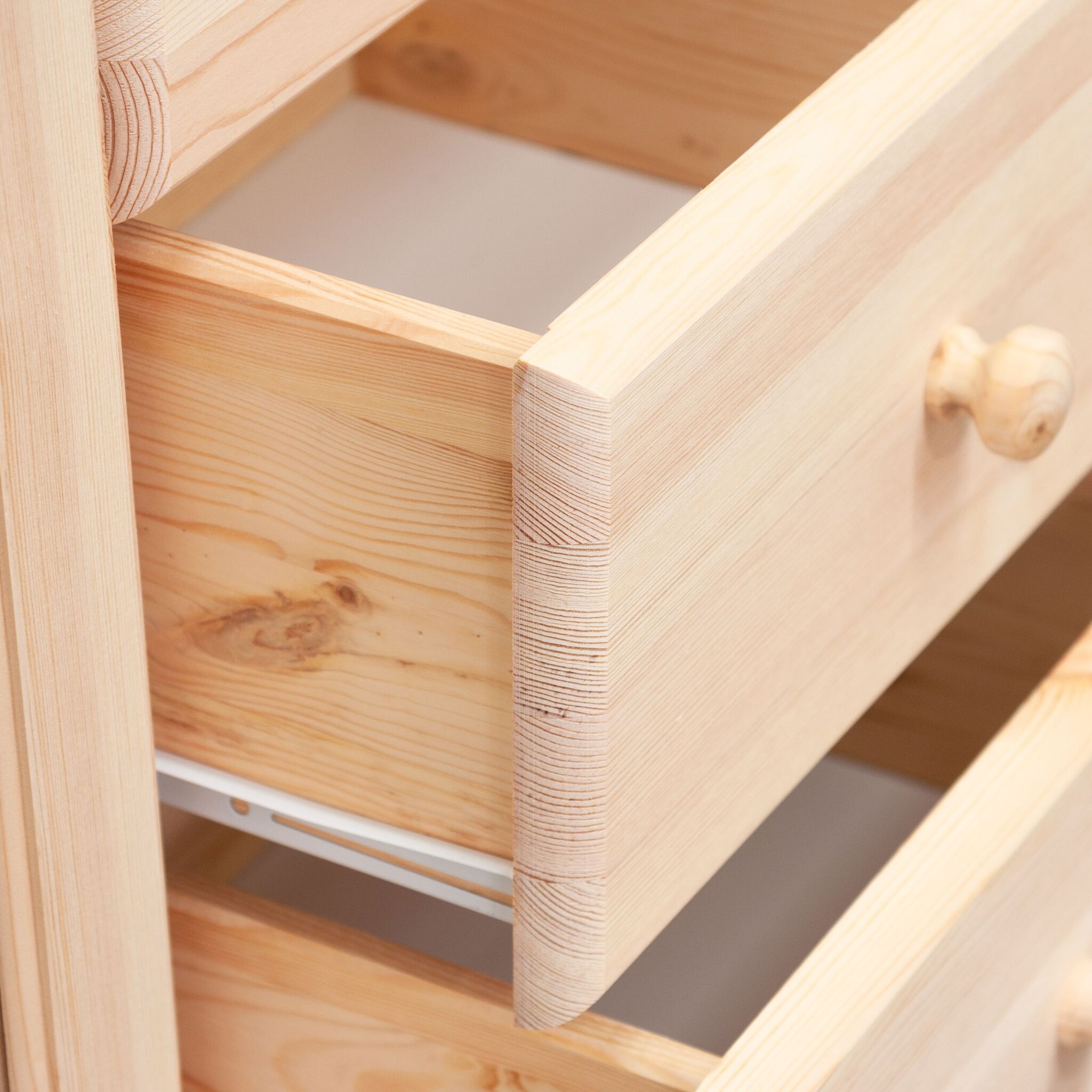 Поверхность и края изделия тщательно отшлифованы, что предотвратит случайные удары или повреждения. Шкаф покрыт прозрачным натуральным лаком на водной основе, благодаря чему приятный хвойный запах и полезные свойства дерева сохранены. Мебель имеет нежный бежевый оттенок, который подойдет для размещения в любой комнате. Фаски шкафа были сглажены с целью предотвращения случайных ударов или зацепов.