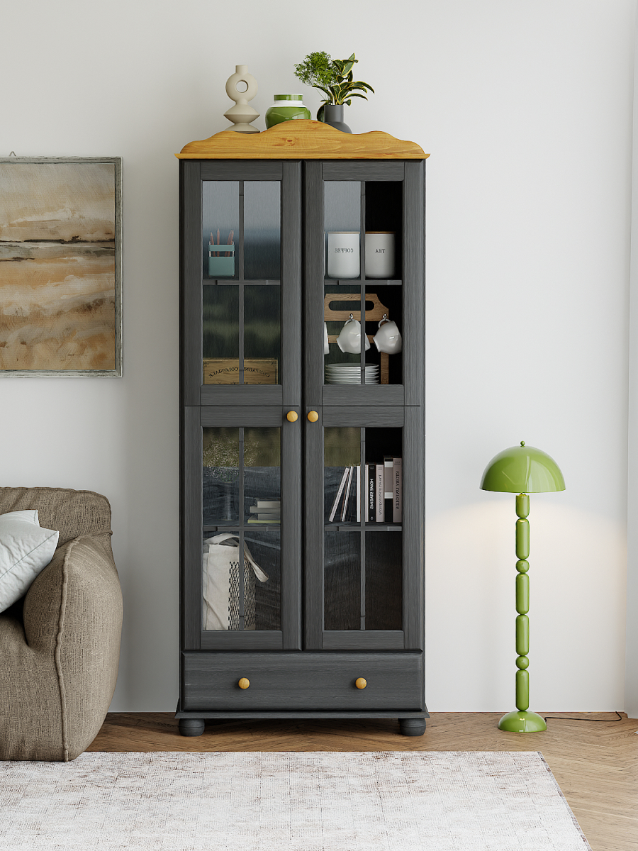 Двери витрины оснащены стеклянными вставками, которые делают шкаф визуально легким и воздушным. Внутри расположены 4 деревянные полки, куда можно разместить посуду, книги, скульптуры или другие предметы, а также 1 вместительный ящик для мелочей. Материал задней стенки — ДВП золотой крафт, дно ящика — ДВП белое, что гарантирует надежность конструкции. Толщина дерева дверей и фасада ящика — 18 мм, остальных элементов — 14 мм. Размер ящика — 663×246×142,8 мм.