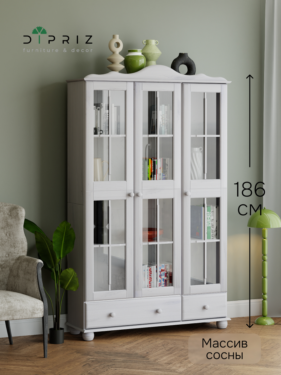 Шкаф с витриной изготовлена из натурального дерева сосны от белорусского производителя мебели "Диприз". Шкаф с витриной отличается элегантным современным дизайном, который легко сочетается с любым стилем и декором! Двери витрины оснащены стеклянными вставками. На деревянных полках найдут свое место различные скульптуры и книги, также можно разместить стаканы, чашки и другую посуду, так и для домашней библиотеки или личных вещей. Шкаф с витриной будет отлично смотреться в вашем загородном доме. Материал задней стенки и дно ящика - фанера, остальное - сосна. Размер ящиков - 297*246*142,8(М), 663*246*142,8(Б). Толщина дерева двери и фасада ящика - 18мм, остальное - 14мм. Комплектация составляет: 4 полки и 1 ящик.