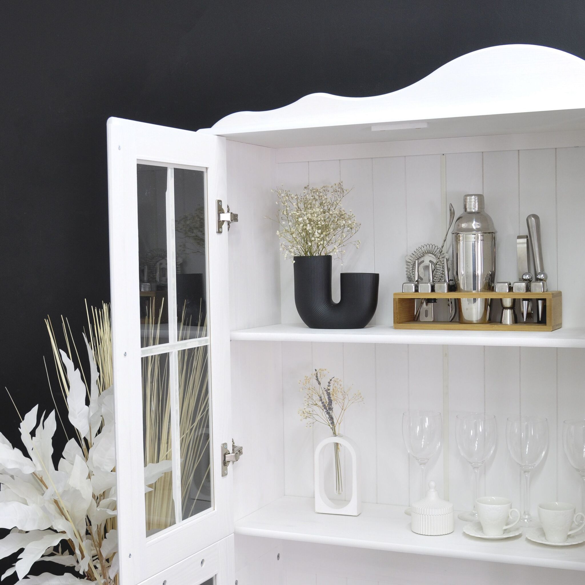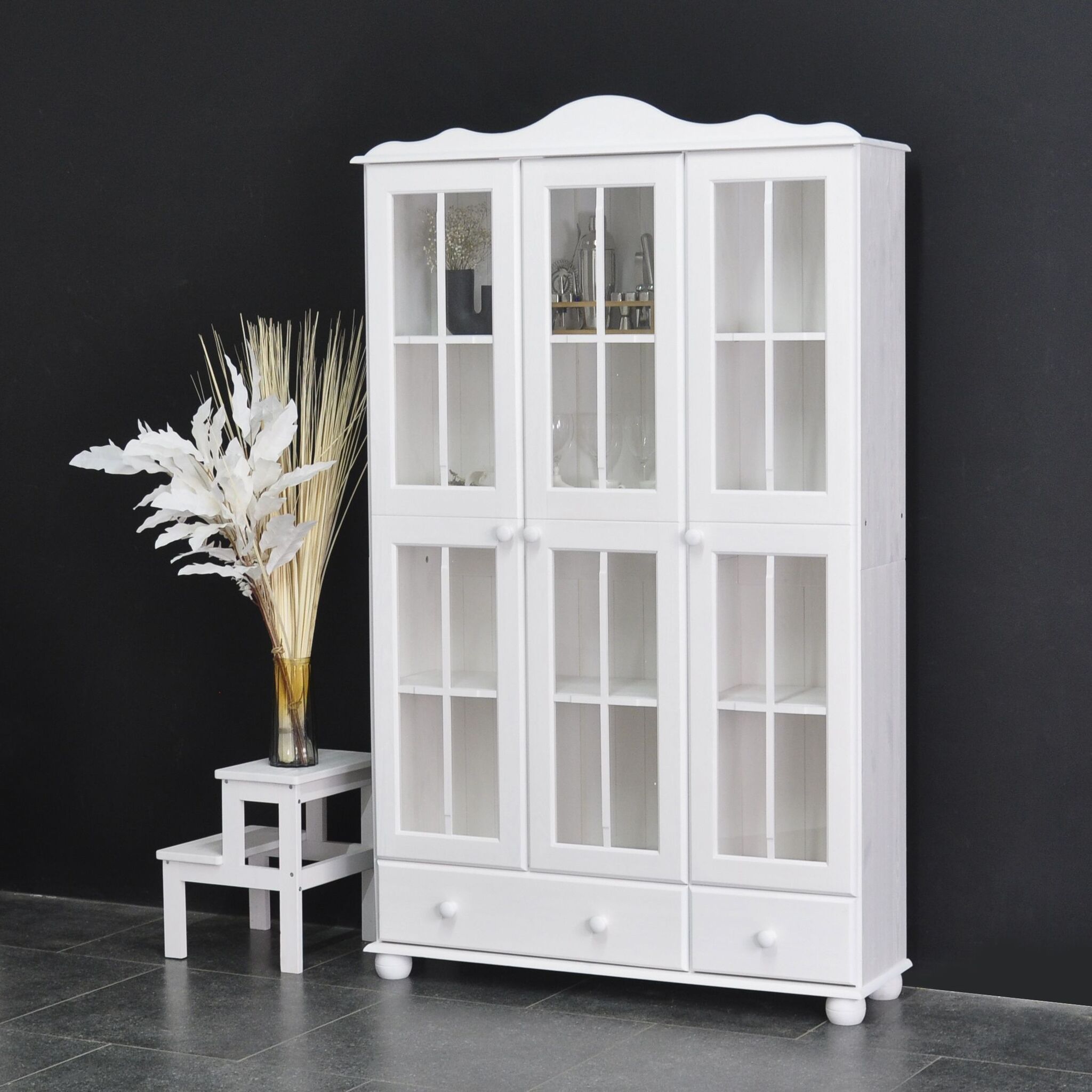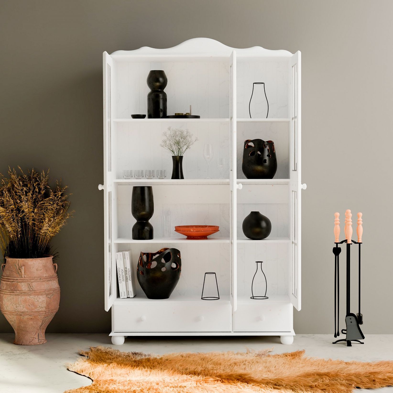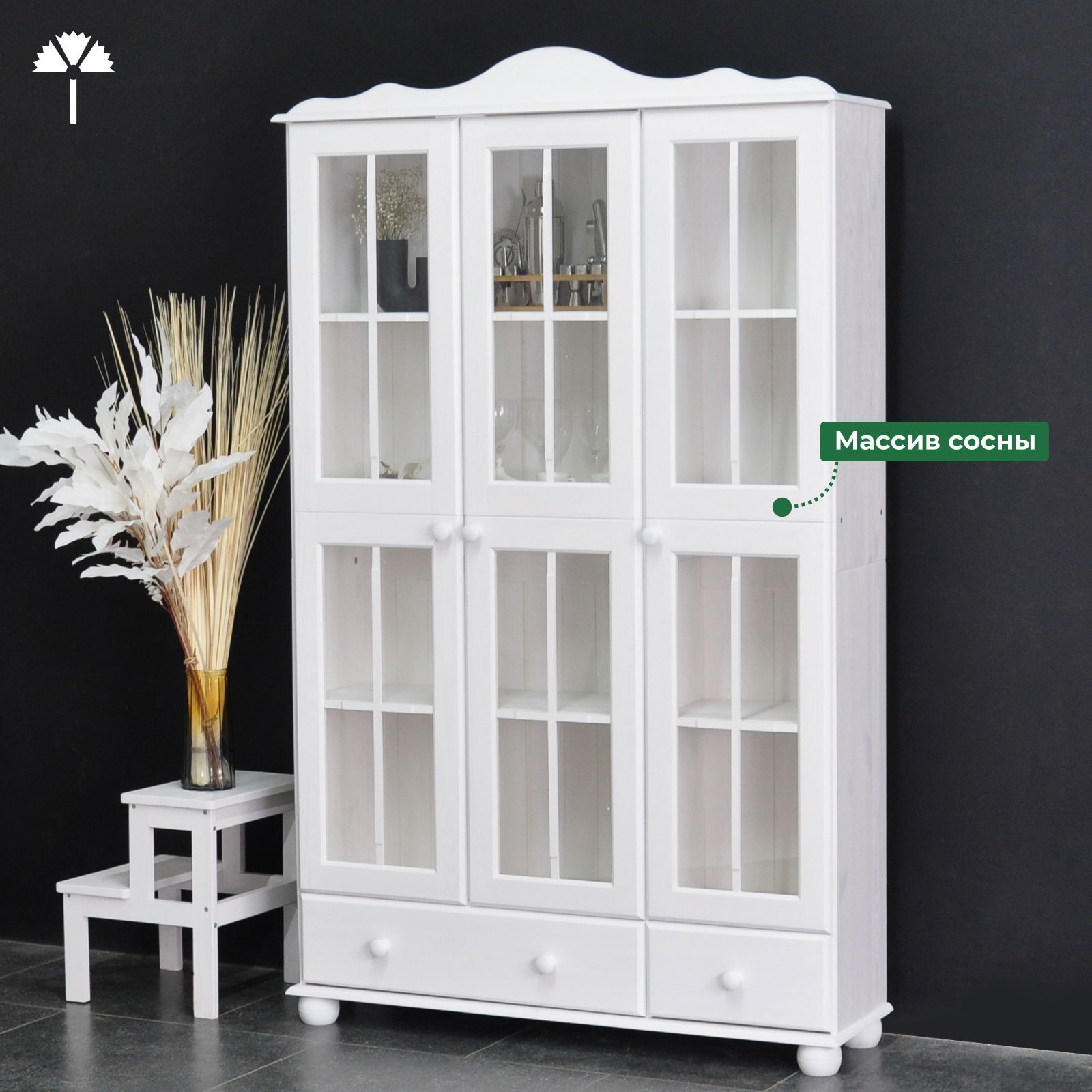 Шкаф витрина изготовлен из натурального дерева сосны от белорусского производителя мебели "Диприз". Шкаф витрина для посуды отличается элегантным современным дизайном, который легко сочетается с любым стилем и декором! Двери серванта шкафа для посуды оснащены стеклянными вставками. На деревянных полках найдут свое место различные скульптуры и книги, также можно разместить стаканы, чашки и другую посуду, так и для домашней библиотеки или личных вещей. Книжный шкаф будет отлично смотреться в вашем загородном доме. Материал задней стенки и дно ящика серванта - ДВП белое, остальное - сосна. Размер ящиков - 297*246*142,8(М), 663*246*142,8(Б). Толщина дерева двери и фасада ящика - 18мм, остальное - 14мм. Комплектация составляет: 8 полок и 2 ящика.