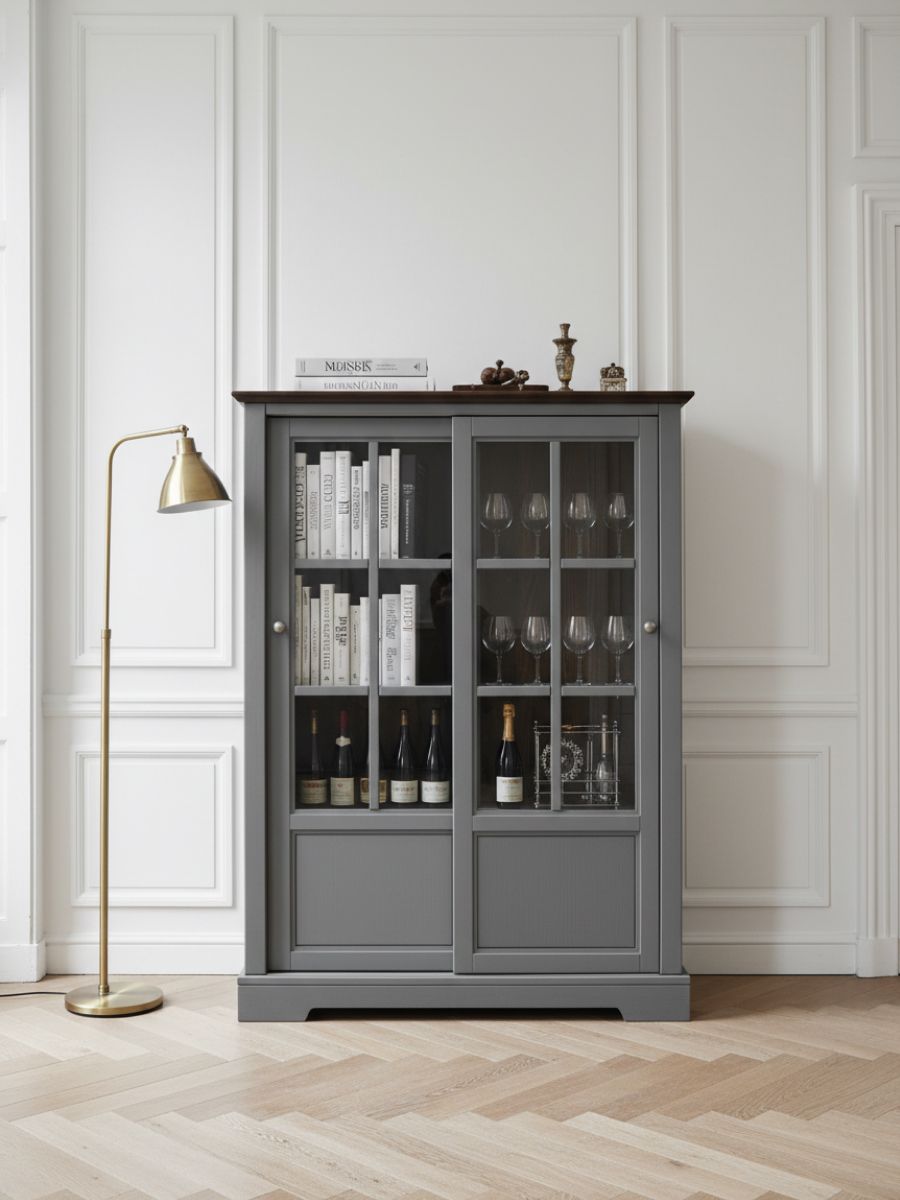 Шкаф витрина имеет две раздвижные двери, которые обеспечивают легкий доступ к содержимому, не занимая при этом много места. Эти стеклянные дверцы защищают ваши вещи от пыли, оставаясь при этом прозрачными, чтобы ваши любимые предметы постоянно были на виду. Шесть съемных полок обеспечивают достаточно пространства для хранения вещей и посуды. Максимальная нагрузка составляет до 5 кг на полку.
