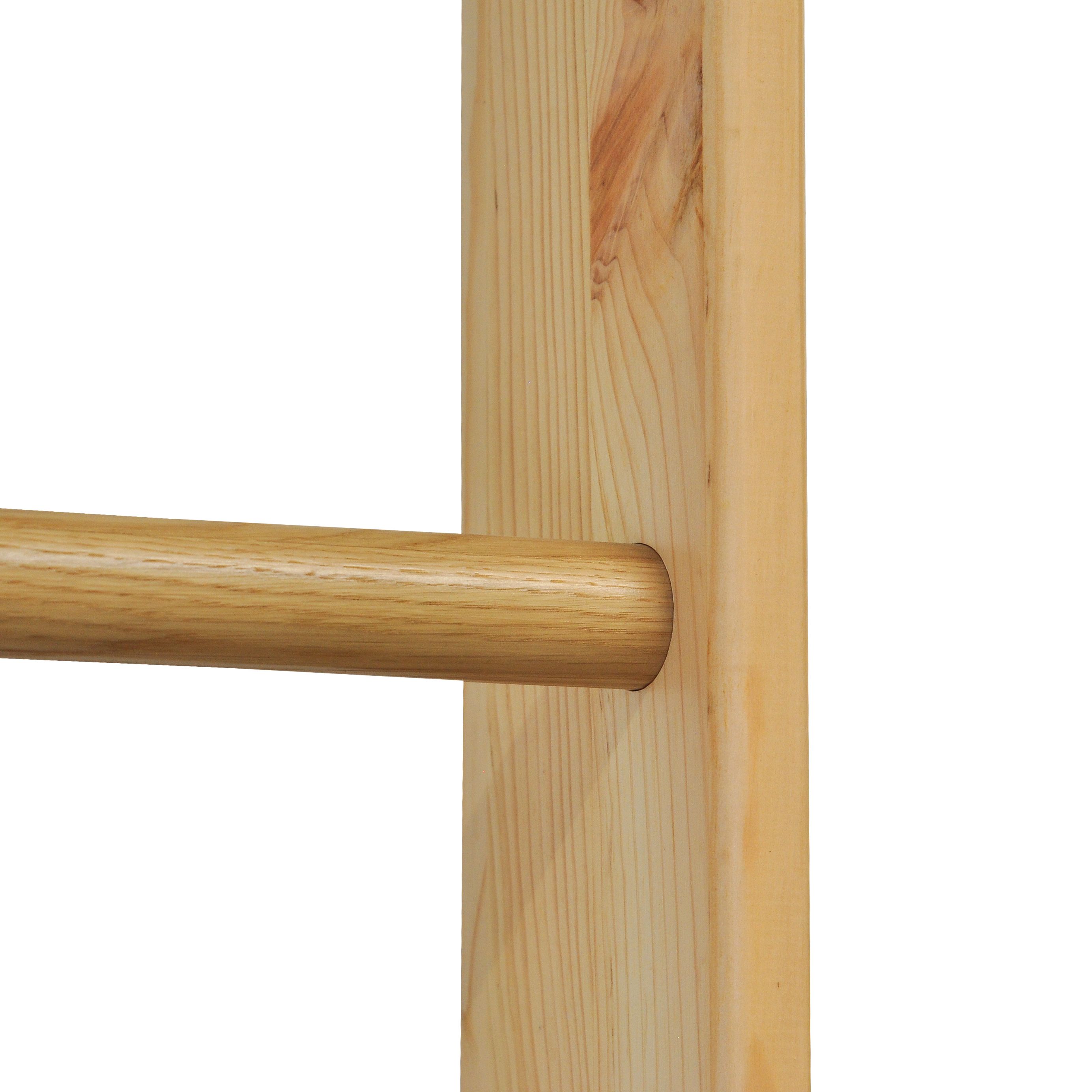 - Комбинированные материалы: основная конструкция выполнена из массива сосны, жердочки – из массива дуба, а три прочные фанерные перекладины связывают конструкцию, обеспечивая максимальную устойчивость.
