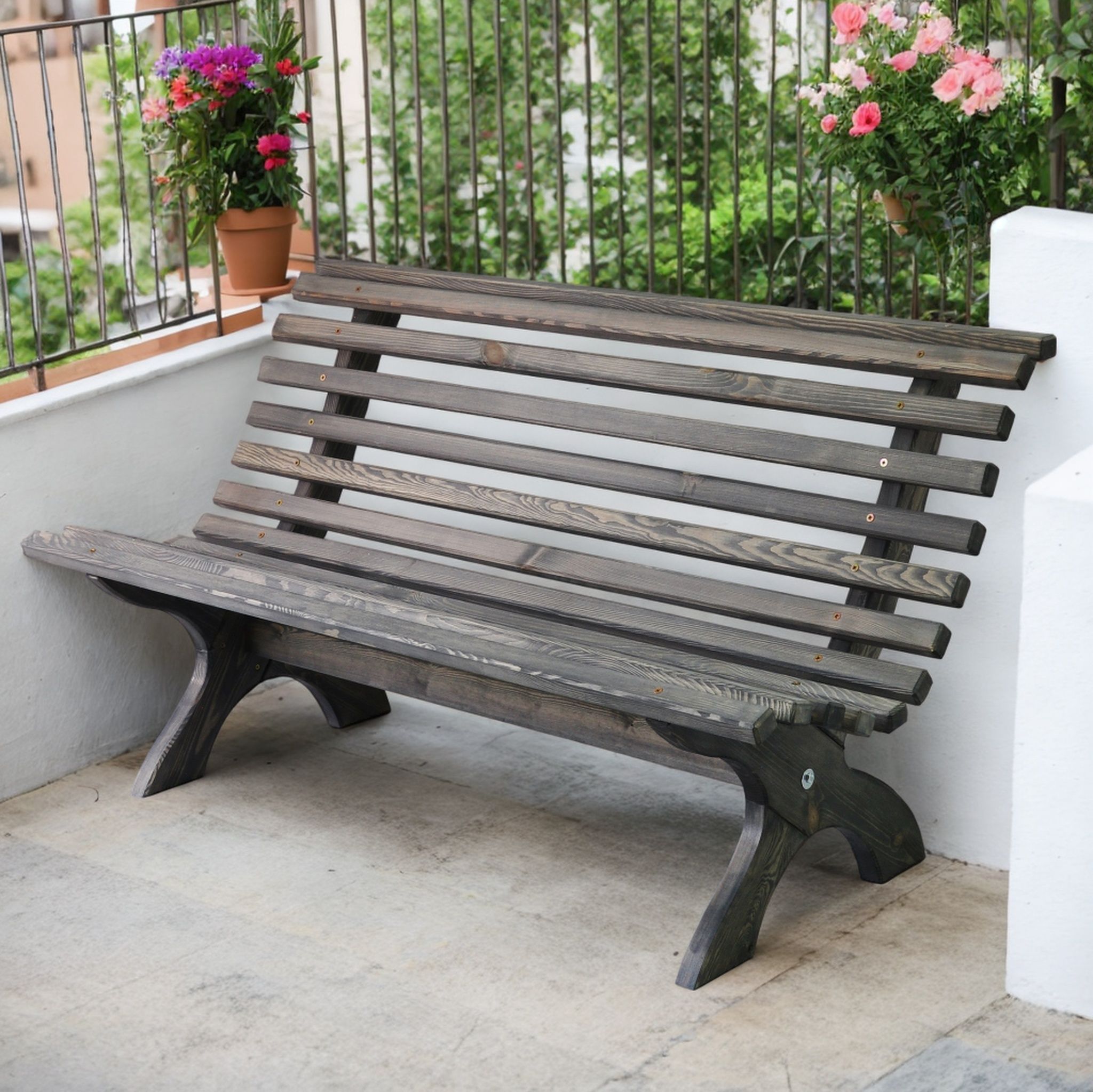 1. Эстетика и прочность: Скамейка выполнена из массива сосны, прочных и толстых брусков, что придает ей устойчивость и долгий срок службы. Каждый элемент тщательно прошлифован и округлен, придавая мебели уникальный внешний вид.