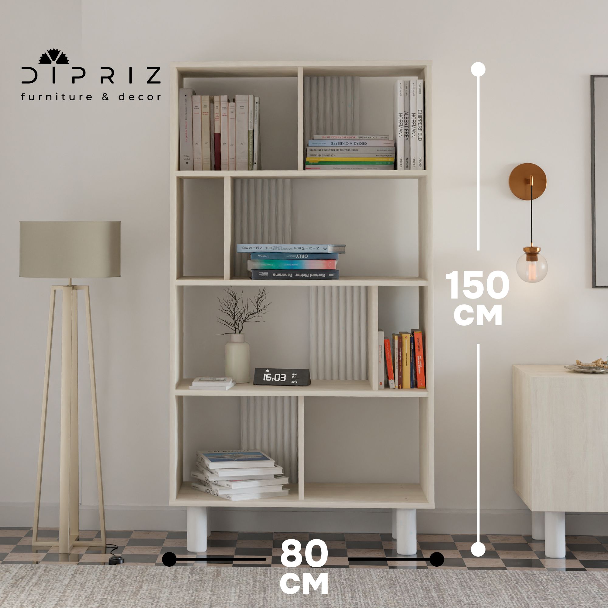 Книжный шкаф Ола с размерами обеспечит достаточное пространство для хранения книг, канцелярских принадлежностей, а также любых других предметов, которые вы хотите держать под рукой. Его напольная конструкция и прочные ножки из сосны придают надежность и стабильность, а разнообразие полок позволяет легко организовать пространство.