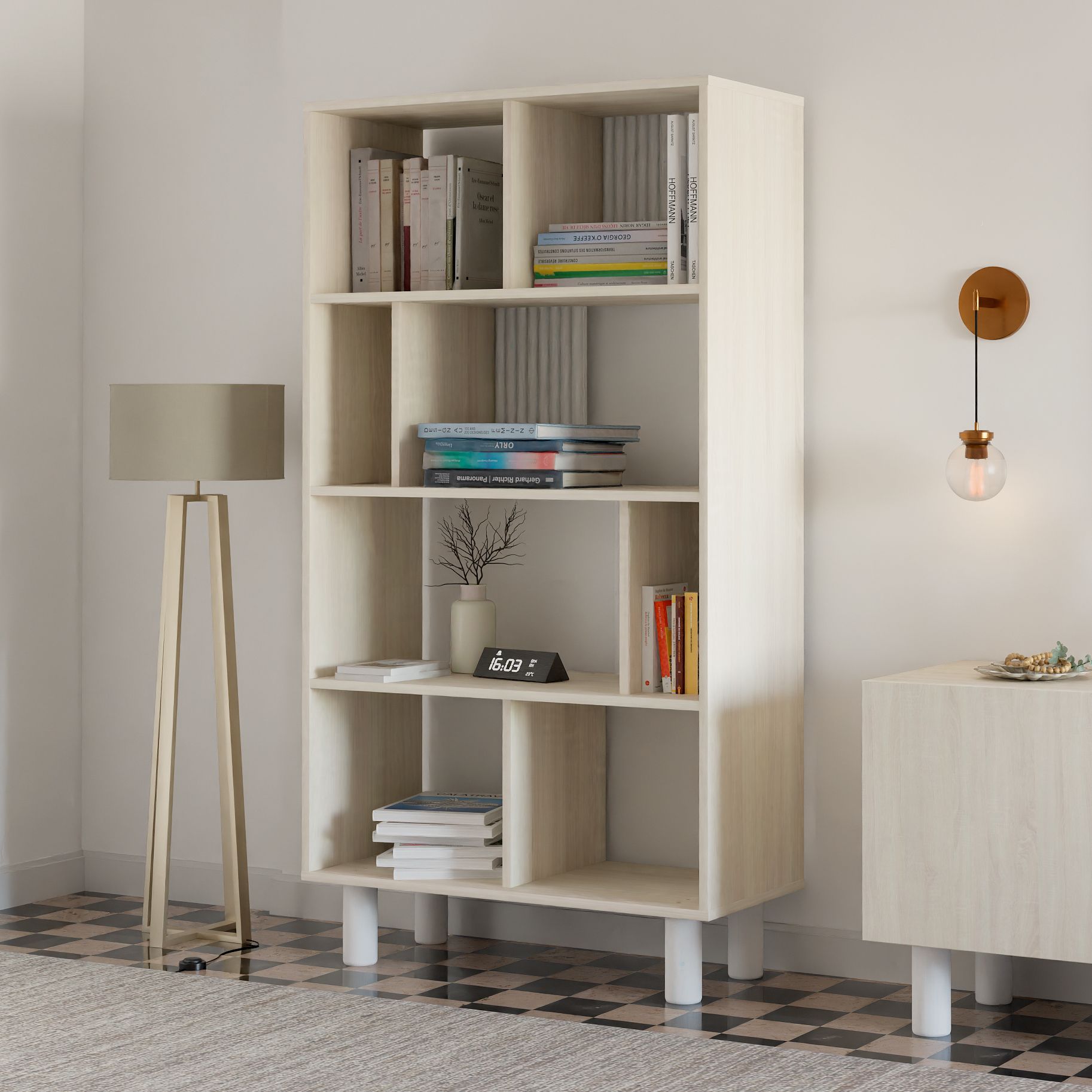 Светлый оттенок шкафа создает ощущение просторности и света, что делает его прекрасным выбором для современных интерьеров. Он отлично дополнит интерьеры в эко-стиле, стиле лофт и скандинавском стиле, а также подойдет для оформления детской, где можно разместить книги и игрушки. Такой стеллаж станет не только функциональным элементом, но и стильным аксессуаром.