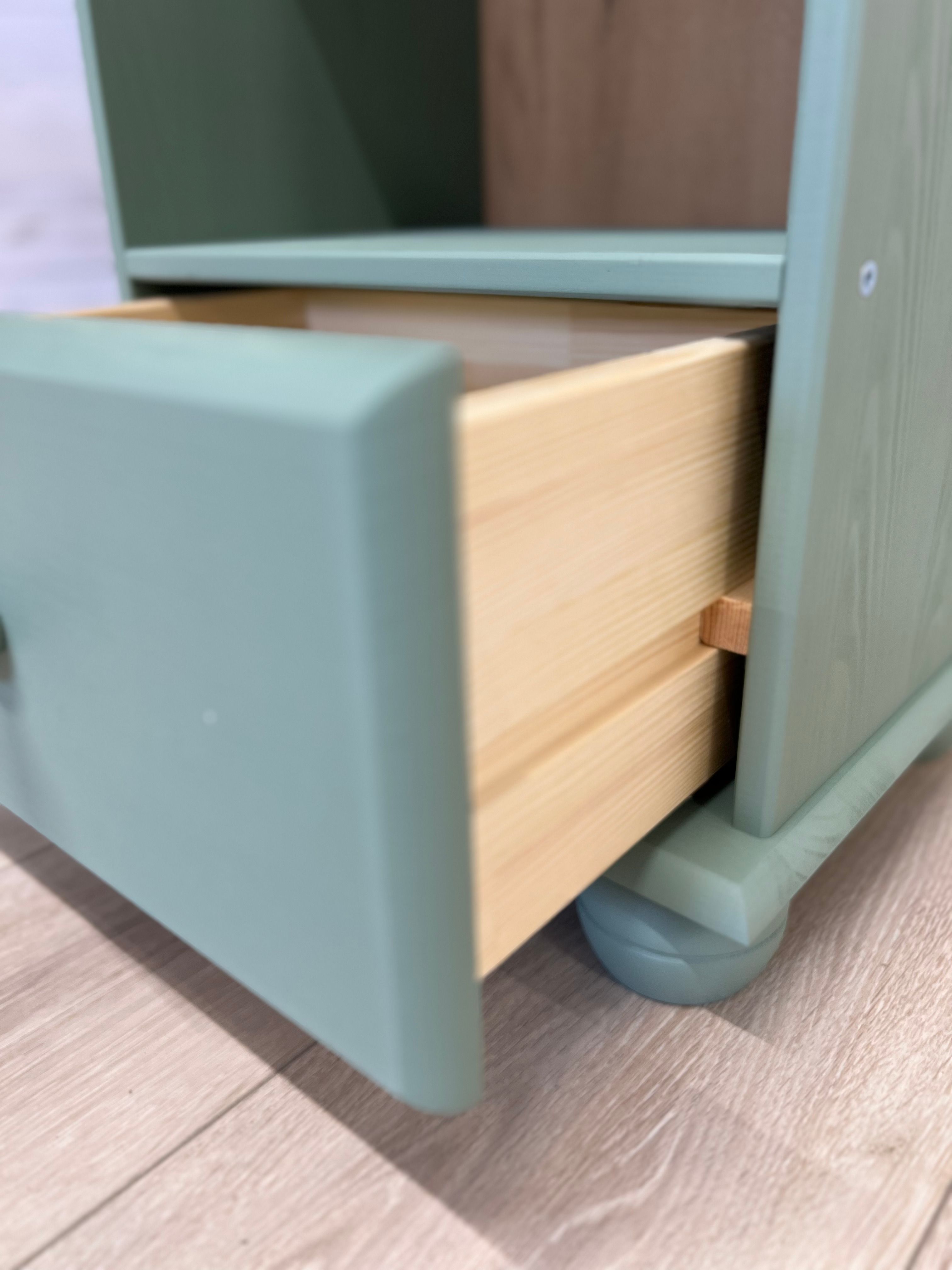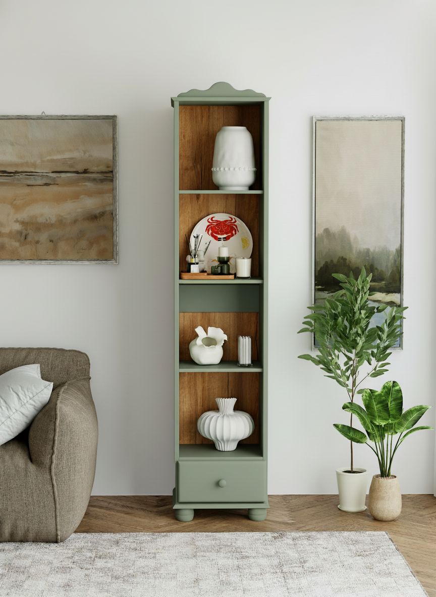 Стеллаж Бритта из массива сосны с ящиком в зеленом цвете — идеальное решение для тех, кто ценит стиль и функциональность. Эта модель станет отличным дополнением вашего интерьера, добавив в него нотку уюта и элегантности. Изготовленный из натурального массива сосны, стеллаж обладает высокой прочностью и долговечностью, что гарантирует его долгий срок службы. Цвет эвкалипта (бейц по дереву) придаёт изделию стильный и современный вид, что позволяет ему легко вписаться в любой интерьер, будь то классический, современный или скандинавский стиль.Стеллаж Бритта имеет несколько открытых полок, которые предоставляют достаточно места для хранения книг, декоративных элементов, растений или любых других предметов, которые вы хотите разместить на видном месте. Кроме открытых полок, стеллаж оборудован просторным ящиком в нижней части, что обеспечивает дополнительное место для хранения вещей, которые предпочтительнее держать вне видимости, таких как документы, журналы или разнообразные мелочи.Изделие создано с учётом всех нюансов качества и экологичности: сосна — это не только натуральный материал, но и экологически чистый, что делает стеллаж безопасным для использования в жилых помещениях, включая детские комнаты. Удобство в использовании и продуманное до мелочей исполнение делают стеллаж Бритта универсальным решением для вашего дома или офиса.Благодаря своей функциональности, стеллаж Бритта может быть использован в гостиной, спальне, кабинете или даже на кухне. Вместительный и компактный, он не займёт много места, но при этом предоставит достаточную площадь для хранения и размещения нужных вам предметов. Натуральный оттенок дерева благоприятно сочетается с различными цветовыми решениями интерьера, создавая атмосферу тепла и гармонии.Не забудьте, что качественная мебель — это залог комфорта и уюта в вашем доме. Стеллаж Бритта не только практичен, но и эстетически привлекателен. Он станет прекрасным вариантом для тех, кто ищет надёжную и стильную мебель, которая прослужит долгие годы, придавая вашему дому или офису уникальный шарм и уют.