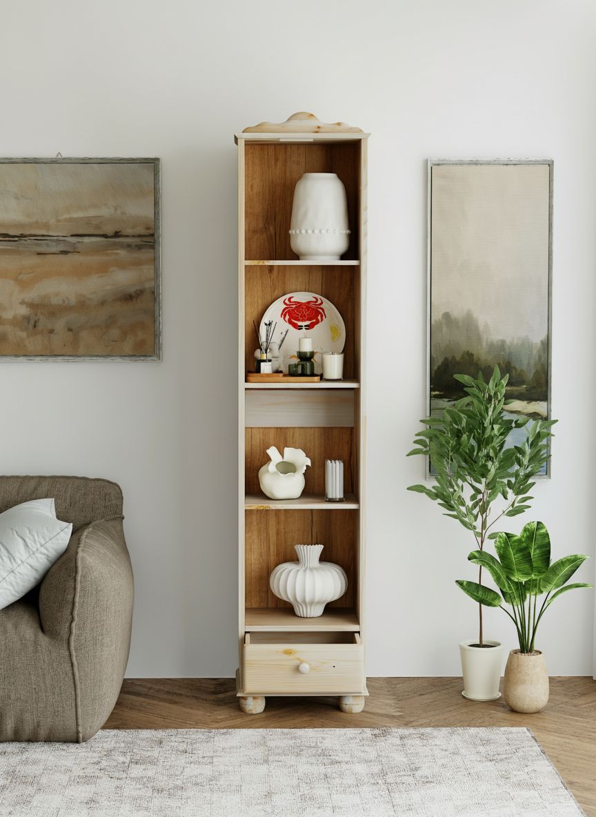 Стеллаж Бритта из массива сосны с ящиком в бежевом цвете — идеальное решение для тех, кто ценит стиль и функциональность. Эта модель станет отличным дополнением вашего интерьера, добавив в него нотку уюта и элегантности. Изготовленный из натурального массива сосны, стеллаж обладает высокой прочностью и долговечностью, что гарантирует его долгий срок службы. Натуральный цвет придаёт изделию классический и универсальный вид, что позволяет ему легко вписаться в любой интерьер, будь то классический, современный или скандинавский стиль.