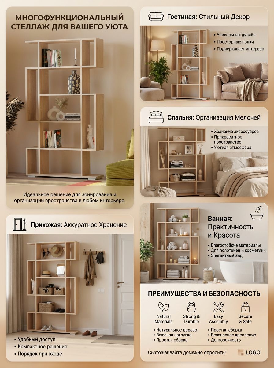 Скандинавский стиль предпочитает нейтральные цвета, такие как белый, серый, и приглушенные оттенки древесины. Это позволяет стеллажу легко вписываться в разные цветовые палитры и стили интерьера.