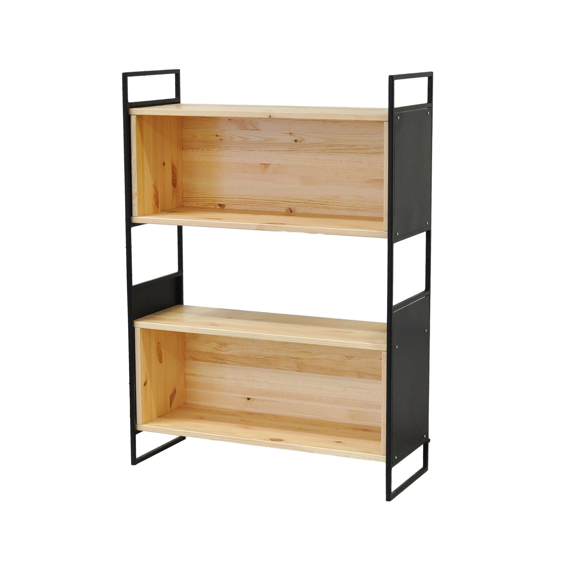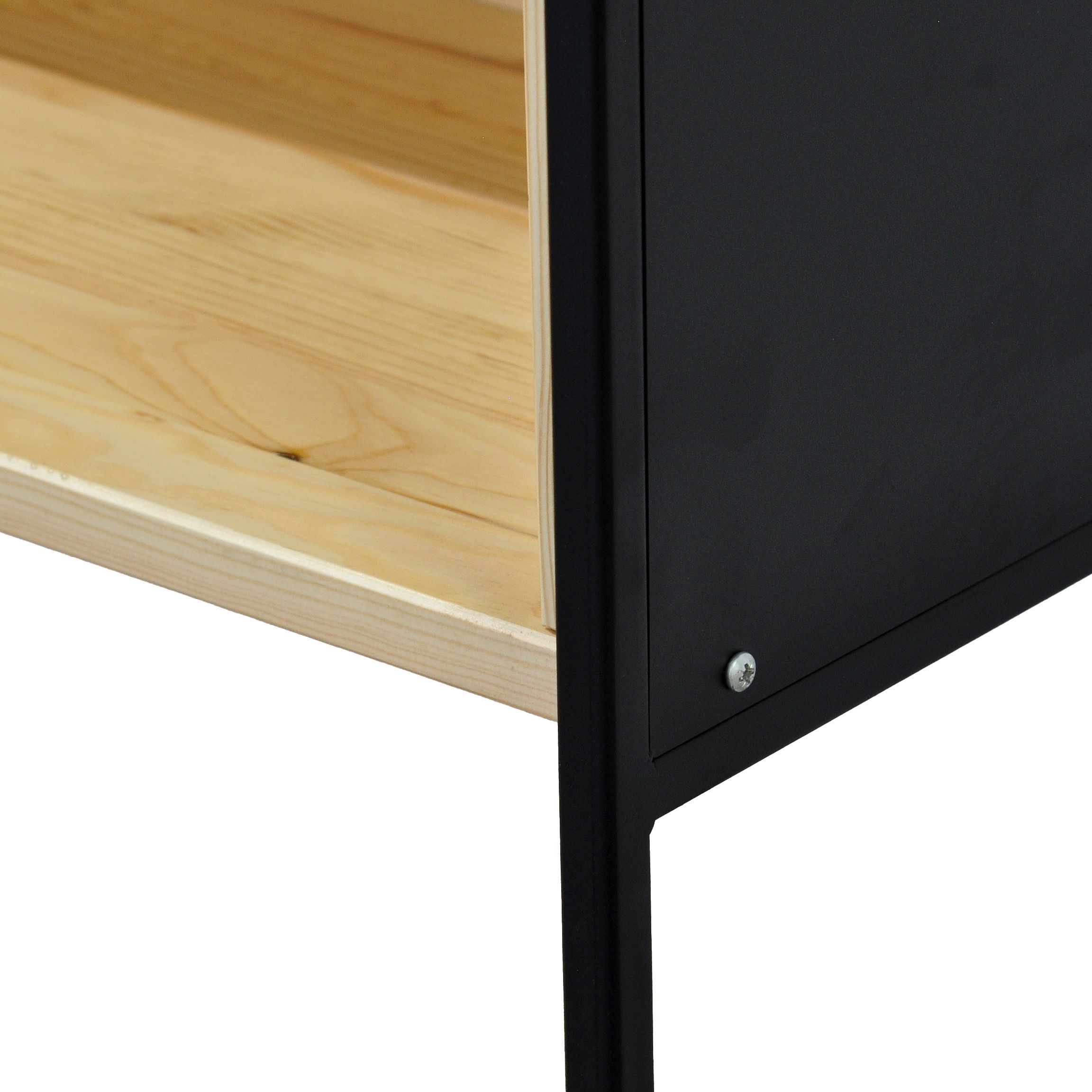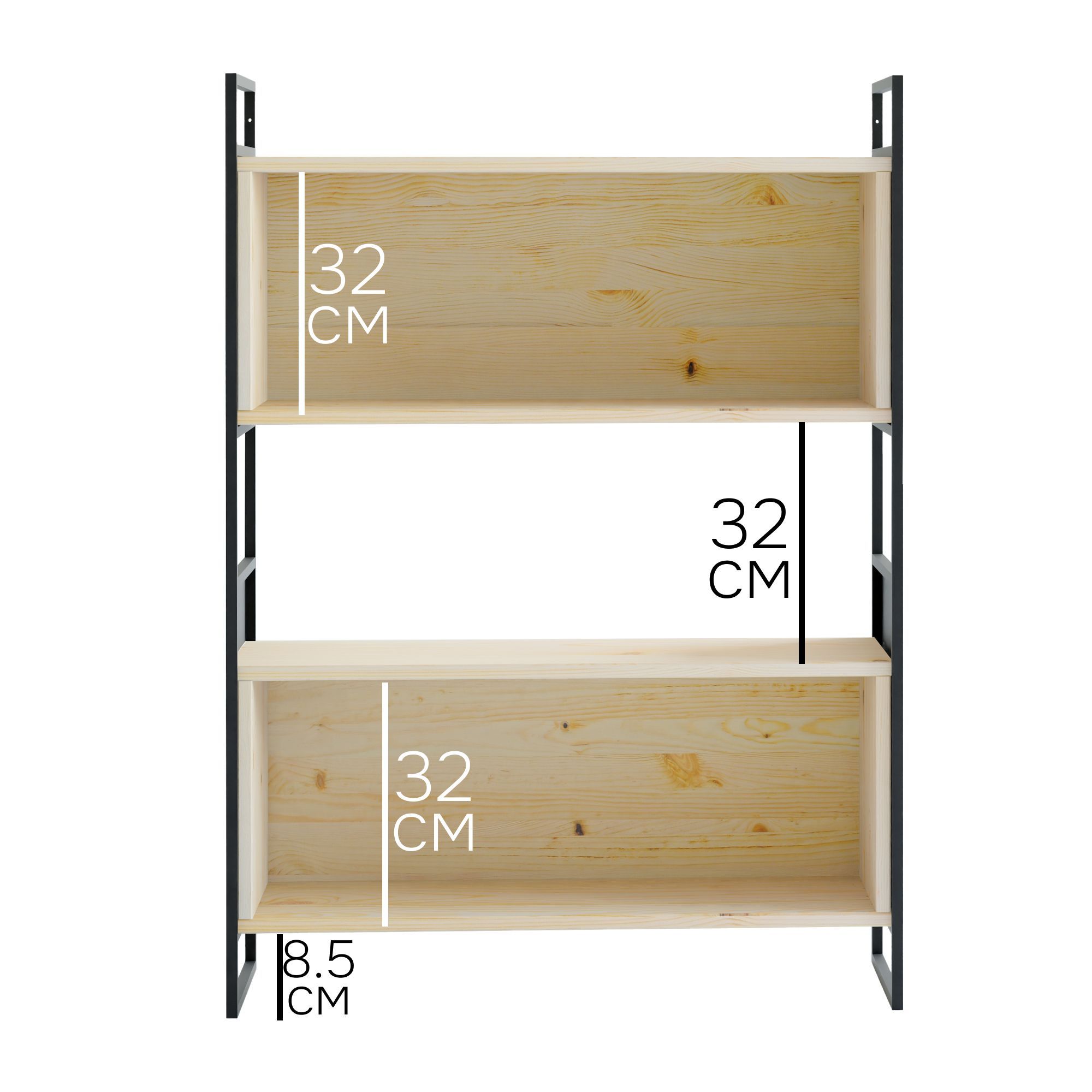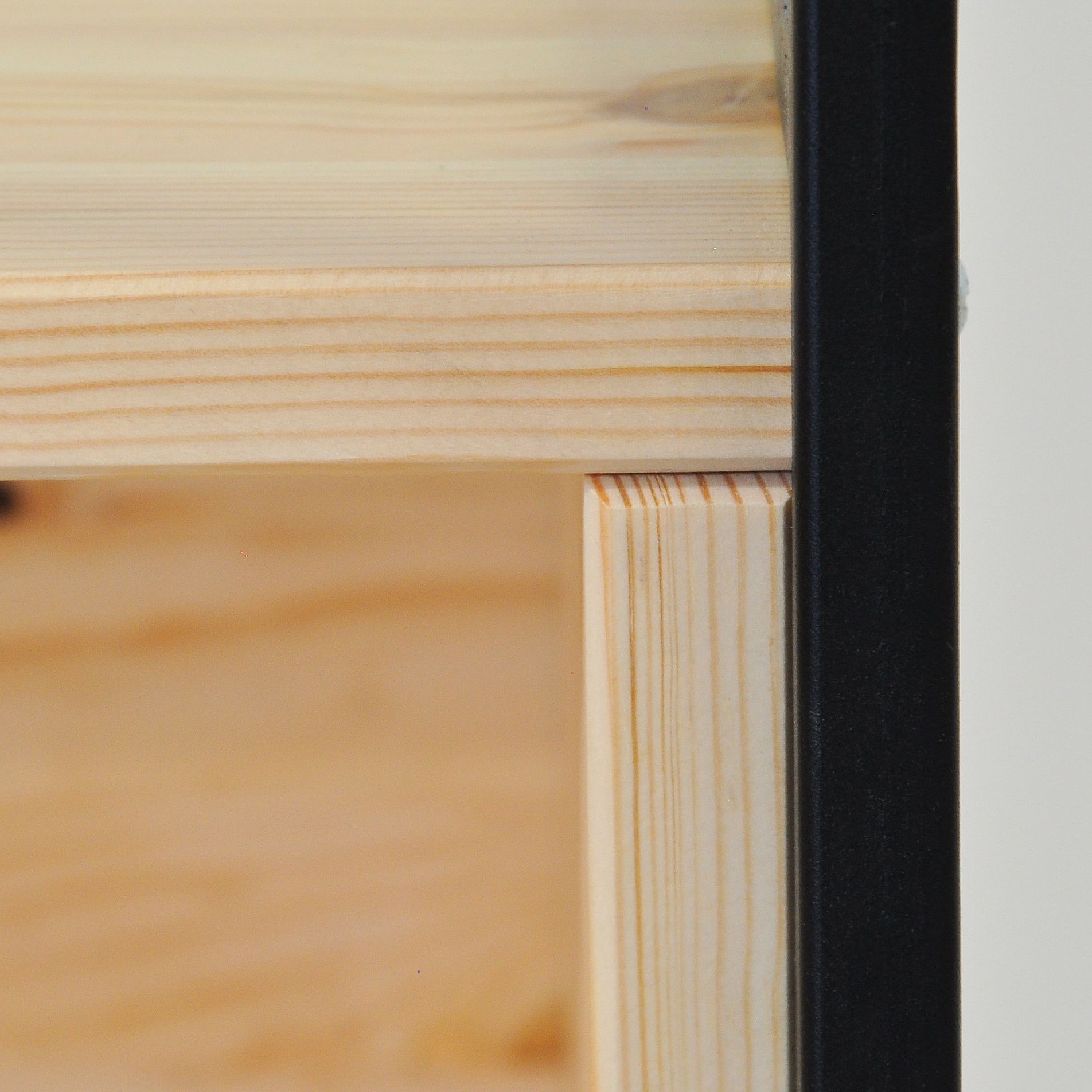 Основа стеллажа изготовлена из прочной древесины сосны, известной своей долговечностью и природным очарованием. Насыщенная текстура древесины и теплые тона подчеркиваются прозрачным лаком, который не только защищает поверхность, но и позволяет оставить неизменной красоту текстуры материала. Дополняющие деревянную раму боковые панели устройства выполнены из крепкого металла, что придает ему современный вид и создает разительный контраст с органичным теплом сосны.