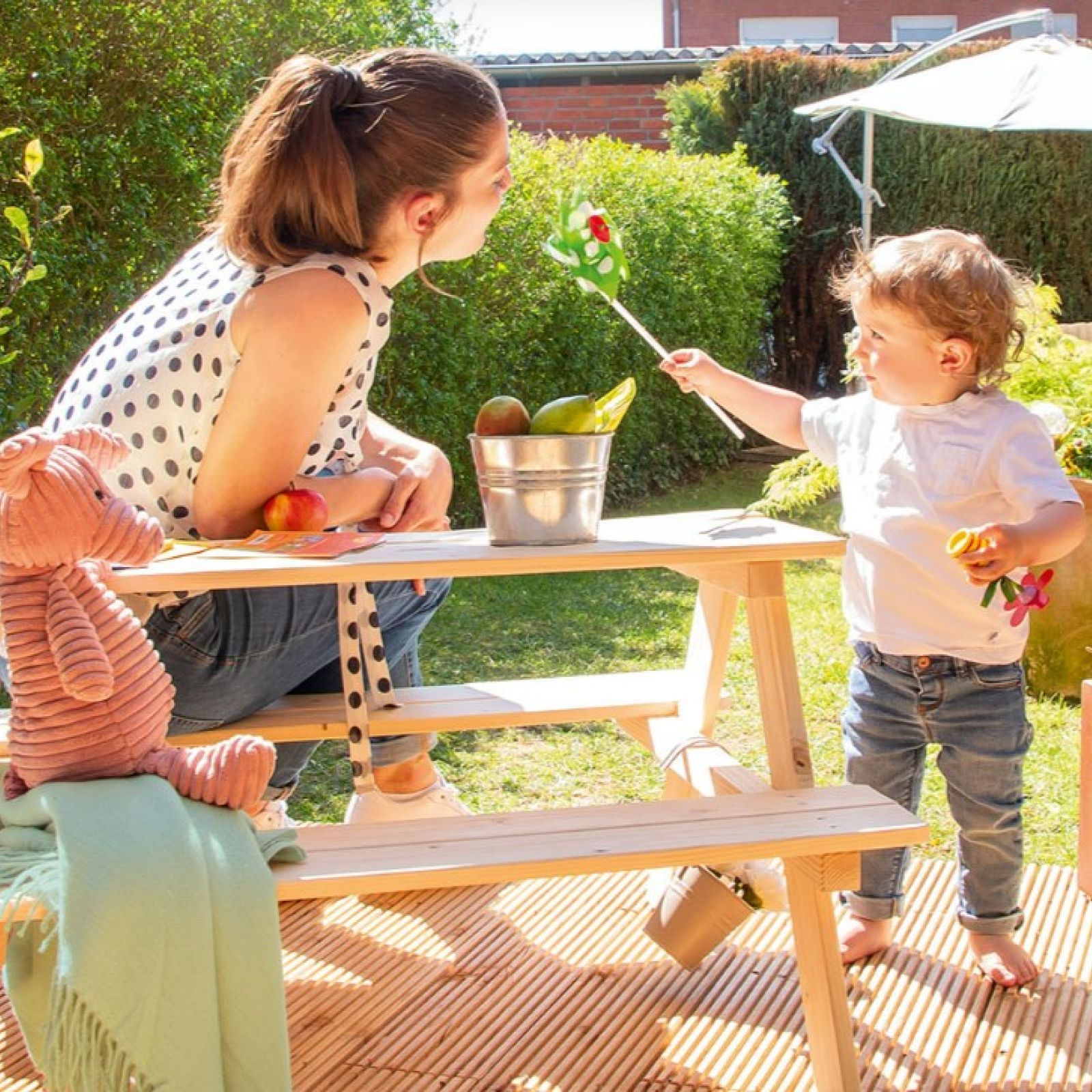 Детская столовая группа из массива дерева подойдет для активного отдыха в саду или на террасе: игр, еды или просто наслаждения солнцем. Если дополнительно приобрести мягкие накладки на лавочки, столик превратиться в самое уютное место для Вашего малыша.