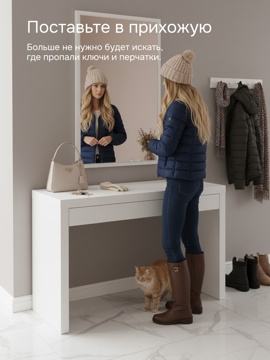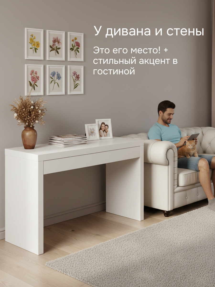 Стол отлично впишется в скандинавский стиль. Белая консоль освежит интерьер и зрительно расширит пространство. Особенно важно это в помещениях, выходящих на северную сторону, а также в помещениях, в которые поступает мало солнца. Белый цвет способен улучшать настроение за счет воспроизведения теплового диапазона солнечных лучей. Отсутствуют лишние элементы, которые цепляют взгляд. Это позволяет вписаться и в другие стили: стиль минимализм, лофт, в классический и в современный стиль.