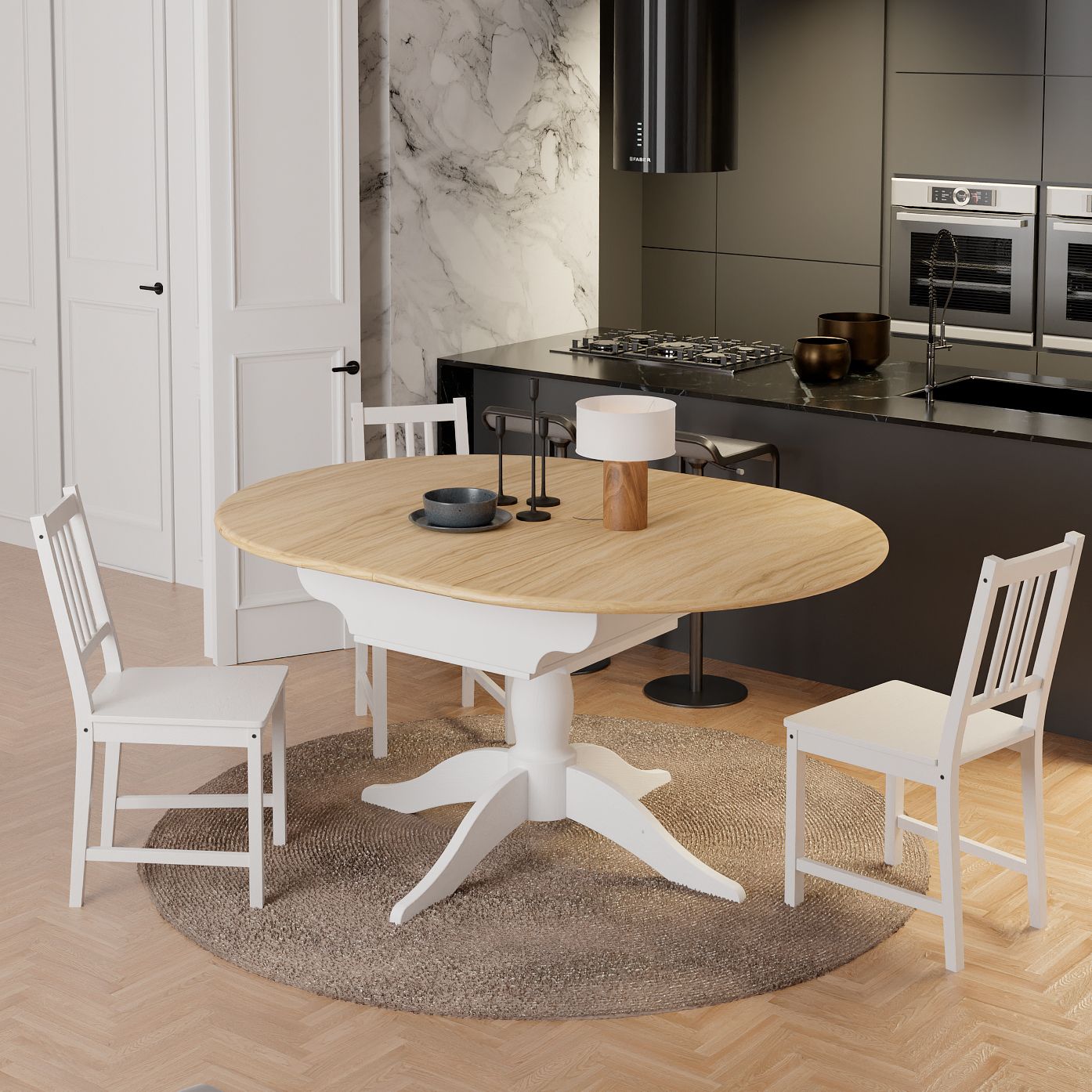 Он прекрасно сочетается с различными типами мебели и аксессуаров, идеально дополняя как классический, так и современный интерьер. Для создания гармоничного образа рекомендуем сочетать его с белыми деревянными стульями или мягкими креслами.