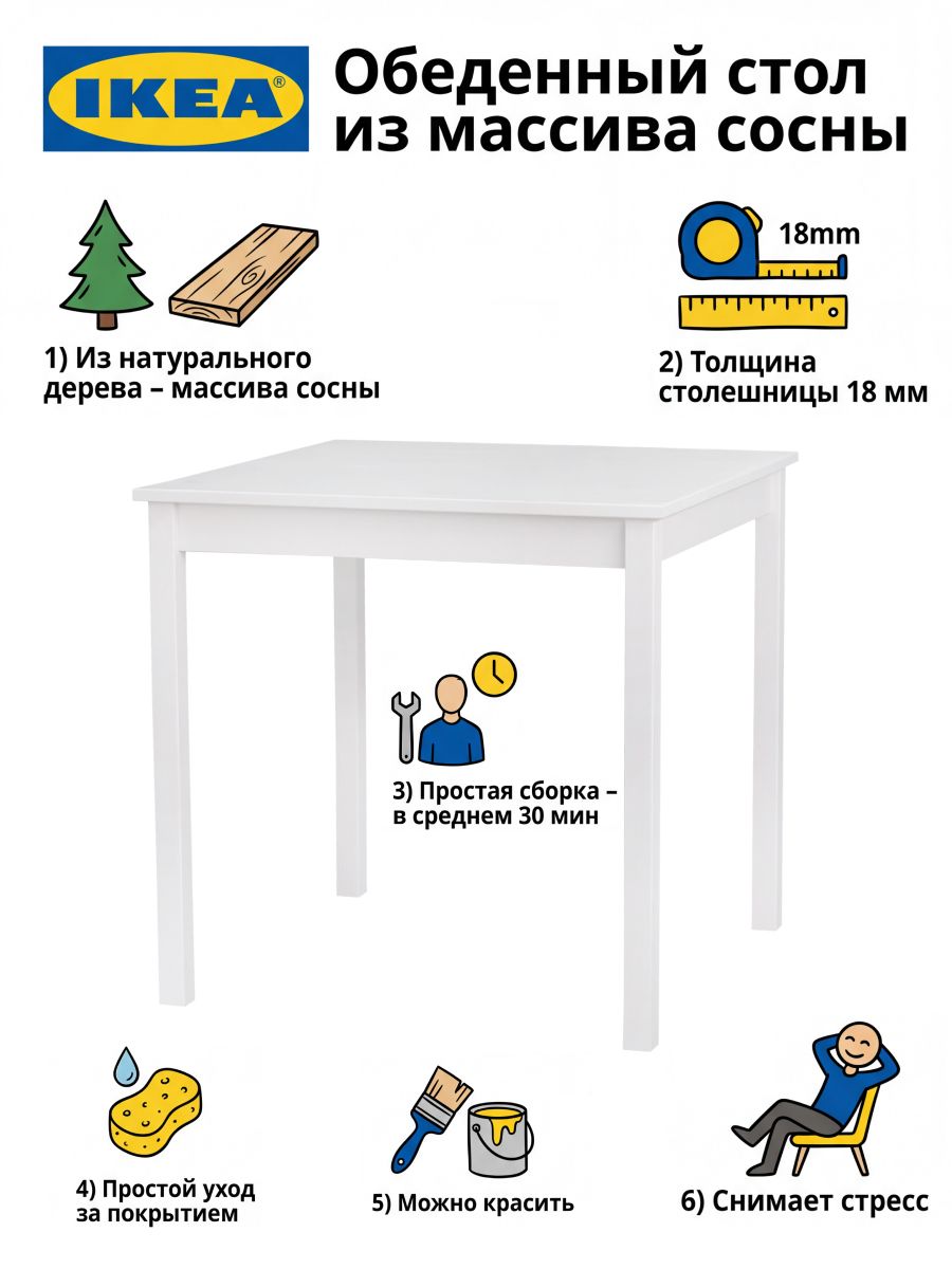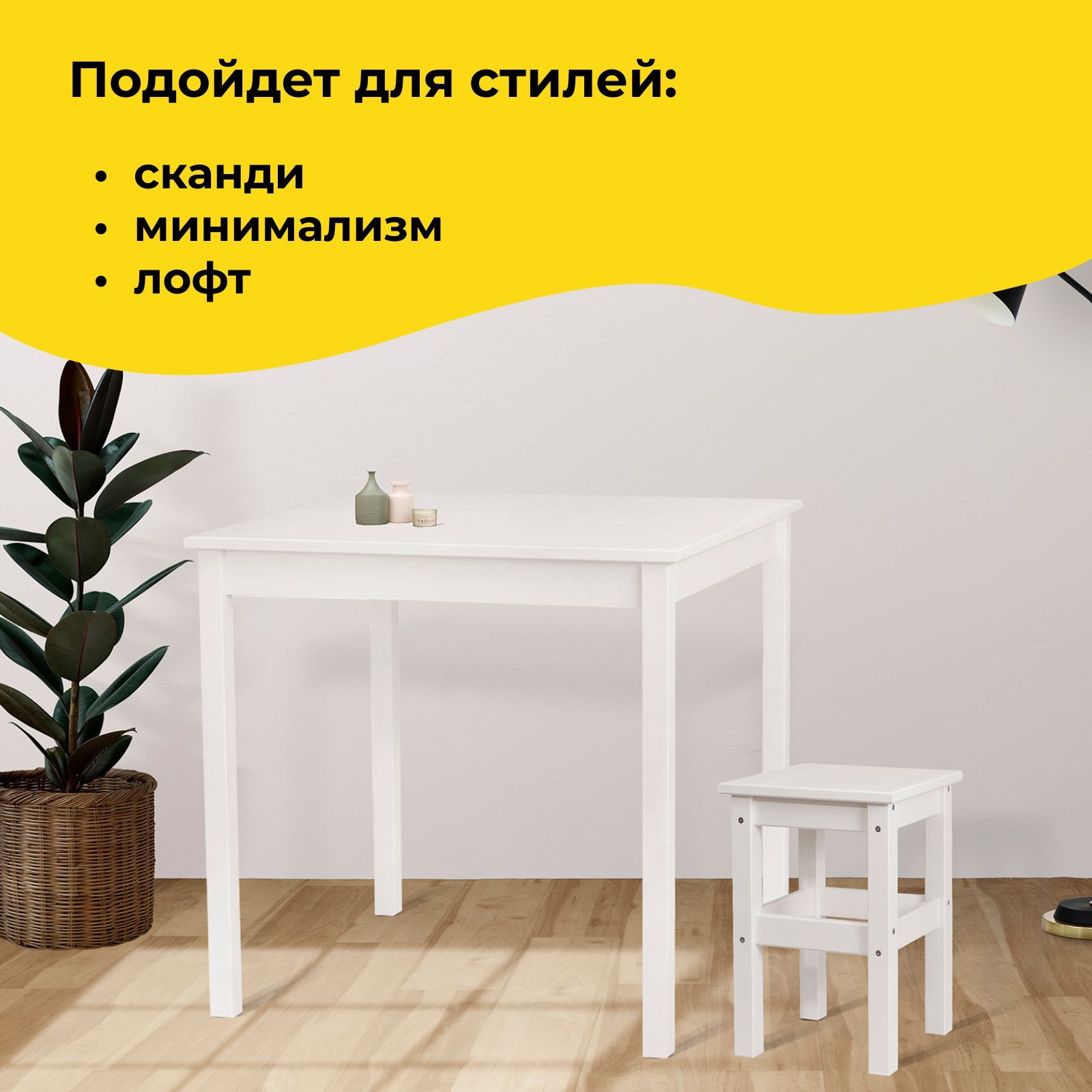 Дополните вашу кухню стильным и функциональным кухонным столом белого цвета из массива сосны с покрытием из натурального воска. Обеденный стол размером 75х75 см станет идеальным дополнением для вашего интерьера, подходящим не только для кухни, но и для прихожей, ванной комнаты, коридора, спальни, детской комнаты, балкона, дачи или офиса. Если вы установите столы в школе, библиотеке, детском центре или геймерском клубе для школьников, то стол универсальный превратится в стол компьютерный, письменный или игровой. Стол хорошо подходит для компьютера – размер столешницы и квадратная форма позволяет установить монитор или ноутбук любого размера. Благодаря своим компактным размерам, этот кухонный стол идеально подойдет для небольших пространств, максимизируя функциональность вашего помещения. Он также предлагает достаточно места для уютных семейных обедов или дружеских посиделок. Кроме того, стол для кухни легко собирается за счет понятной инструкции и необходимой фурнитуры в комплекте. Толщина столешницы - 18 мм, расстояние между ножками 640 мм. Сечение ножки - 40х40 мм. Кроме того, стол для кухни легко собирается за счет понятной инструкции и необходимой фурнитуры в комплекте.