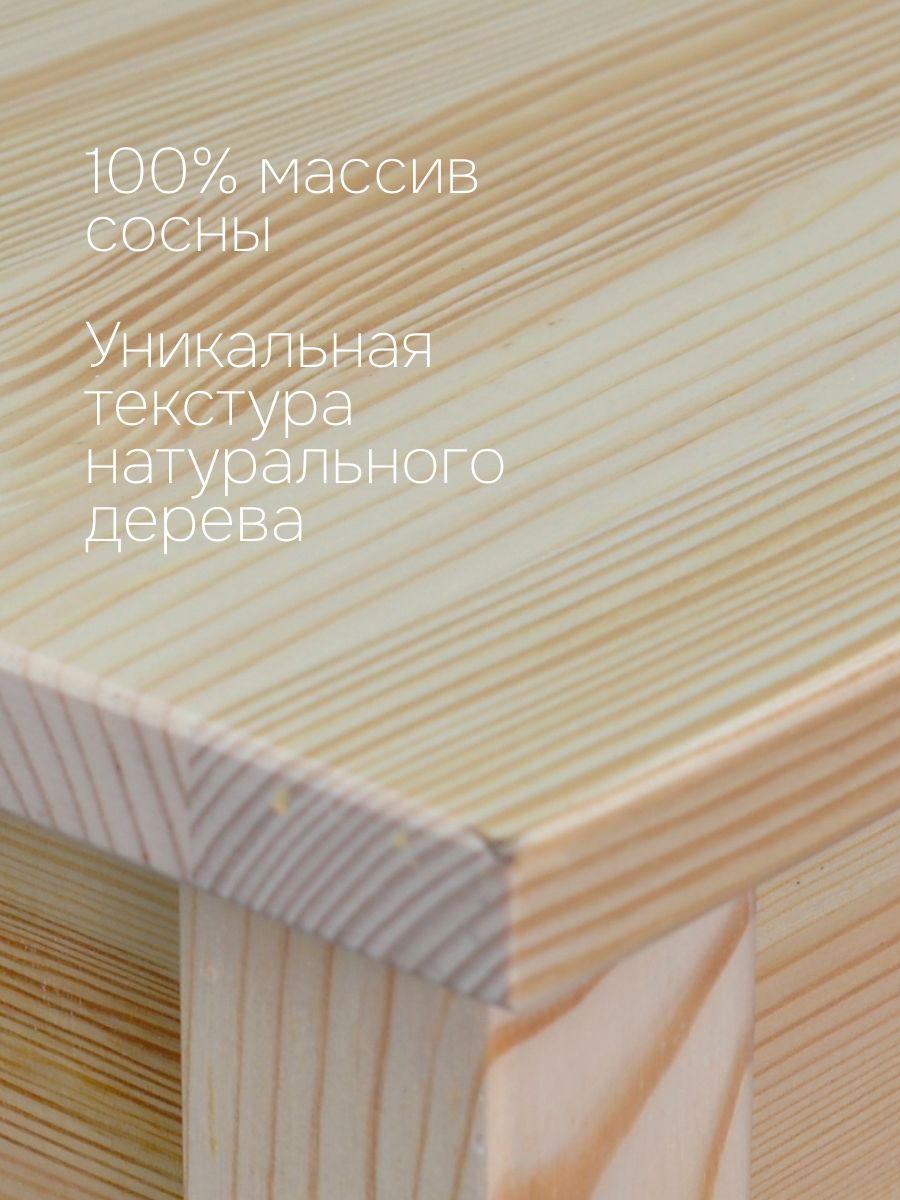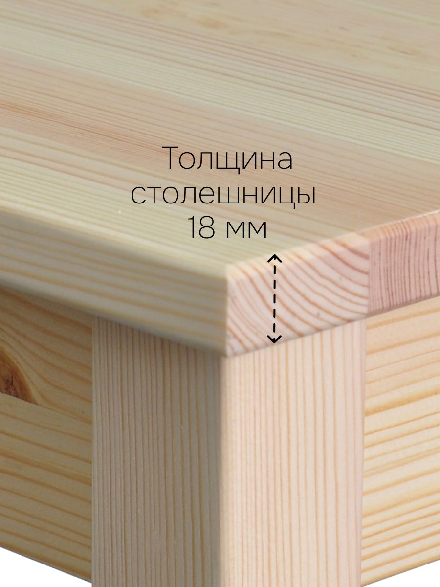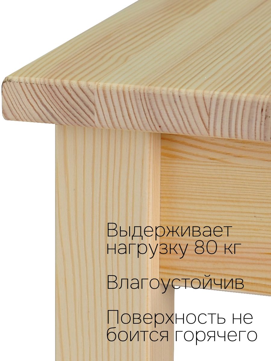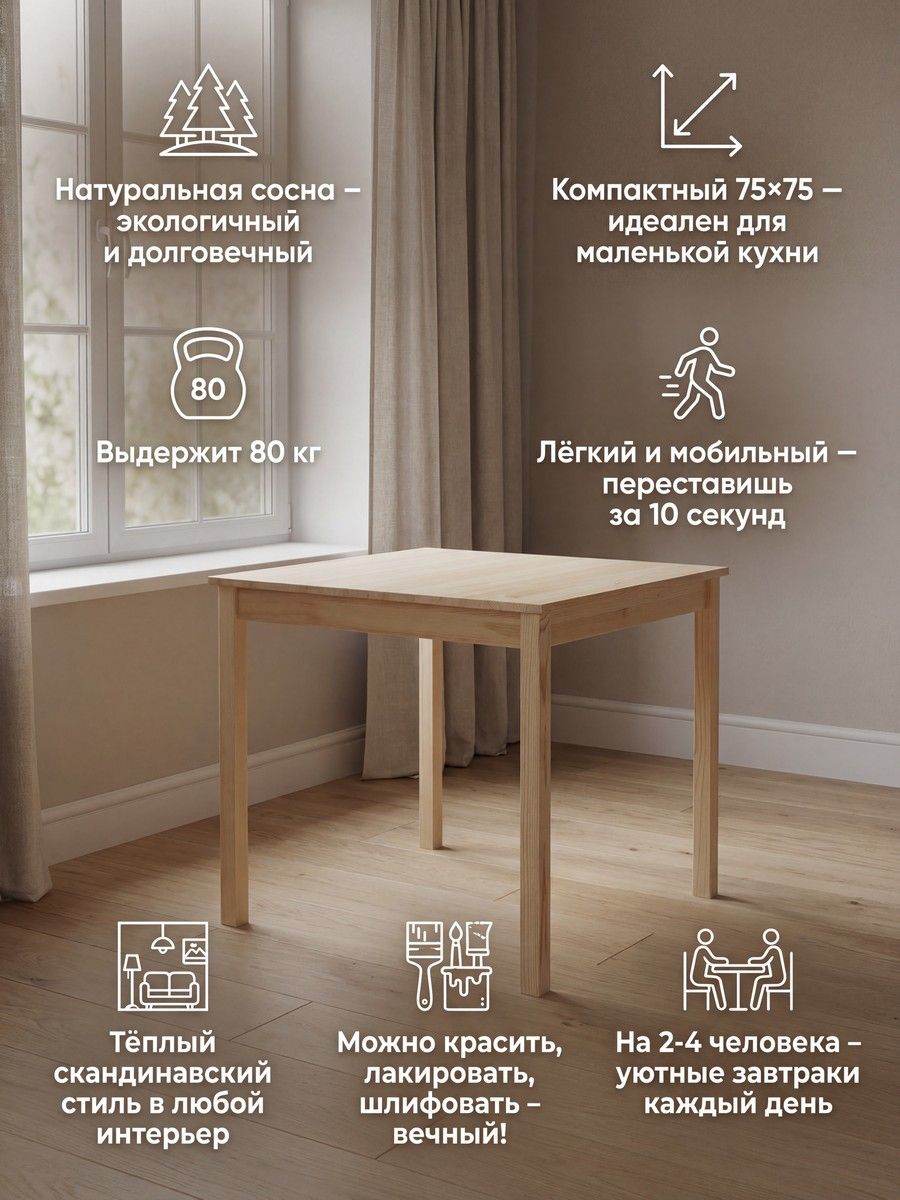 Натуральная текстура сосны без отделки позволяет легко покрасить или брашировать стол под свой вкус, создавая индивидуальный стиль. Это универсальный кухонный стол, который идеально впишется не только на кухню, но и в прихожую, ванную, спальню, детскую, на балкон, дачу или даже в офис. В школе, библиотеке или геймерском клубе он станет отличным письменным столом, компьютерным столом или игровым — квадратная форма 75×75 см легко вместит ноутбук любого размера, монитор или тетради.