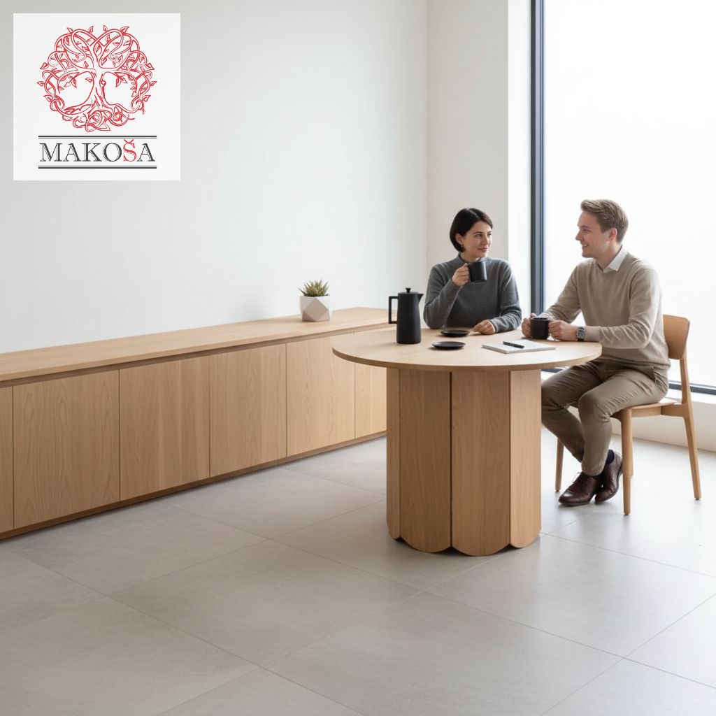 Бренд Makosa и производитель Dipriz представляют дизайнерский стол «Кордо» — идеальное сочетание скандинавской эстетики, функциональности и современного дизайна. Круглая столешница диаметром 95 см из дубового шпона в теплом золотисто-бежевом оттенке станет элегантным акцентом вашего интерьера.