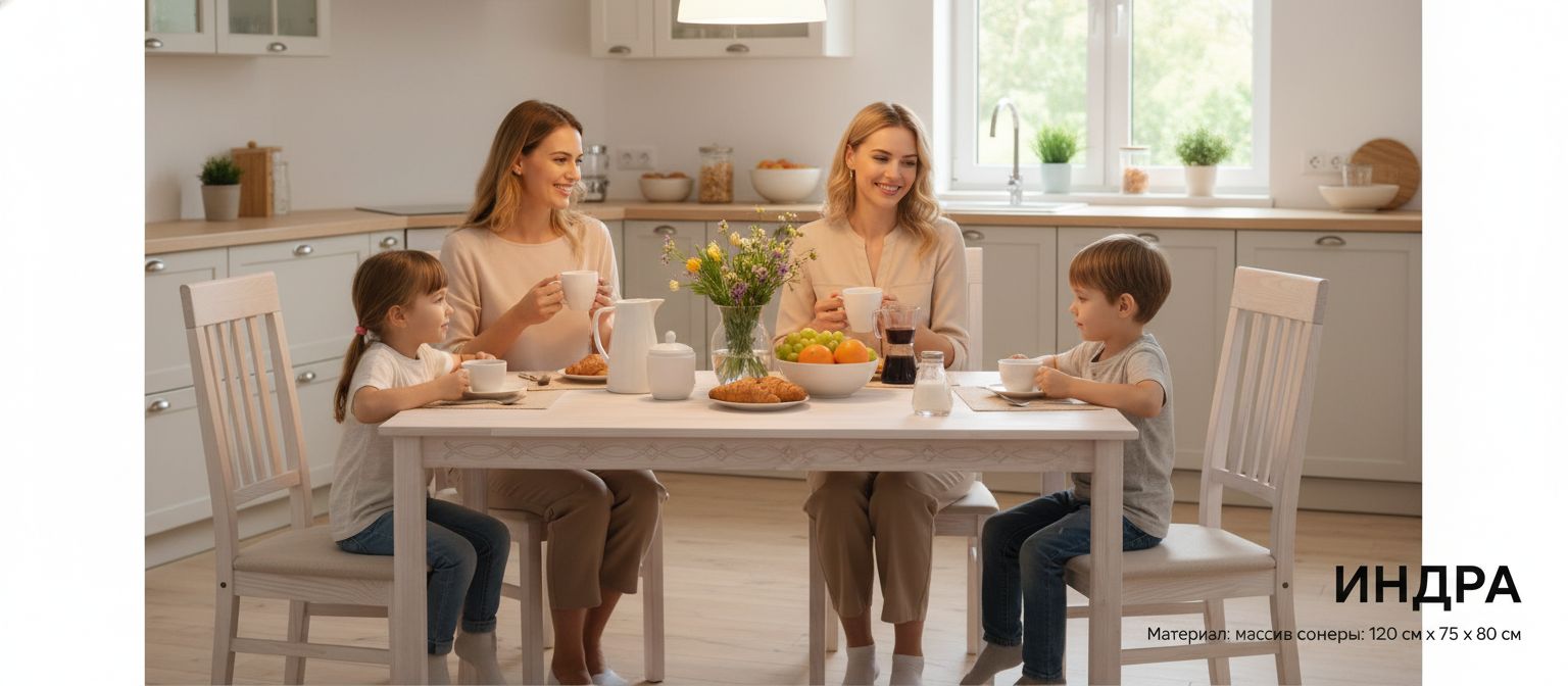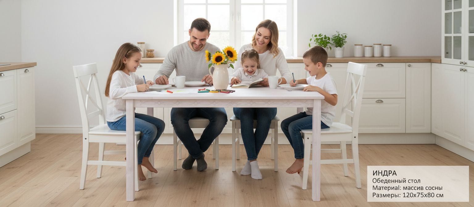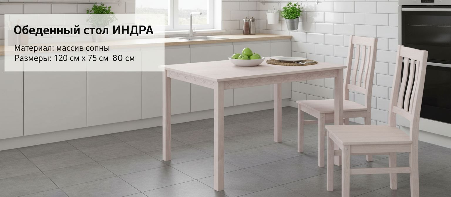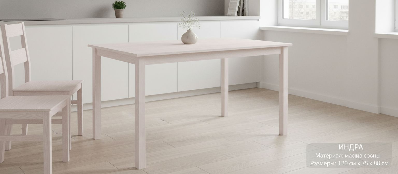 Обеденный стол Индра от белорусского производителя "Диприз" в элегантном белом цвете — это идеальное решение для создания современного уюта в вашем доме. Выполненный из натурального массива сосны, стол сочетает в себе экологичность и стиль. Его лаконичные линии и скандинавский дизайн прекрасно впишутся в любое пространство, даже в самых малогабаритных кухнях.