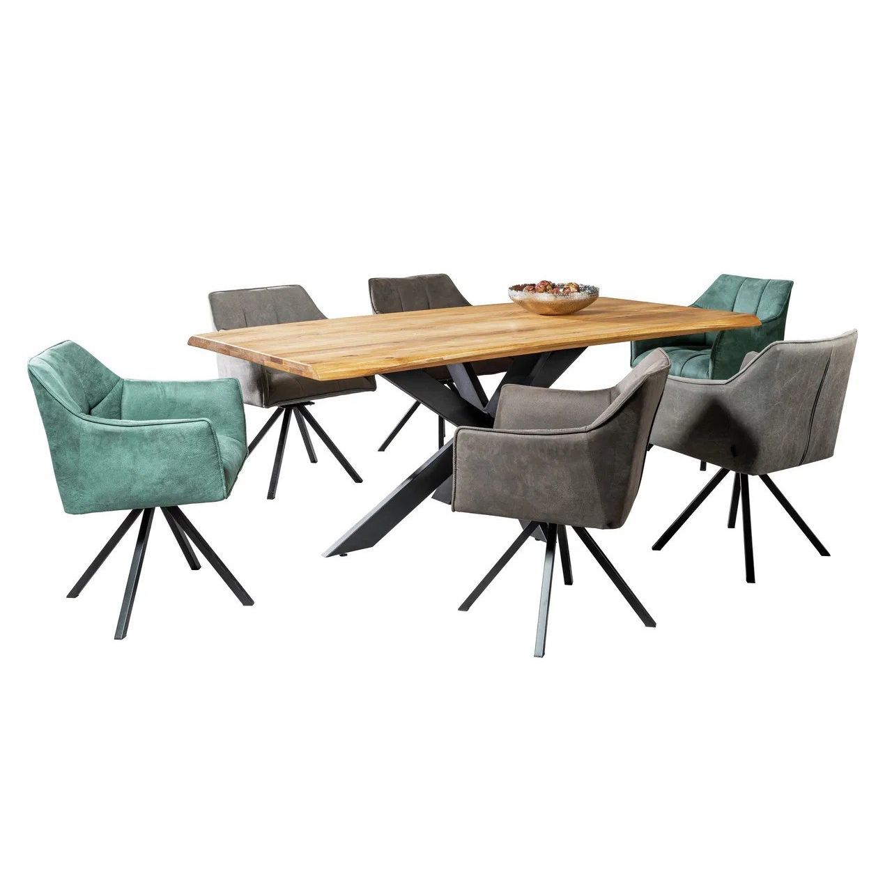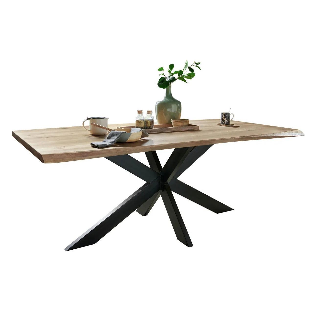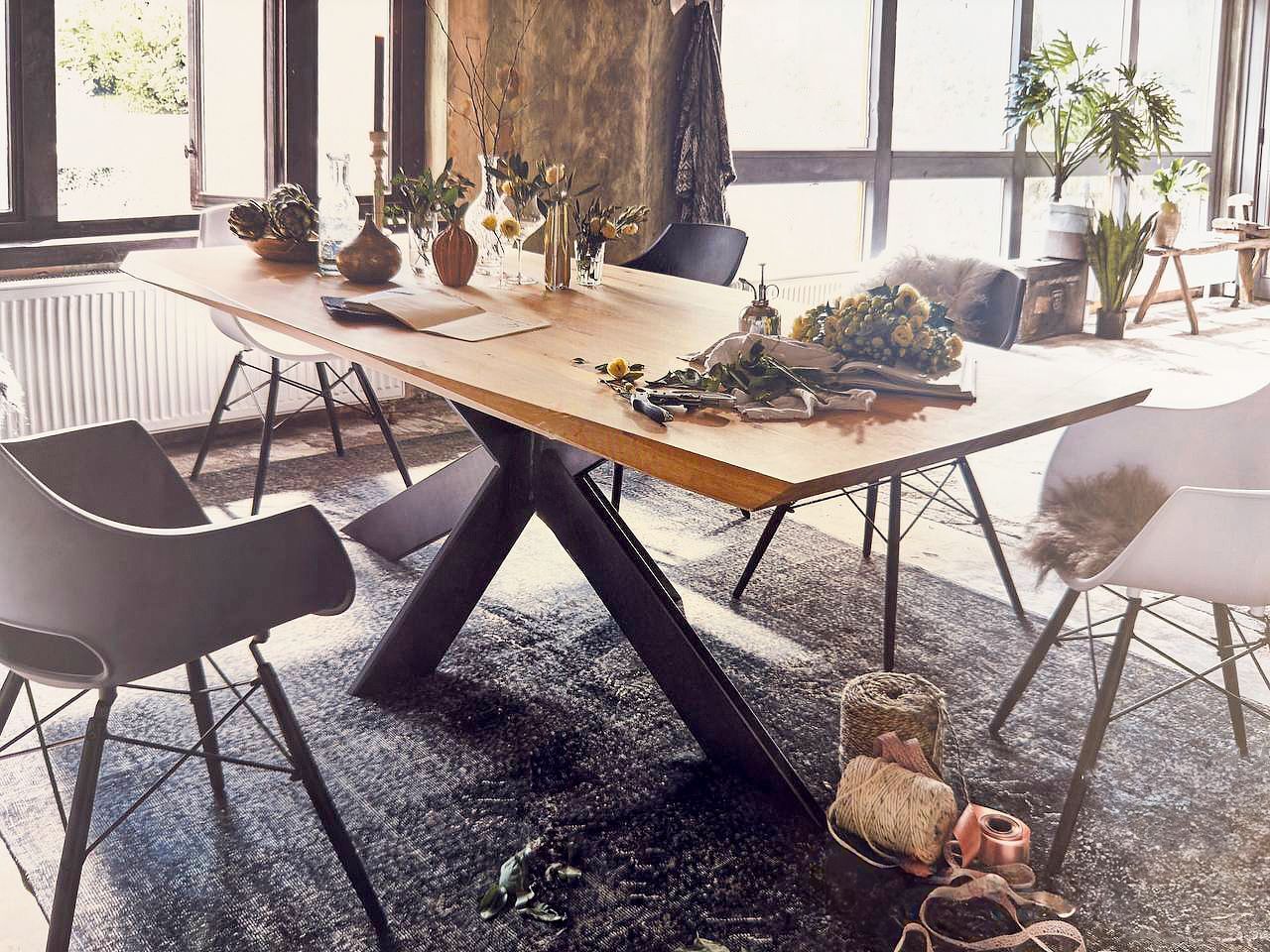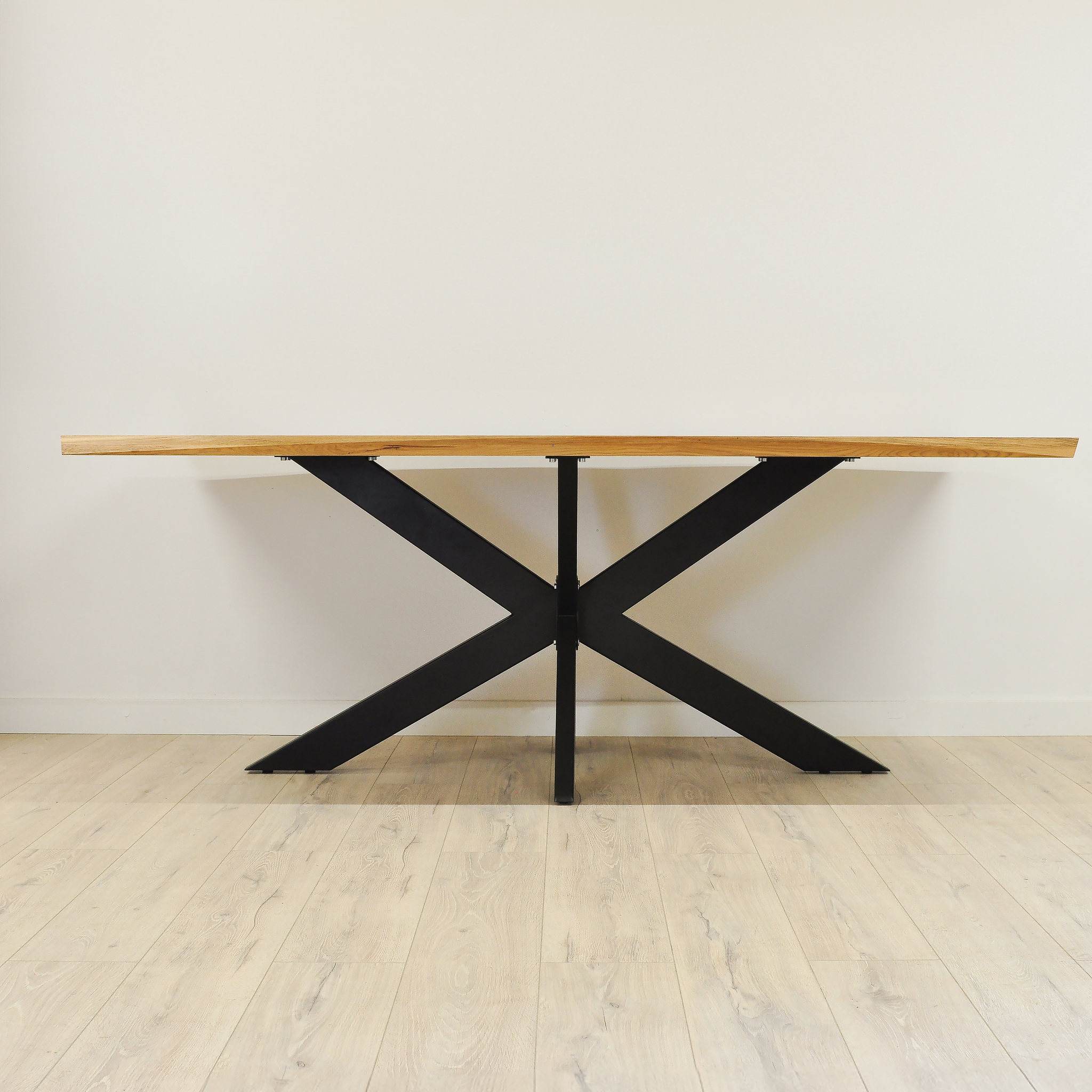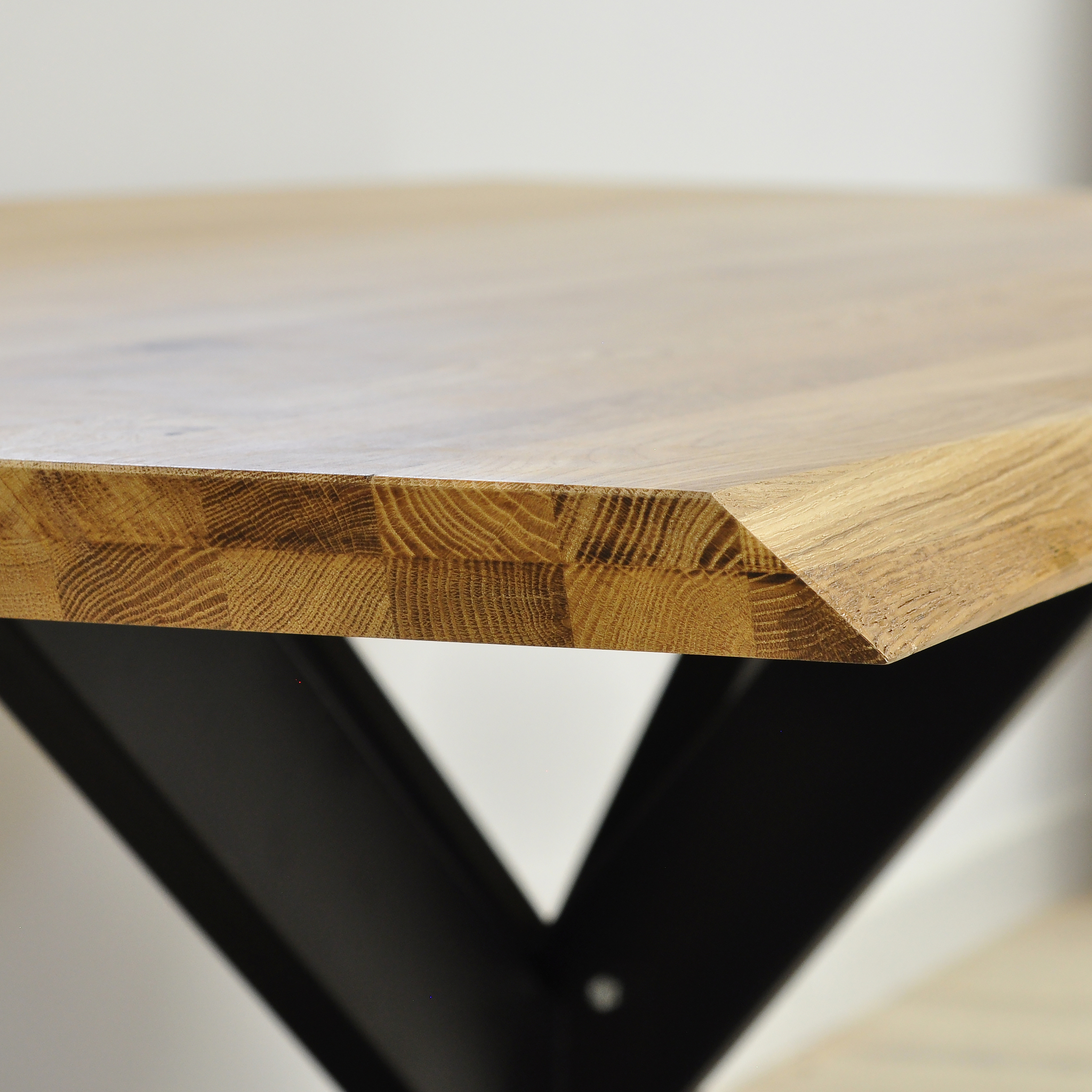 Особое внимание заслуживают ножки обеденного стола. Они выполнены из прочного металла и имеют сложную, но гармоничную структуру, которая создает впечатление легкости и устойчивости одновременно. Эти ножки, словно произведение искусства, добавляют современный индустриальный акцент, идеально дополняя благородство дубовой столешницы.