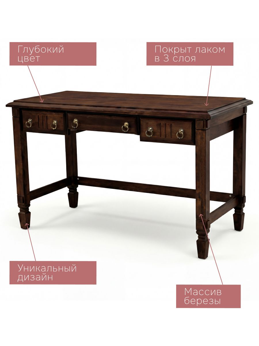Прочный деревянный стол идеально сочетает функциональность и стиль благодаря массиву берёзы и лакированному покрытию. Тёмно-коричневый дизайн гармонично дополнит интерьер в духе неоклассики или скандинавского минимализма. Компактные размеры обеспечивают комфортную работу даже в маленькой комнате, а три вместительных ящика с бесшумными скрытыми направляющими помогут организовать рабочее место.