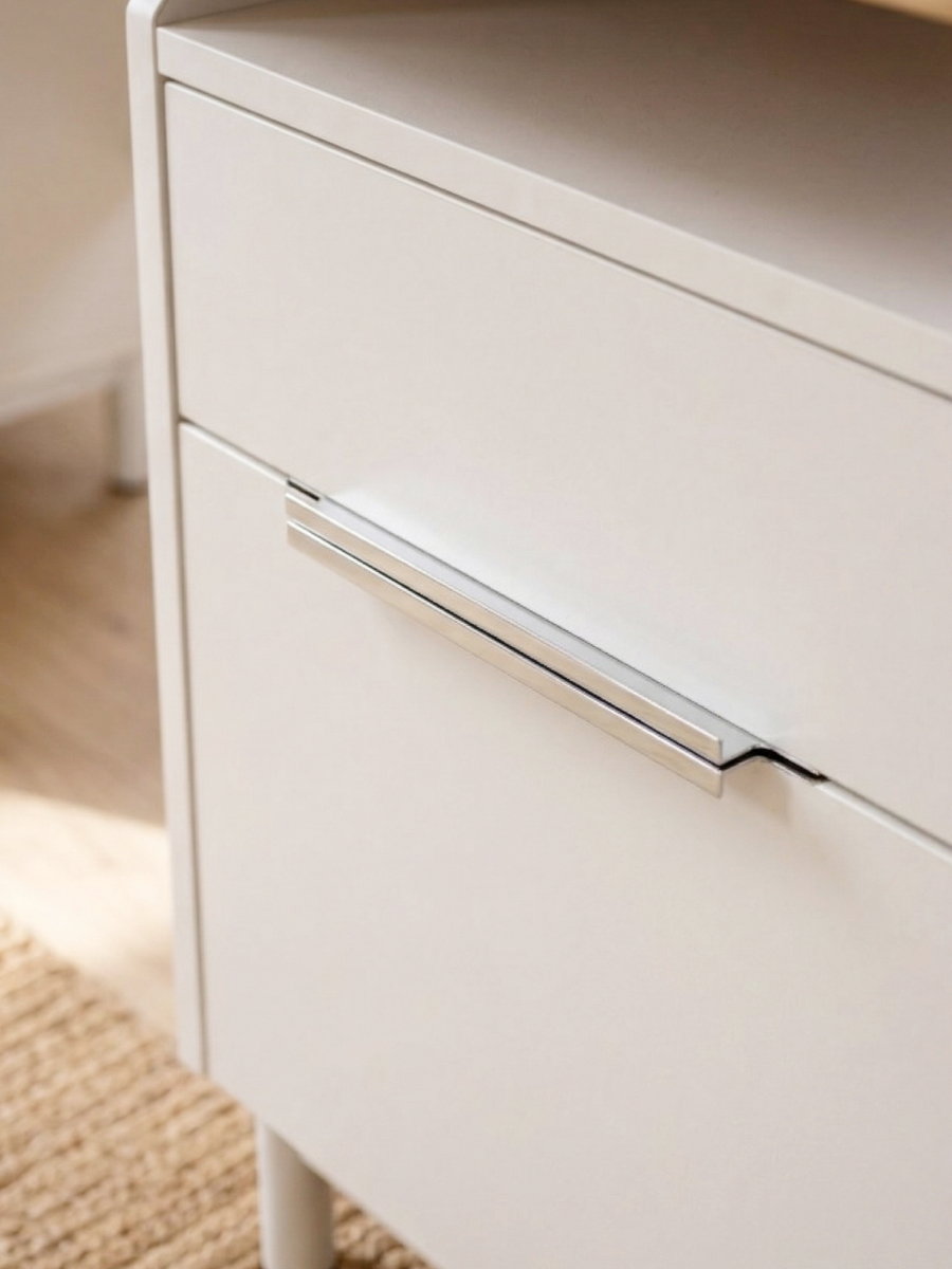 - Фурнитура: Ящики с плавными доводчиками и дизайнерскими ручками для бесшумного и комфортного использования.