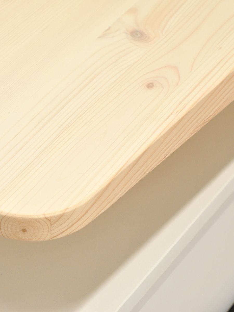 - Столешница: Из массива сосны, покрыта экологичным белесым лаком. Лак мягко тонирует древесину, сохраняя видимой её живую текстуру, и создает ощущение светлого северного интерьера.