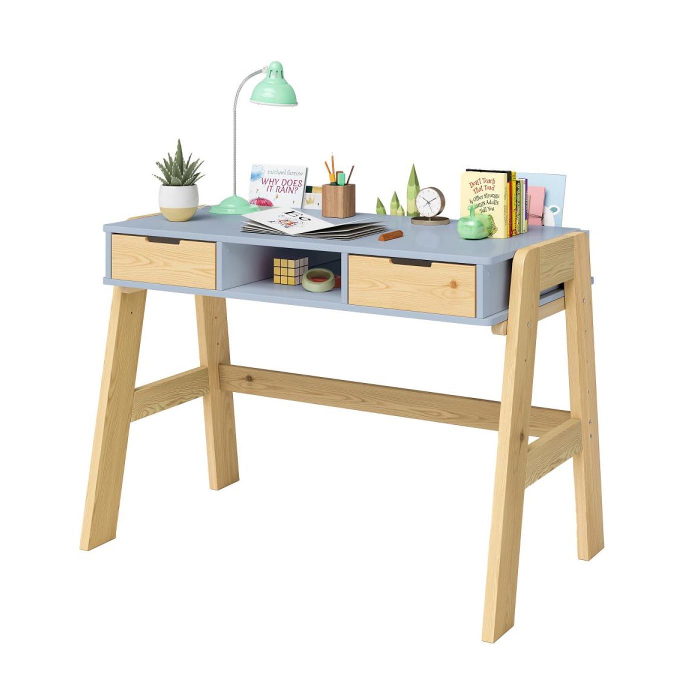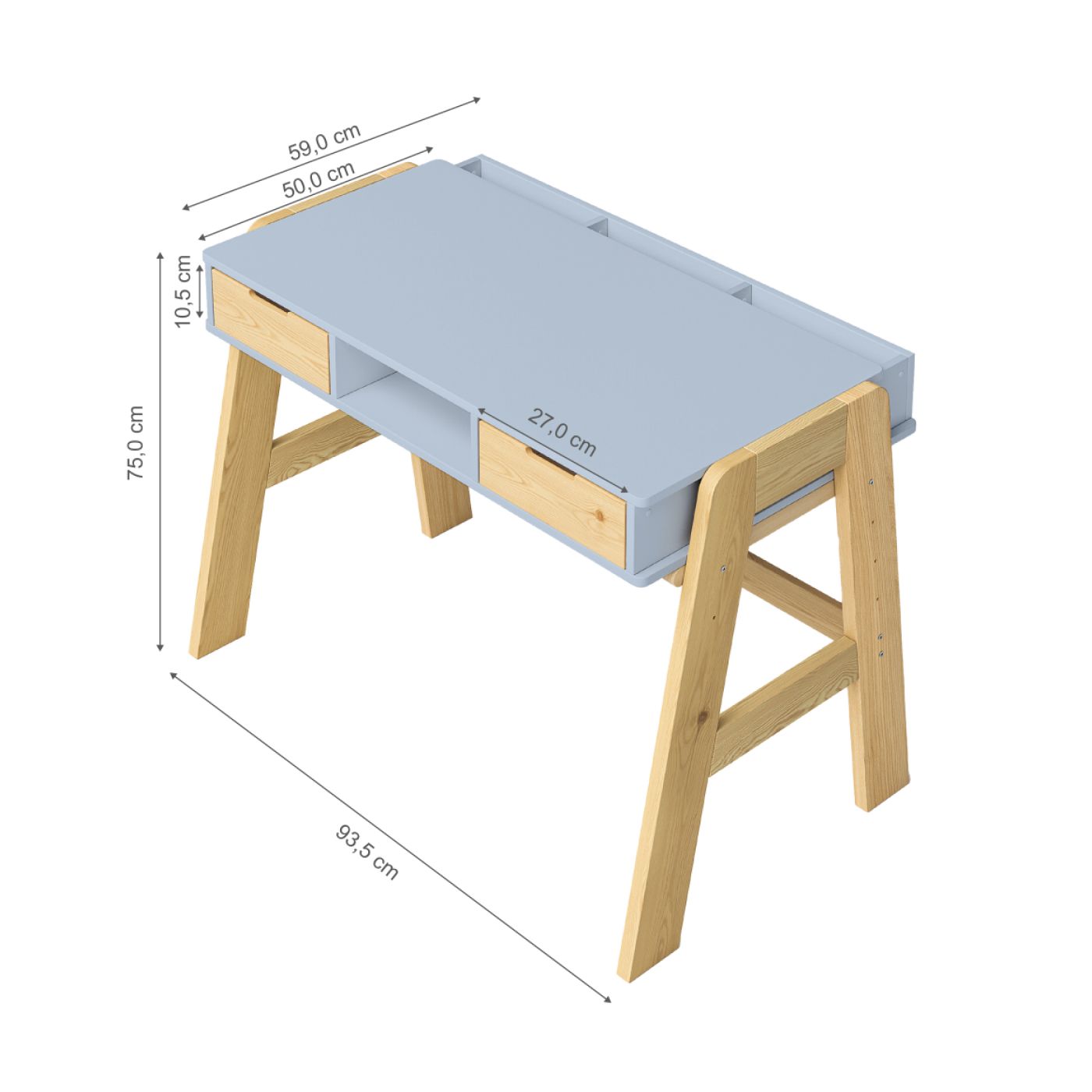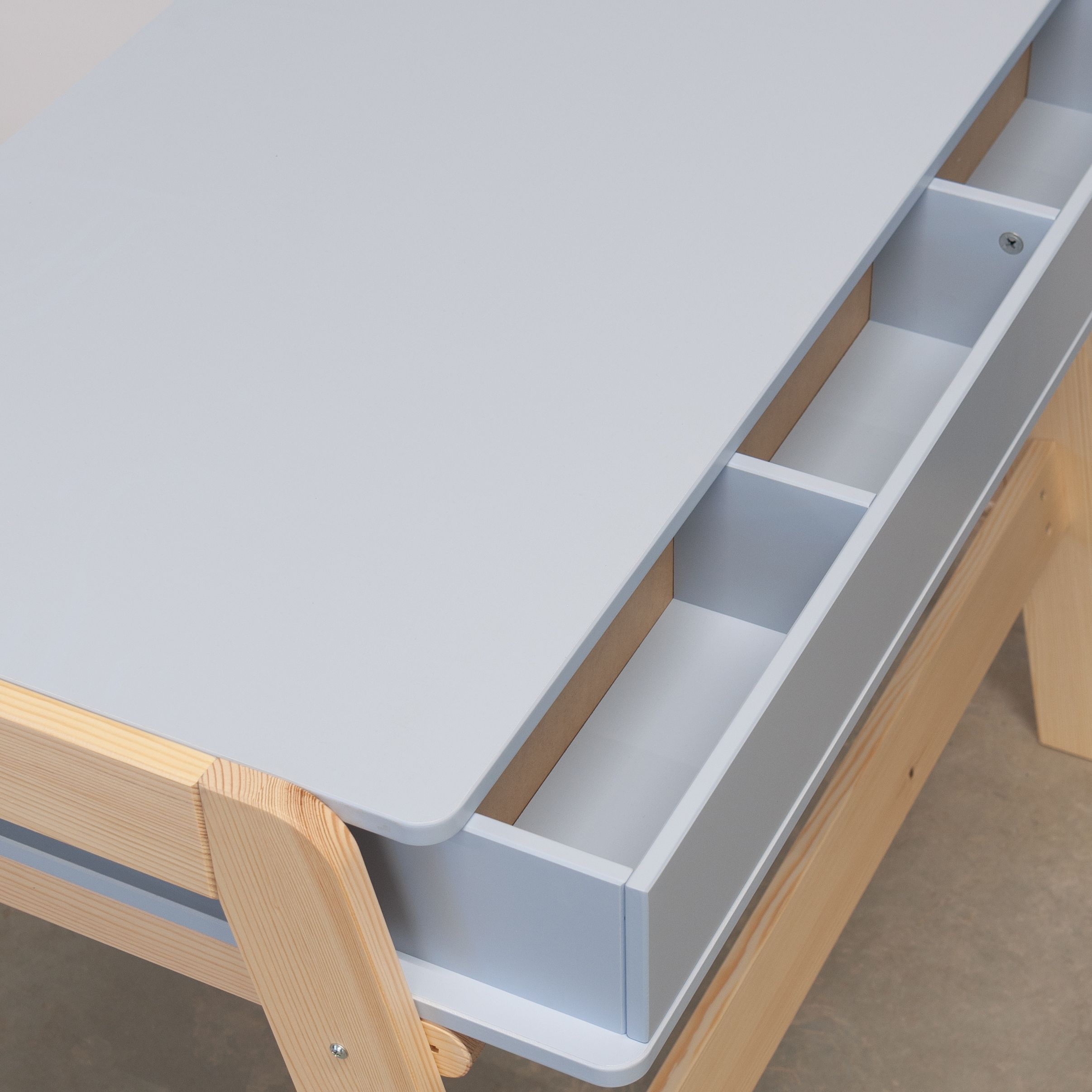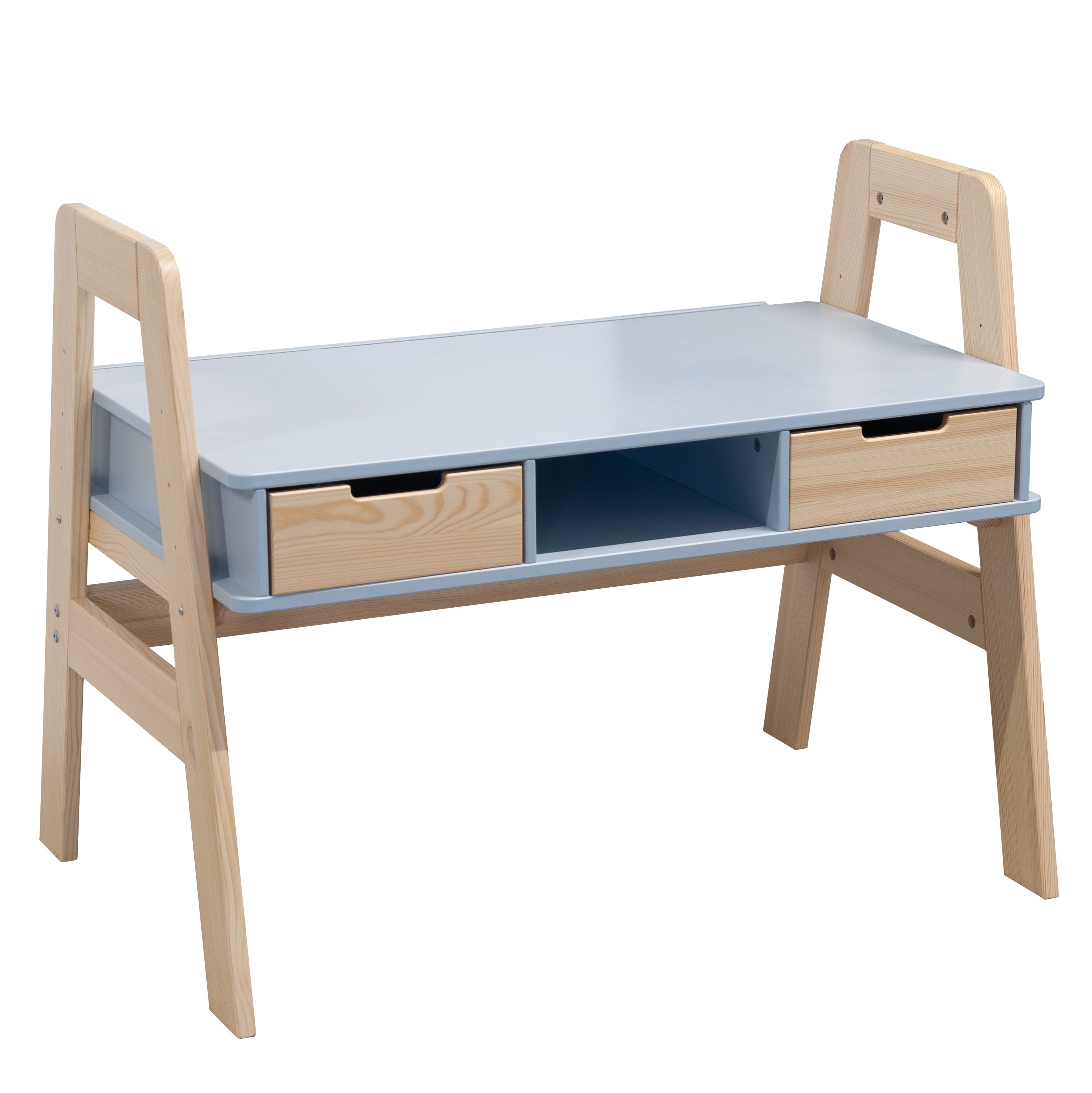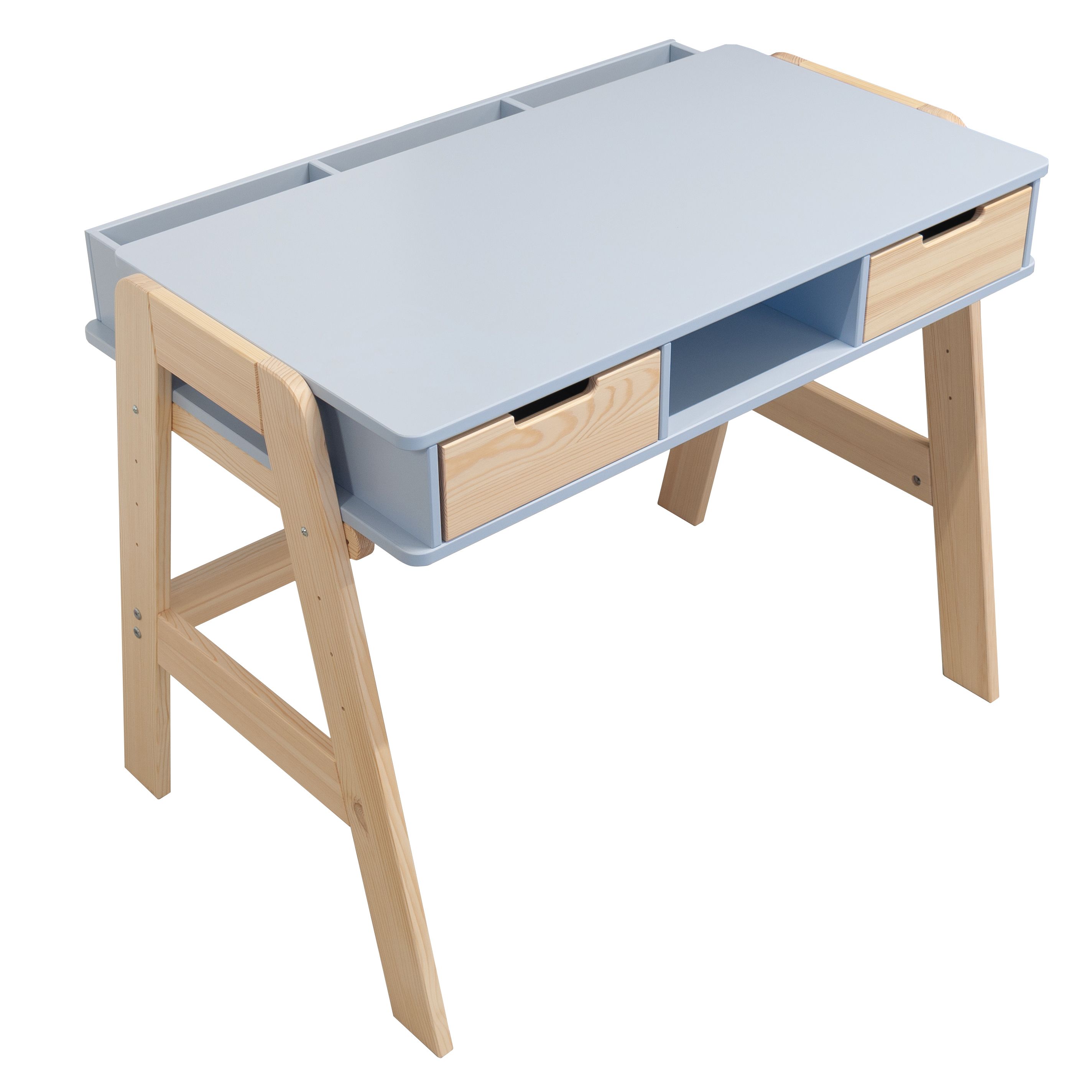 Парта «Чек» также учитывает организацию пространства и хранения. Она оснащена двумя выдвижными ящиками, удобно расположенными под письменной поверхностью, а также имеет просторный отсек для книг. Три отсека для канцелярских принадлежностей, расположенные на задней стороне стола, обеспечивают удобное хранение всех необходимых мелочей, что позволяет избежать их потери.