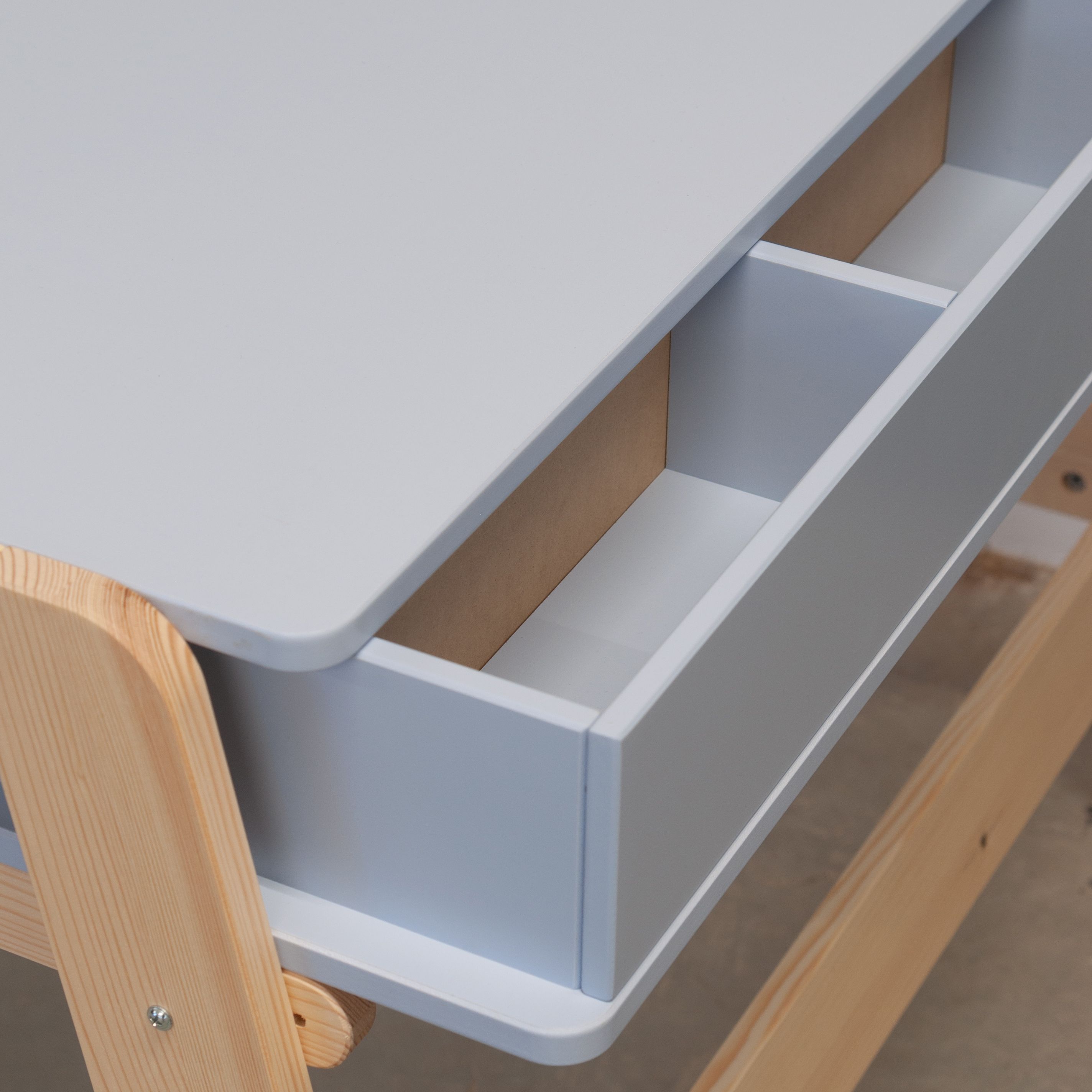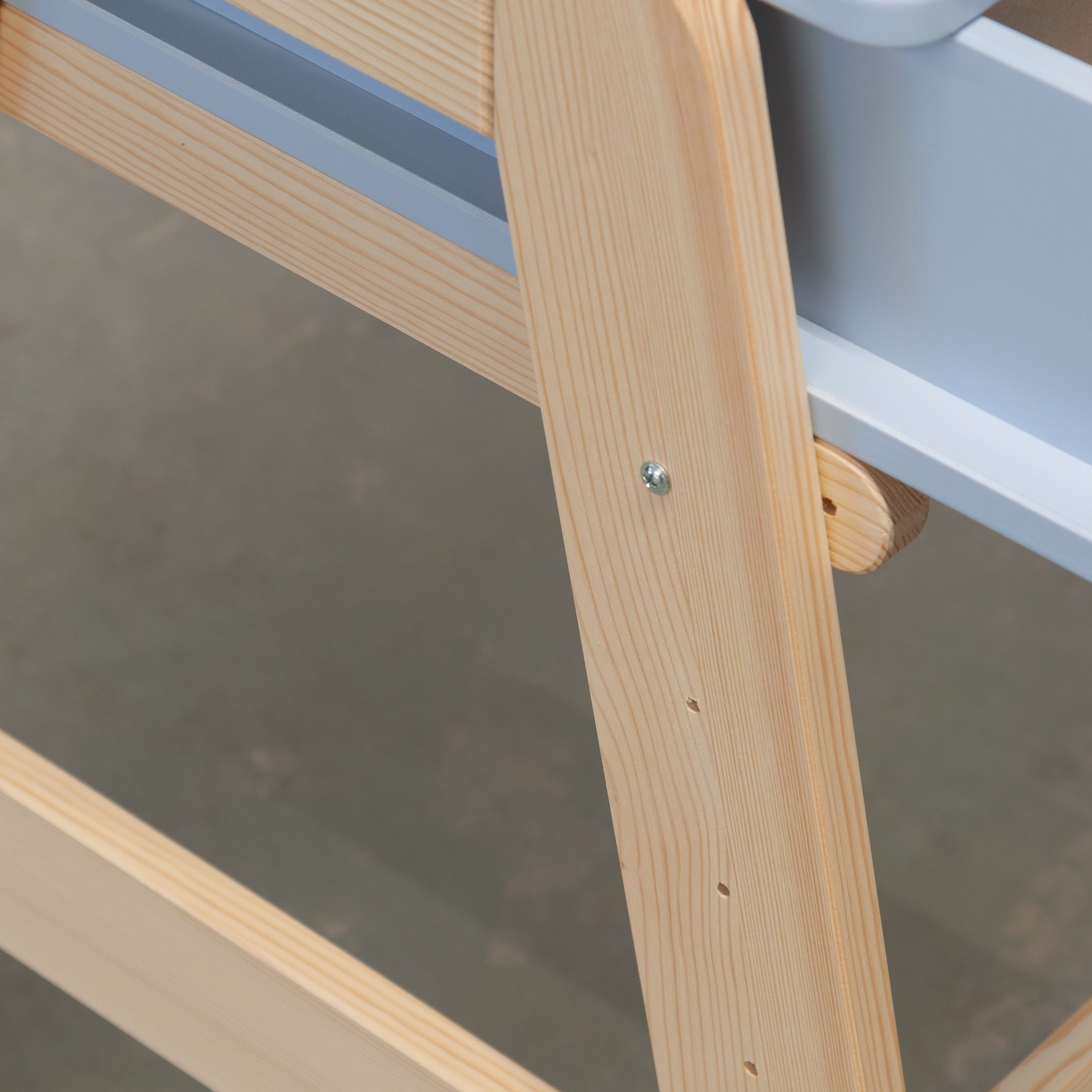 Дизайн парты отличается стойкостью к царапинам, благодаря высококачественному МДФ, используемому для поверхности. Ножки парты изготовлены из натурального массива сосны, что добавляет модели сдержанную элегантность. Благодаря всему этому, растущая парта «Чек» не только эффективно служит инструментом обучения, но и становится прекрасным элементом интерьера вашей домашней обстановки.