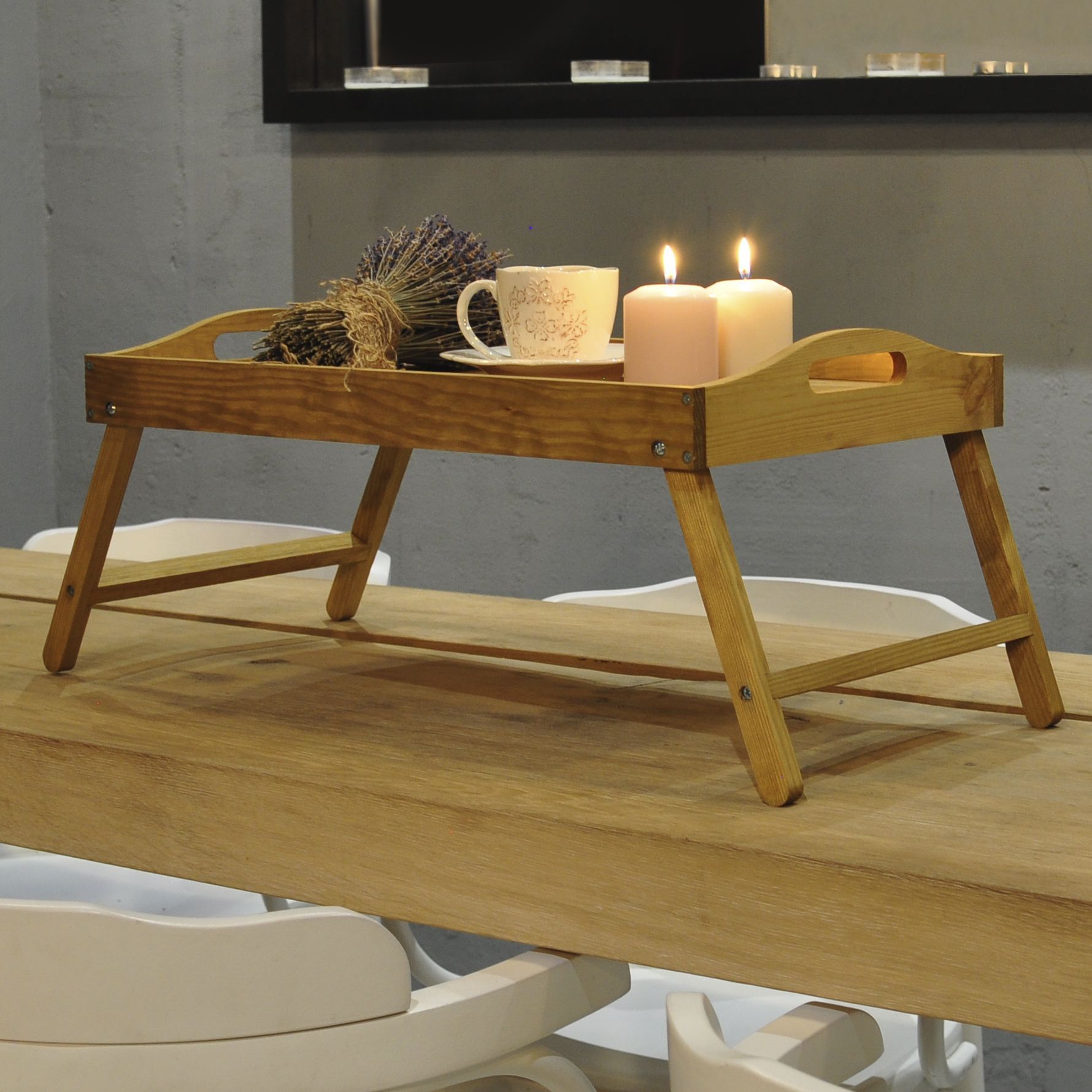 Столик поднос оптимальный по размеру, быстро складывается, его можно перенести в любое место. Его можно использовать как столик для завтрака в постель, винный столик на кровать, столик для ноутбука. Декоративный поднос на ножках будет полезен в детской, на нем можно разложить игрушки, пластилин, поделки или сладости и фрукты для малыша. Можно удобно расположиться на диване, кровати или в кресле с ноутбуком или планшетом. Наличие невысокого бортика предотвращает вытекание пролитой жидкости и соскальзывание предметов. Деревянный поднос для очень удобный и мобильный. В сложенном виде он не займет много места в Вашем доме или машине, позволит органично и элегантно дополнить Ваш пикник.