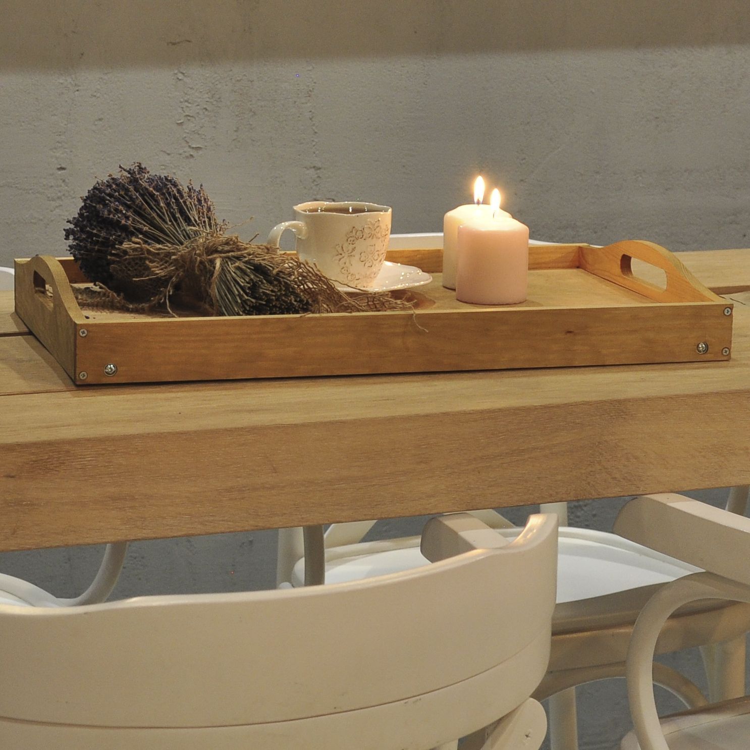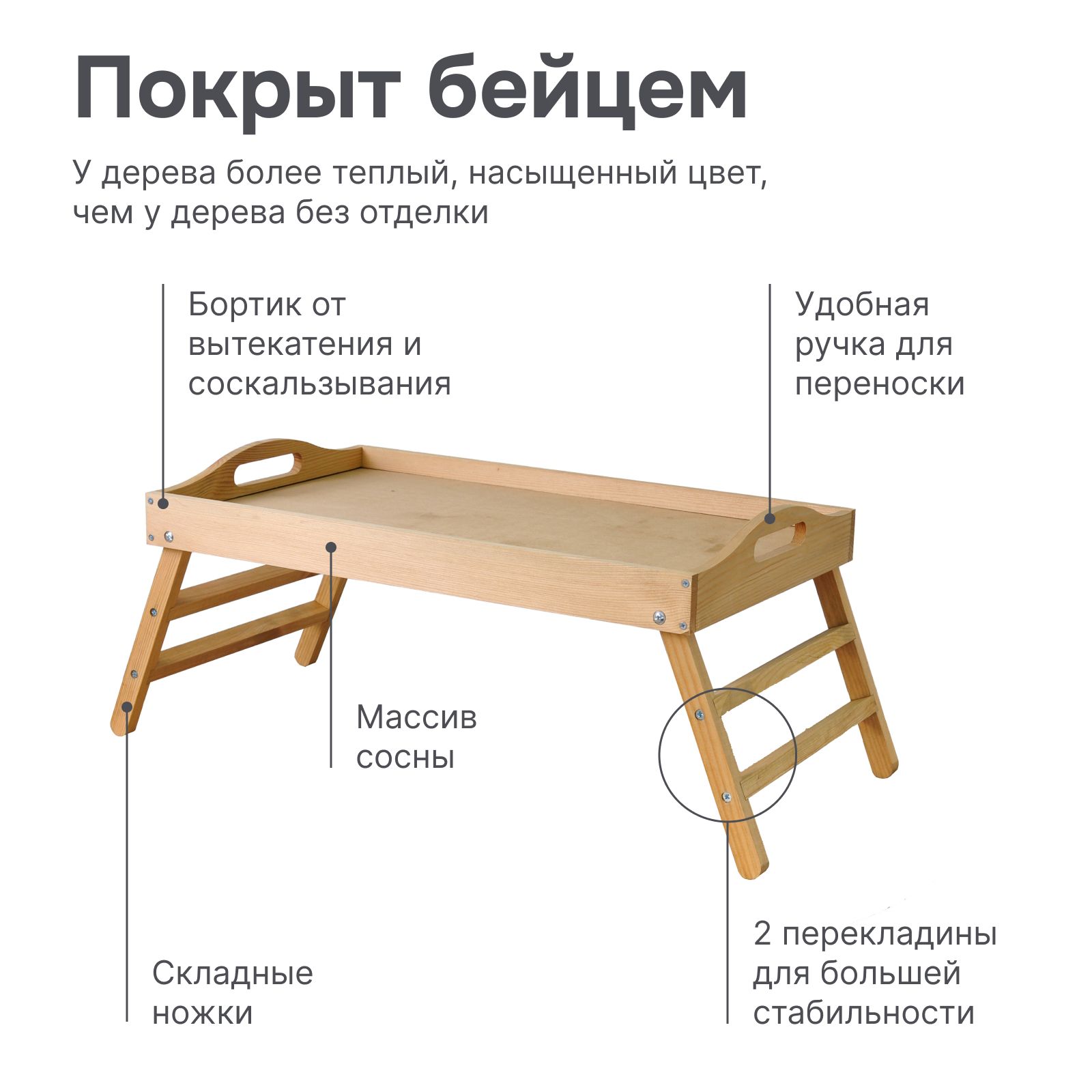 Столик поднос для завтрака сделан из натурального материала - массива сосны. Наша продукция экологичная и безопасная, благодаря используемым в производстве натуральным материалам. Поднос прост в уходе и долговечен. Деревянный поднос с ручками и бортиками, устанавливается на крепкие, устойчивые ножки.