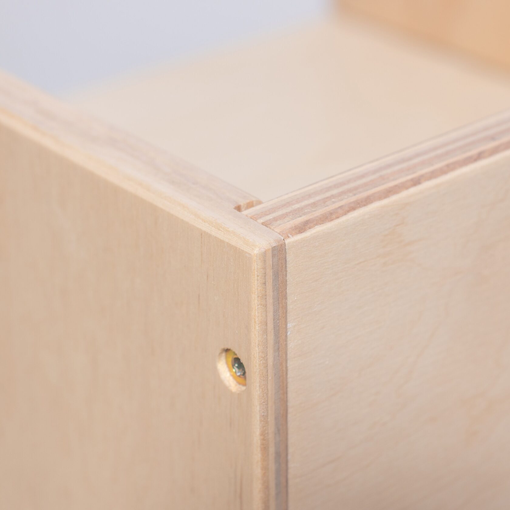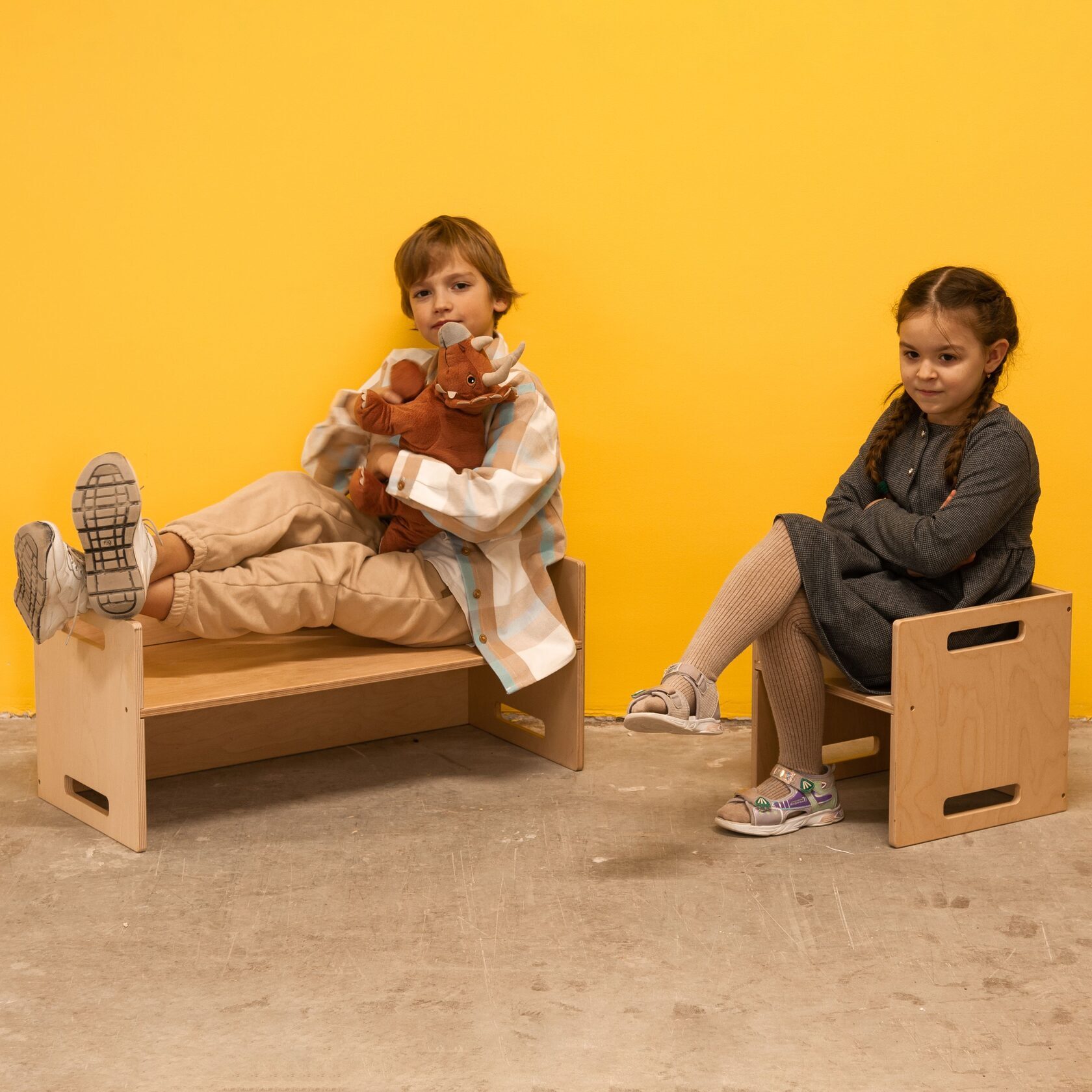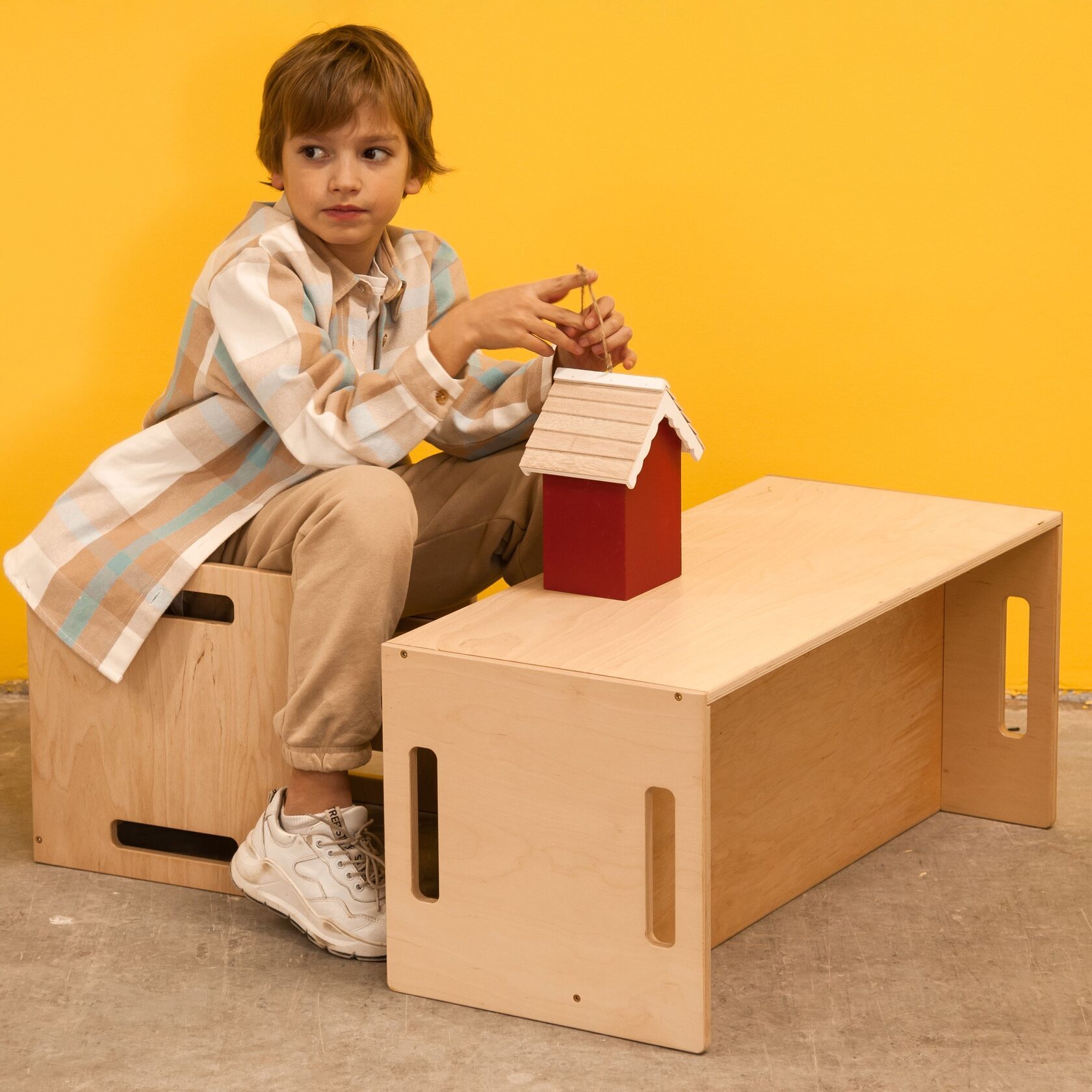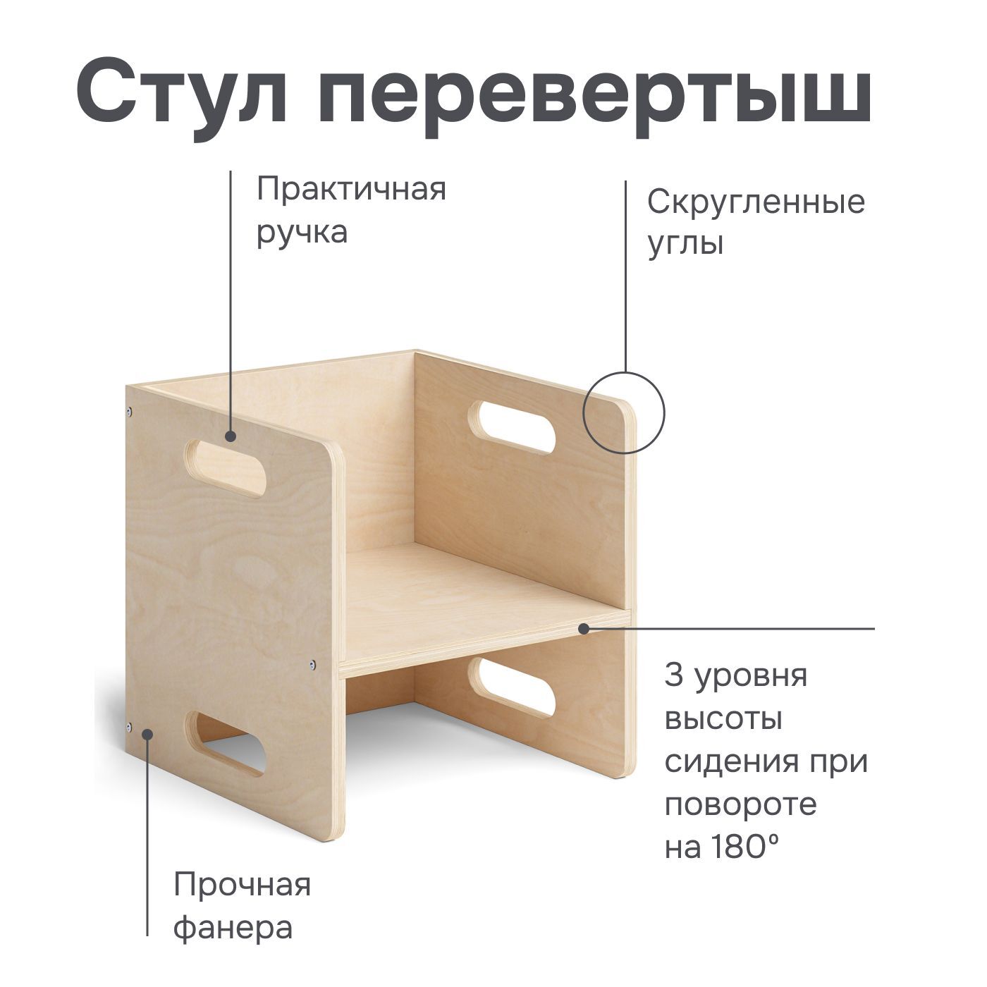 Детский стол перевертыш Чек: создайте мир в детской комнате, где удобство встречается со стилем! Гладко отшлифованная поверхность и безопасные сглаженные края устраняют риски травмирования и обеспечивают безопасность малышей. Растущий стул для детей покрыт натуральным прозрачным лаком, который защищает изделие от внешних воздействий и сохраняет природные свойства и нежный аромат дерева. Поверхность можно легко очистить от загрязнений. Сочетание компактных размеров (габариты стола перевертыша - 34х34х34 см) и наличие удобных ручек создают максимальный комфорт и практичность при его использовании, благодаря чему его можно легко переносить и передвигать. Детский стол изготовлен из прочной фанеры толщиной 15 мм, выдерживающей максимальную нагрузку до 30 кг. Детский стульчик можно вращать на 180? и регулировать высоту сидения - 14 см, 16 см, 35 см - благодаря чему можно отрегулировать высоту сидения под рост ребенка. Благодаря возможности установки в 3 положениях, этот столик может быть использован как детский стол, растущий стул для детей и даже скамья для обуви. Все это в одном компактном изделии! Также вы можете дополнительно приобрести больший вариант детского стола перевертыша, тем самым собрав стильный набор детский стол и стул. Этот растущий стульчик для детей идеально подойдет для использования дома, на даче или в загородном доме, продолжая радовать своим функционалом и стилем на протяжении многих лет. Подходит для разных стилей интерьера - скандинавский, минимализм, детский, современный или эко-стиль, добавляя изысканности и уюта пространству. Стульчик поставляется в полусобранном виде с понятной инструкцией и комплектом фурнитуры, что облегчает процесс сборки. Сделайте стильный и полезный подарок для вашего малыша или близкого - этот детский стул Чек будет прекрасным дополнением к интерьеру комнаты и радостью для вашего ребенка!