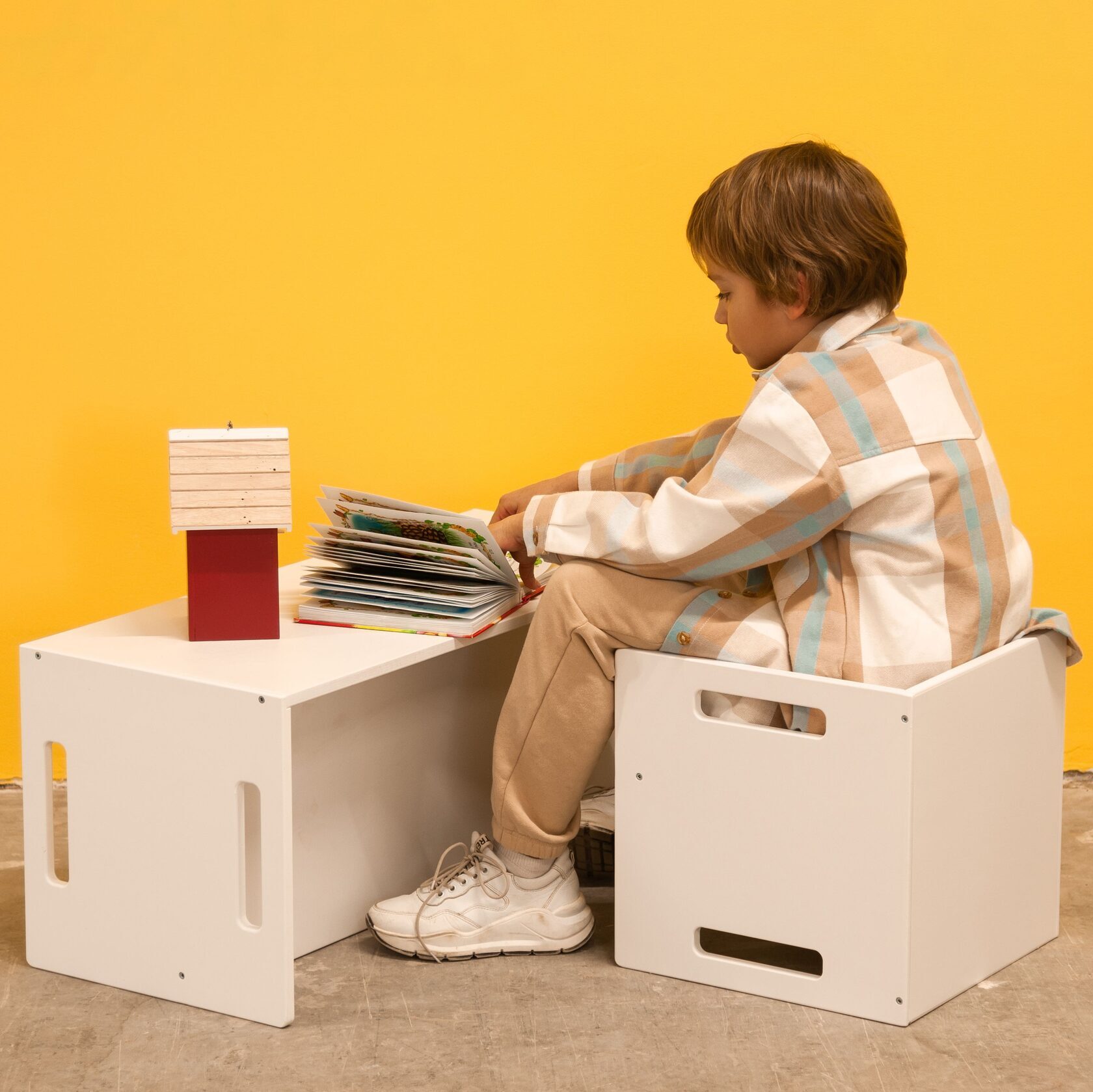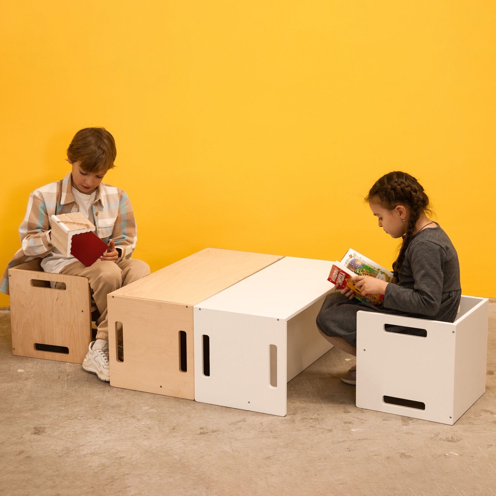 Детский стол перевертыш Чек: создайте мир в детской комнате, где удобство встречается со стилем! Гладко отшлифованная поверхность и безопасные сглаженные края устраняют риски травмирования и обеспечивают безопасность малышей. Растущий стул для детей покрыт натуральным белым воском, который защищает изделие от внешних воздействий и сохраняет природные свойства и нежный аромат дерева. Поверхность можно легко очистить от загрязнений. Сочетание компактных размеров (габариты стола перевертыша - 34х34х34 см) и наличие удобных ручек создают максимальный комфорт и практичность при его использовании, благодаря чему его можно легко переносить и передвигать. Детский стол изготовлен из прочной фанеры толщиной 15 мм, выдерживающей максимальную нагрузку до 30 кг. Детский стульчик можно вращать на 180? и регулировать высоту сидения - 14 см, 16 см, 35 см - благодаря чему можно отрегулировать высоту сидения под рост ребенка. Благодаря возможности установки в 3 положениях, этот столик может быть использован как детский стол, растущий стул для детей и даже скамья для обуви. Все это в одном компактном изделии! Также вы можете дополнительно приобрести больший вариант детского стола перевертыша, тем самым собрав стильный набор детский стол и стул. Этот растущий стульчик для детей идеально подойдет для использования дома, на даче или в загородном доме, продолжая радовать своим функционалом и стилем на протяжении многих лет. Подходит для разных стилей интерьера - скандинавский, минимализм, детский, современный или эко-стиль, добавляя изысканности и уюта пространству. Стульчик поставляется в полусобранном виде с понятной инструкцией и комплектом фурнитуры, что облегчает процесс сборки. Сделайте стильный и полезный подарок для вашего малыша или близкого - этот детский стул Чек будет прекрасным дополнением к интерьеру комнаты и радостью для вашего ребенка!