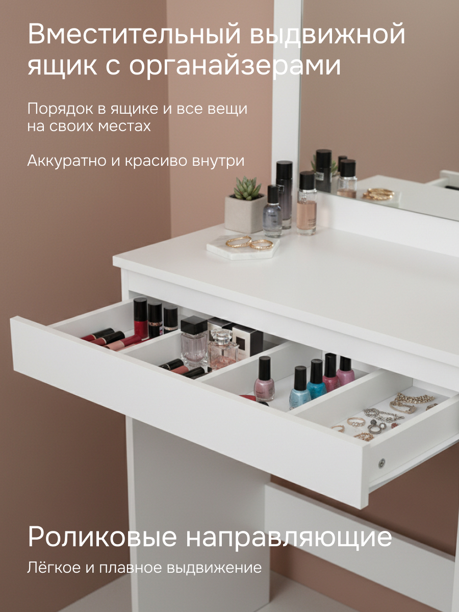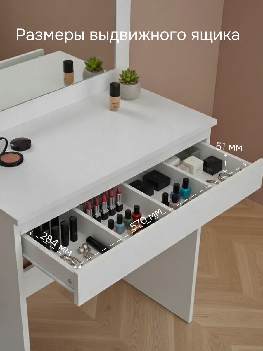 Мы уделяем особое внимание качеству материалов, поэтому вы можете быть уверены в надежности и долговечности этого туалетного столика. Стол изготовлен из экологически чистого ЛДСП 16 мм класса эмиссии E1 (безопасно даже для детей). Он подходит для любого стиля интерьера — от скандинавского до модерна. Перед тем как купить этот столик, подумайте о том, как он может изменить ваше пространство и добавить в него индивидуальности.