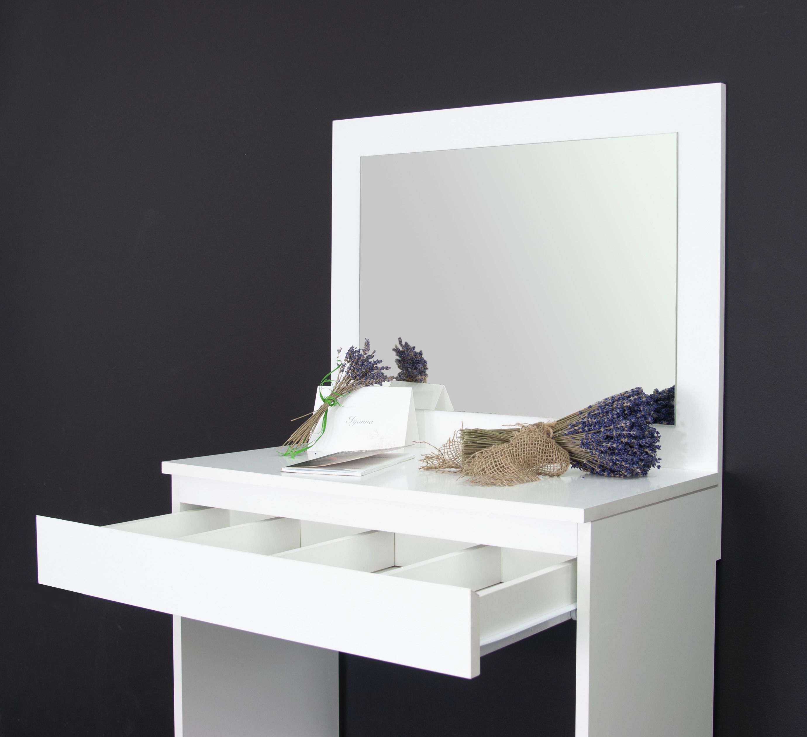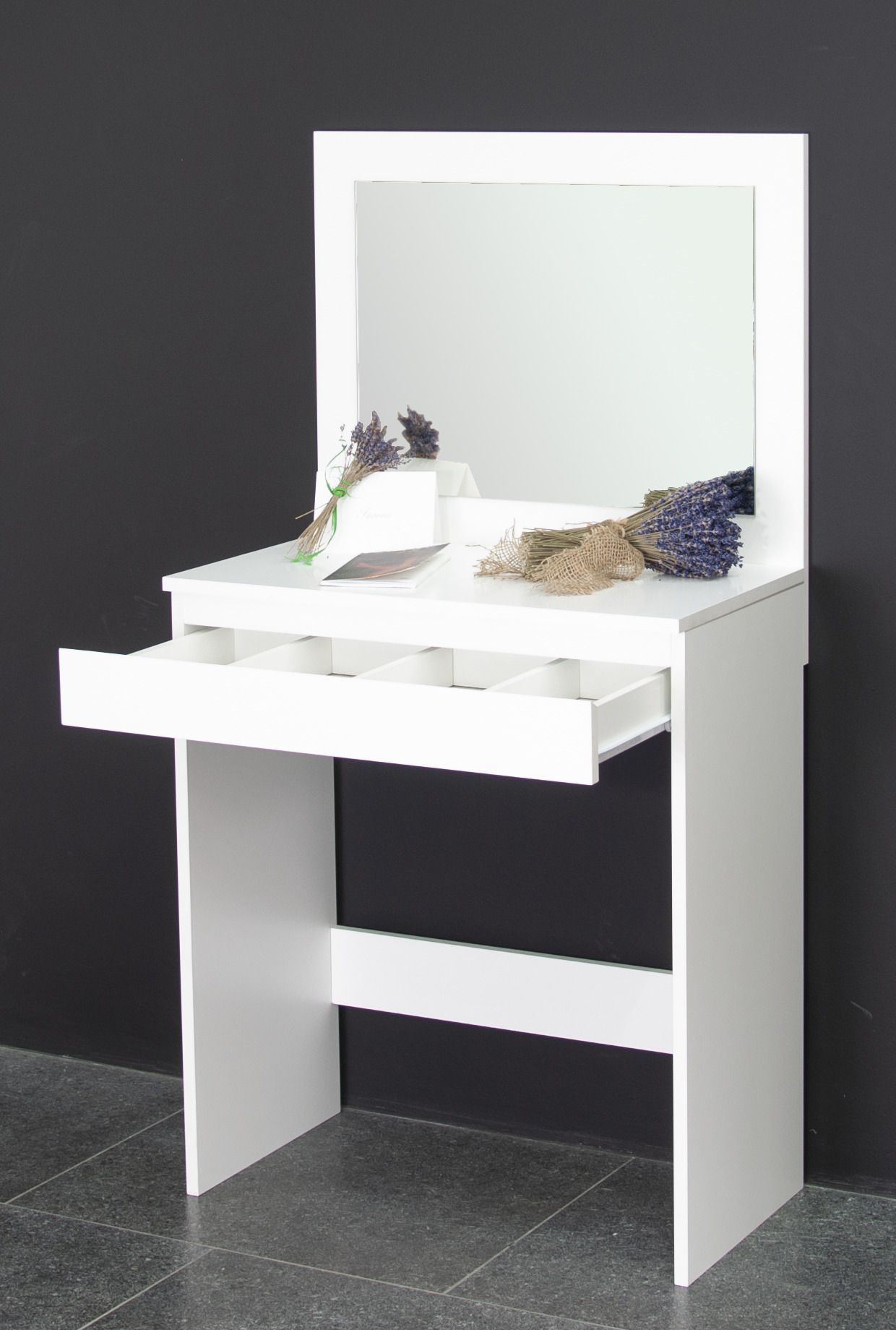 Туалетный столик с зеркалом и ящиком Марм — идеальное решение для создания уюта и комфорта в вашей спальне или ванной комнате. Этот стильный столик от белорусского производителя мебели "Диприз" подойдет для девочки-подростка, фотостудии, квартиры-студии, для визажистов. С его помощью вы сможете удобно хранить свои косметические принадлежности и аксессуары.