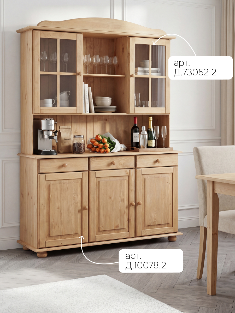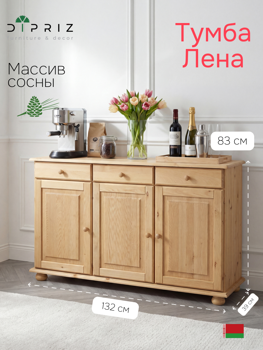 Тумба Лена в комбинации с витриной надстройкой представляет собой модульный буфет, который прекрасно подойдет как для кухни, так и для столовой. Тумбу можно приобрести отдельно и использовать ее в любой комнате, где необходимо упорядочить систему хранения. Тумба Лена выполнена из сосны от белорусского производителя "Диприз". Данная тумба органично впишется в интерьер любой кухни, станет незаменимым элементом мебели кухни, станет незаменимым элементом мебели для хранения посуды и других кухонных принадлежностей. Серия Лена представлена в 4-ех разных отделках - без отделки, лакированная, в белом воске и в сером воске с лакированной крышкой, и эвкалипт.
