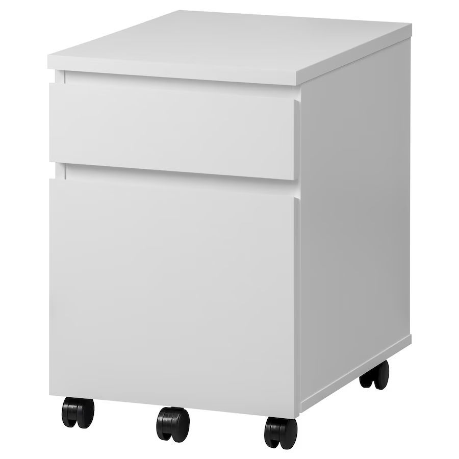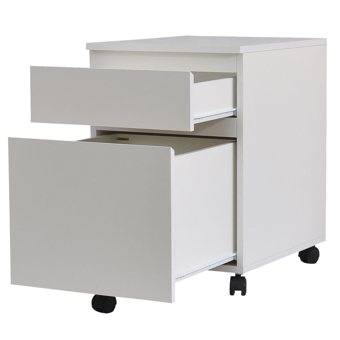 Белая тумба оснащена 2-мя выдвижными ящиками, которые легко вынимаются, что значительно упрощает уборку и они оснащены функцией фиксации. Мы разместили дополнительное колесо под ящиком в качестве дополнительной опоры, благодаря которой увеличивается максимальная нагрузка. В ящике предусмотрены металлические пруты, для возможности вешать подвесные папки с документами.