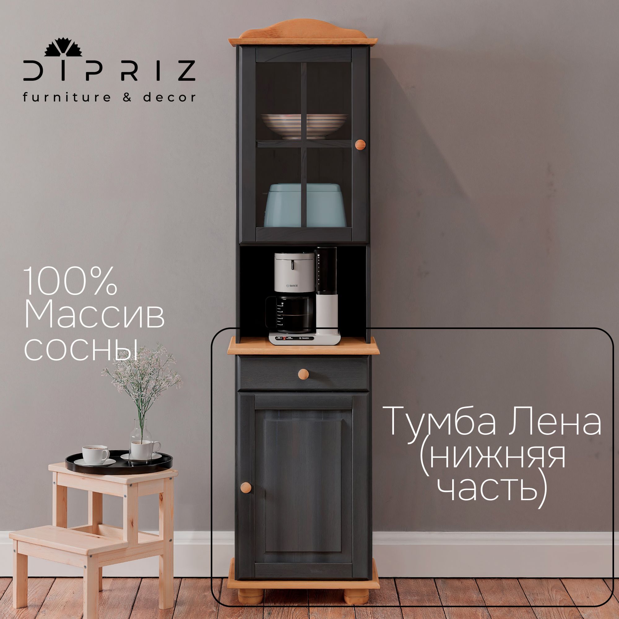 Тумба выполнена из натурального массива сосны белорусской компанией Диприз. Дополнена гладкой шлифовкой и покрыта натуральным серым воском. При производстве использовались только экологически чистые материалы и отделка, поэтому все полезные свойства хвойного дерева были сохранены. Вы сможете её использовать сразу после покупки, не беспокоясь о внешнем воздействии. Антик - натуральное покрытие бейцем и прозрачным лаком отдельных частей изделия.