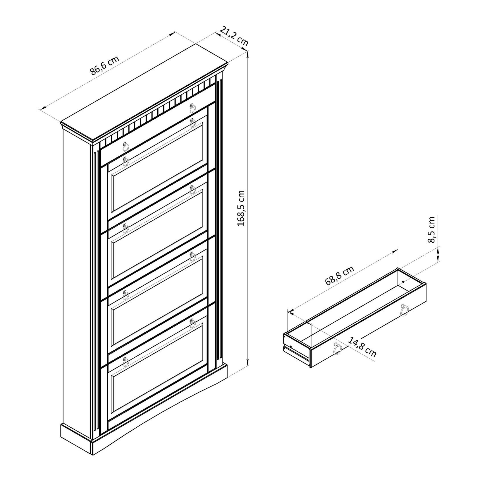 • Обувница по-настоящему прочная, что обеспечивается толщиной крышки и фасадов t=18 мм, фасада ящиков t=30 мм; толщина стенок, полика, стенок ящиков t=14 мм.