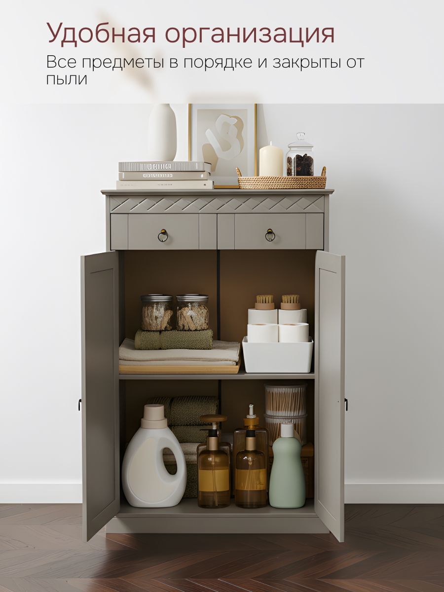 - Дизайн, который впечатляет Уникальные фрезеровки в классическом стиле превращают фасады в художественный элемент. Серый цвет универсален и легко сочетается с любой палитрой вашего интерьера, делая комод стильным акцентом.