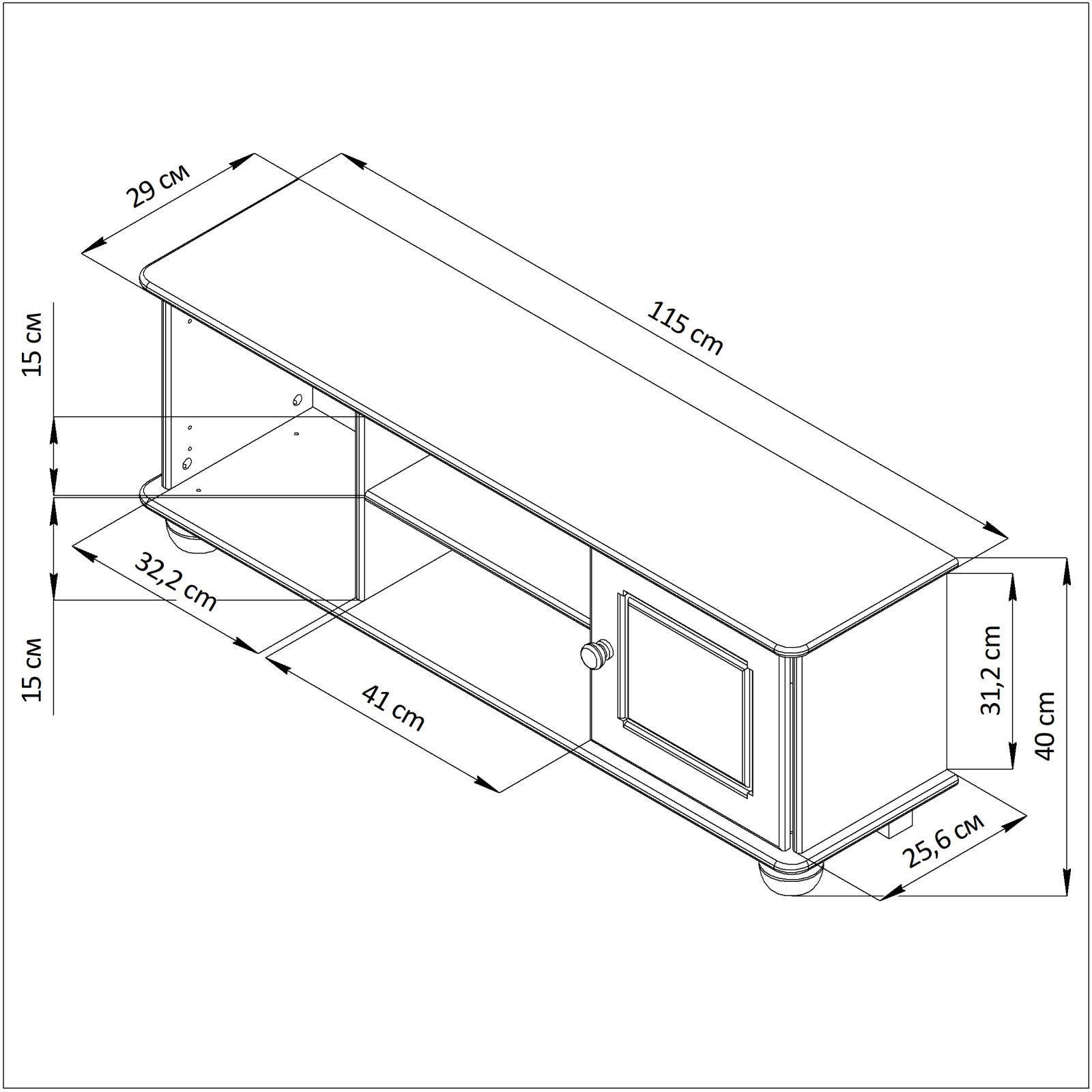 Благодаря своим размерам (Ширина х Глубина х Высота, см - 115х29х40 см) в тумбе под телевизор может поместиться достаточно много вещей. Конструкция тумбы на ножках включает 2 двери и нишу с полкой. На полках можно размещать различные проигрыватели и приставки, а в пространстве за дверцами удобно хранить диски и другую аппаратуру для телевизора. Задняя стенка тумбы имеет специальные вырезы для кабелей и проводки, что позволит их сделать невидимыми. А благодаря ножкам высотой 8 см, этот предмет мебели очень прост в уходе и способствует легкой уборке помещения.
