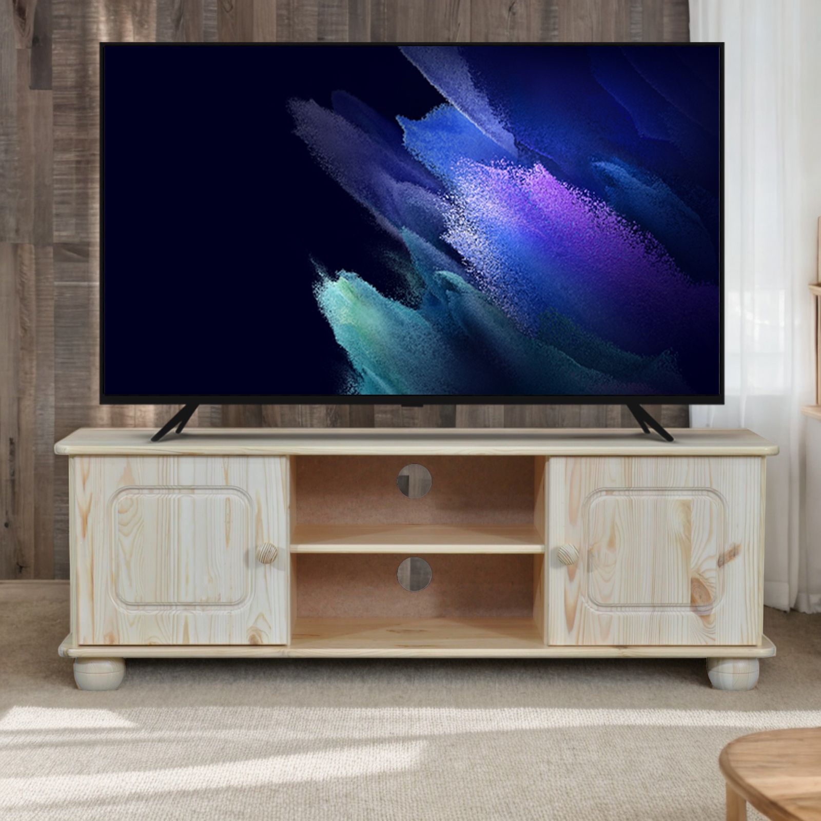 Благородный бежевый вид tv тумбы и тонкий, едва уловимый, запах сосны создадут ощущения уюта и комфорта, а также добавят чистоты и свежести окружающей обстановке. Изделие выглядит стильно и современно. Его классический дизайн легко может вписаться в любой интерьер квартиры, загородного дома, дачи, гостиницы или хостела.